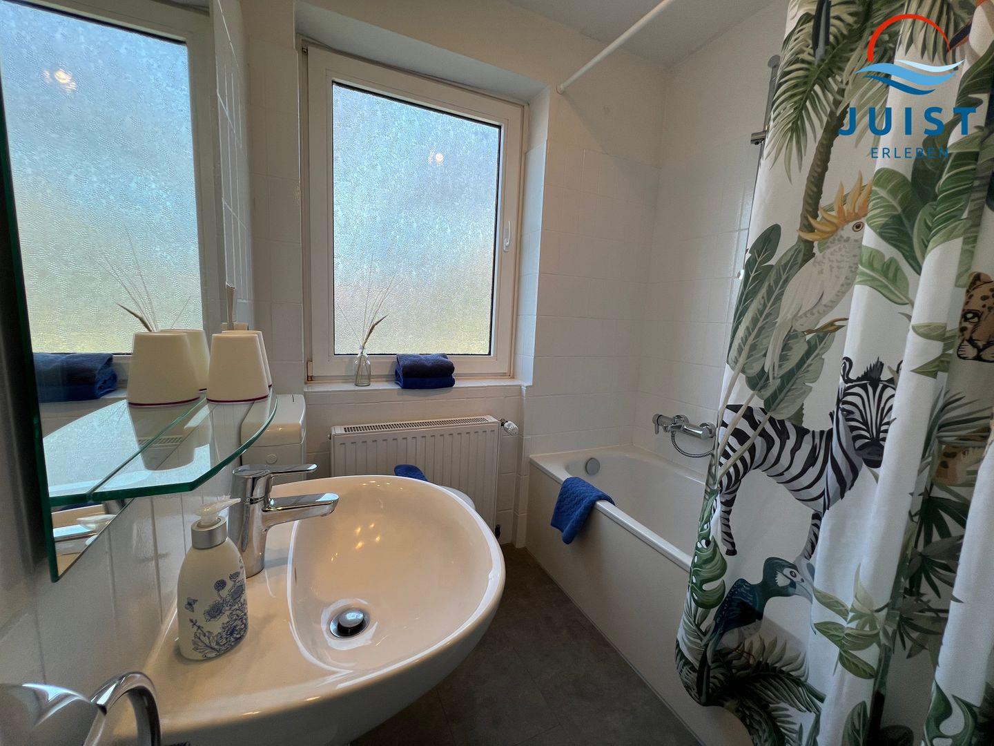 Das Badezimmer mit Fenster ist mit einer Dusch-Badewannen Kombination ausgestattet.