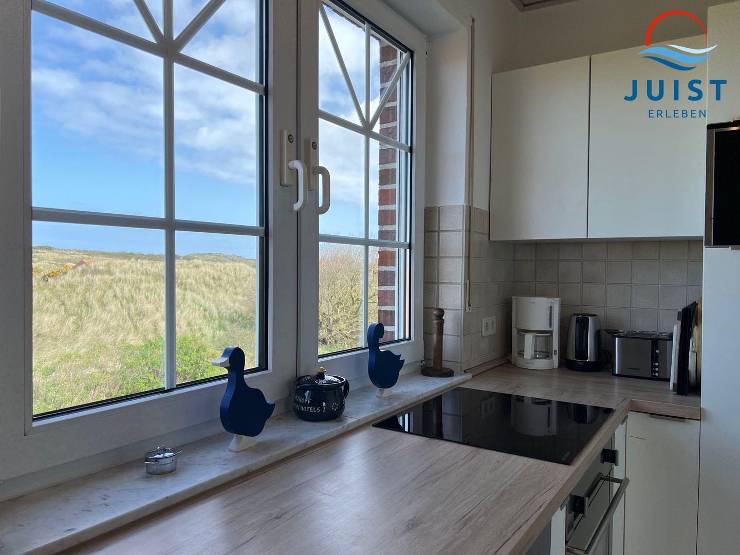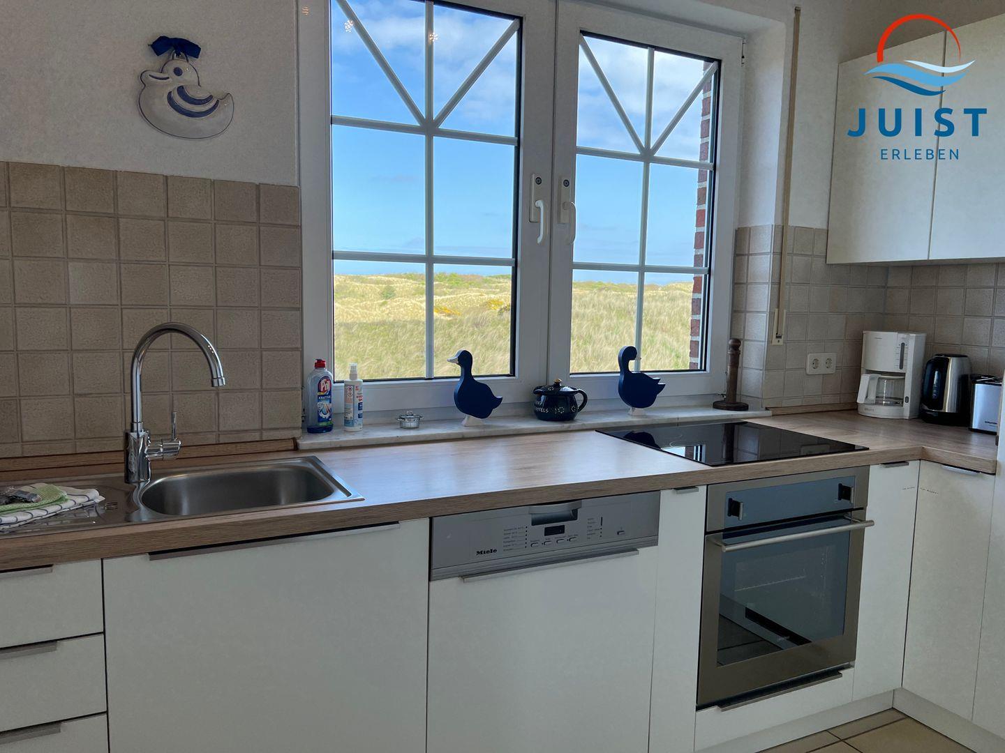 Die moderne Einbauküche verfügt u.a. über einen 4-Platten Herd sowie Backofen, Geschirrspüler, Kühlschrank, Mikrowelle, Kaffeemaschine, Wasserkocher und Toaster - so lassen sich mit tollem Blick über die Dünen auch im Urlaub schnell und einfach Gerichte zubereiten.