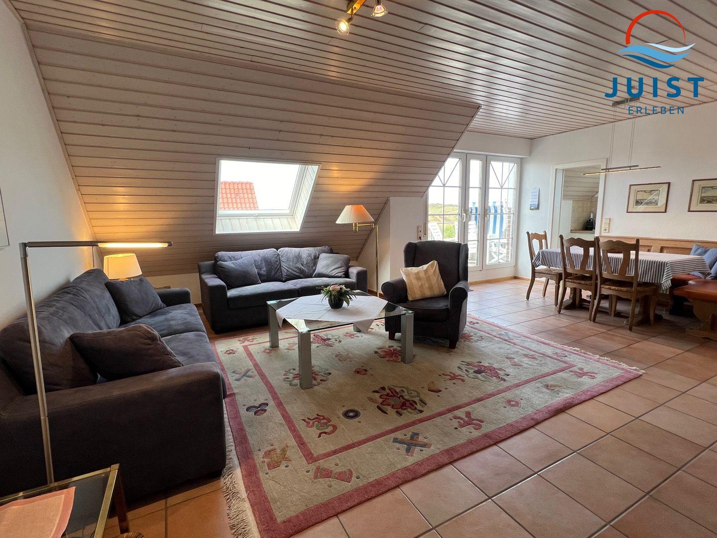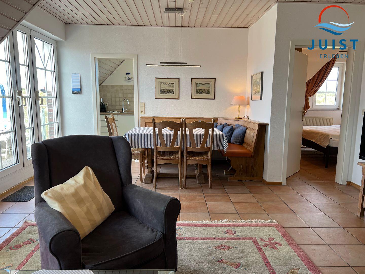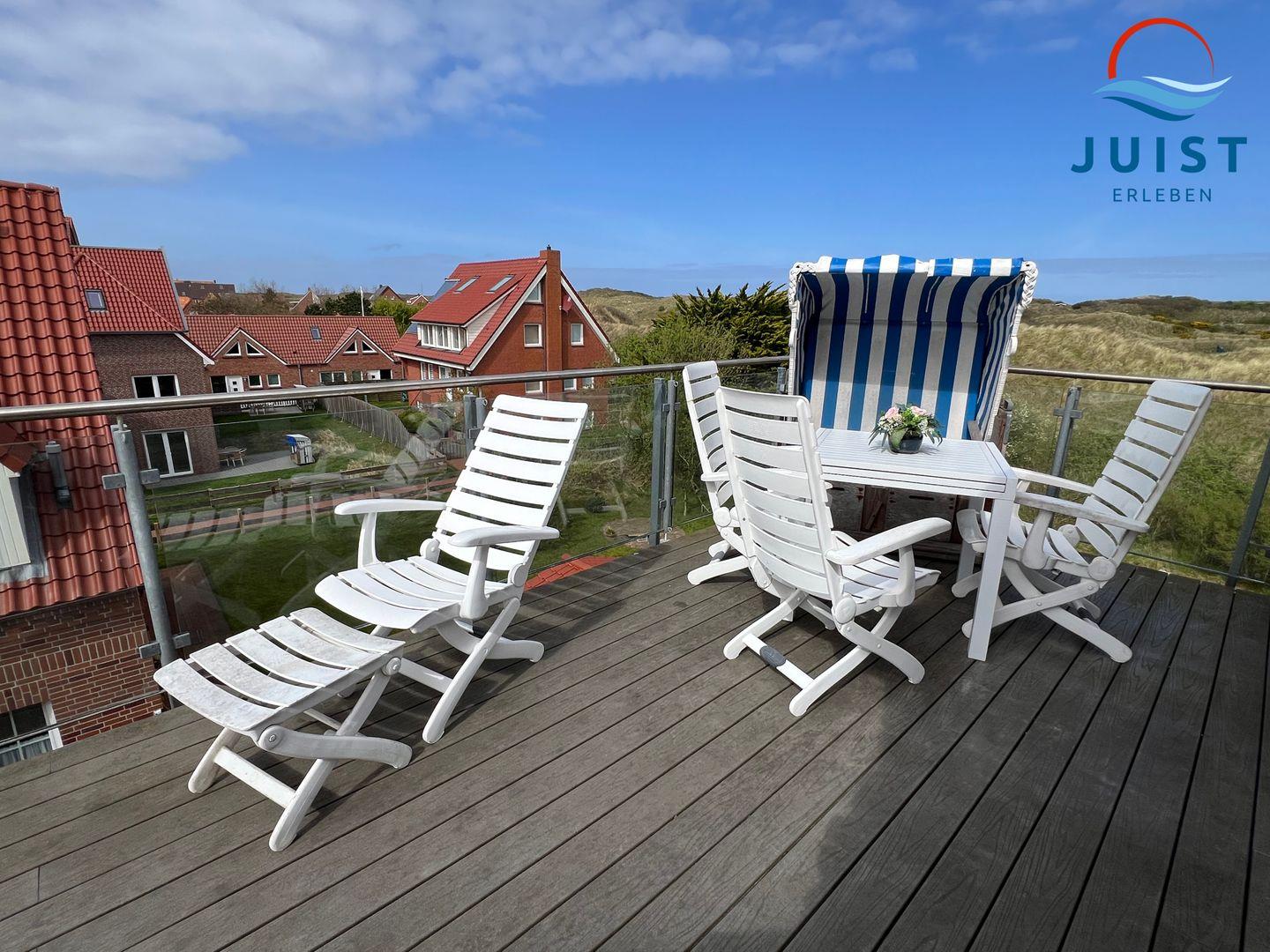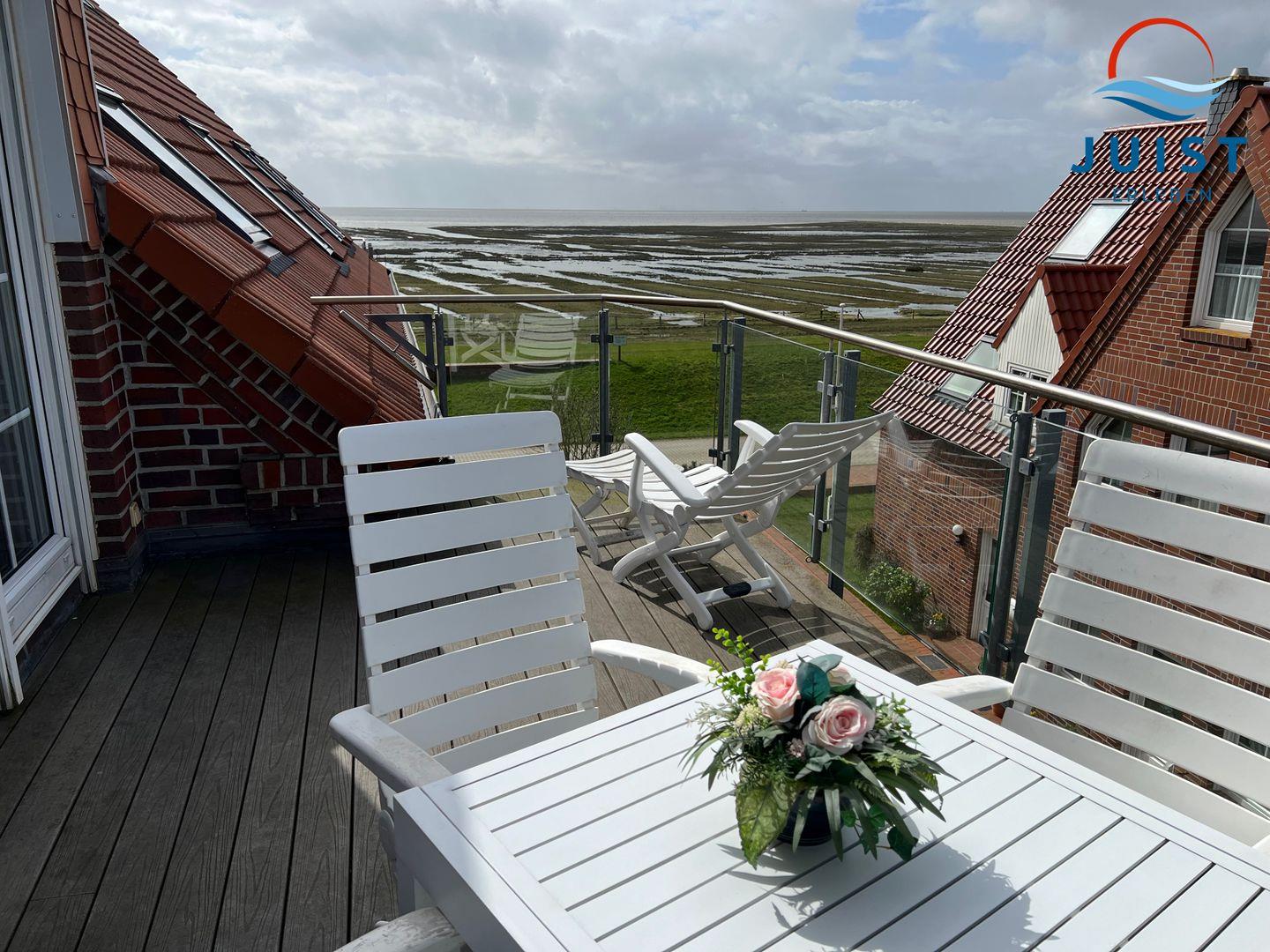 Vom Wohnzimmer aus gelangen Sie auf den traumhaft schönen großen Balkon nach Südwesten ausgerichtet. Hier können Sie vom Strandkorb aus den Blick in die Dünen und aufs Wattenmeer genießen.