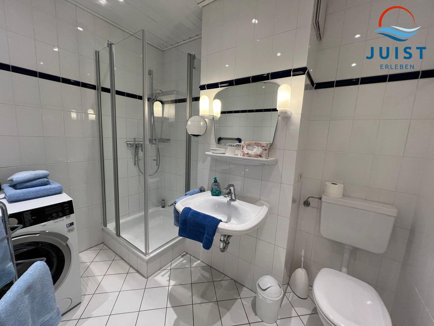 Das Badezimmer verfügt über eine Dusche und eine Waschmaschine.