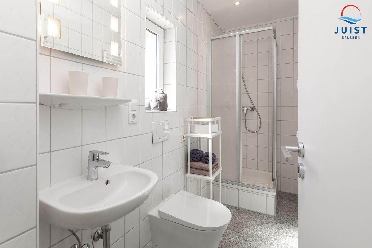 Das Badezimmer verfügt über eine Dusche, um sich nach einem Tag an der frischen Nordseeluft zu erfrischen.