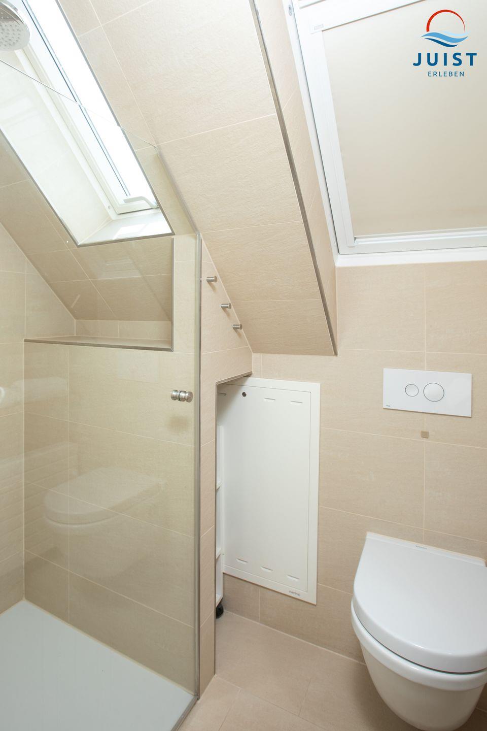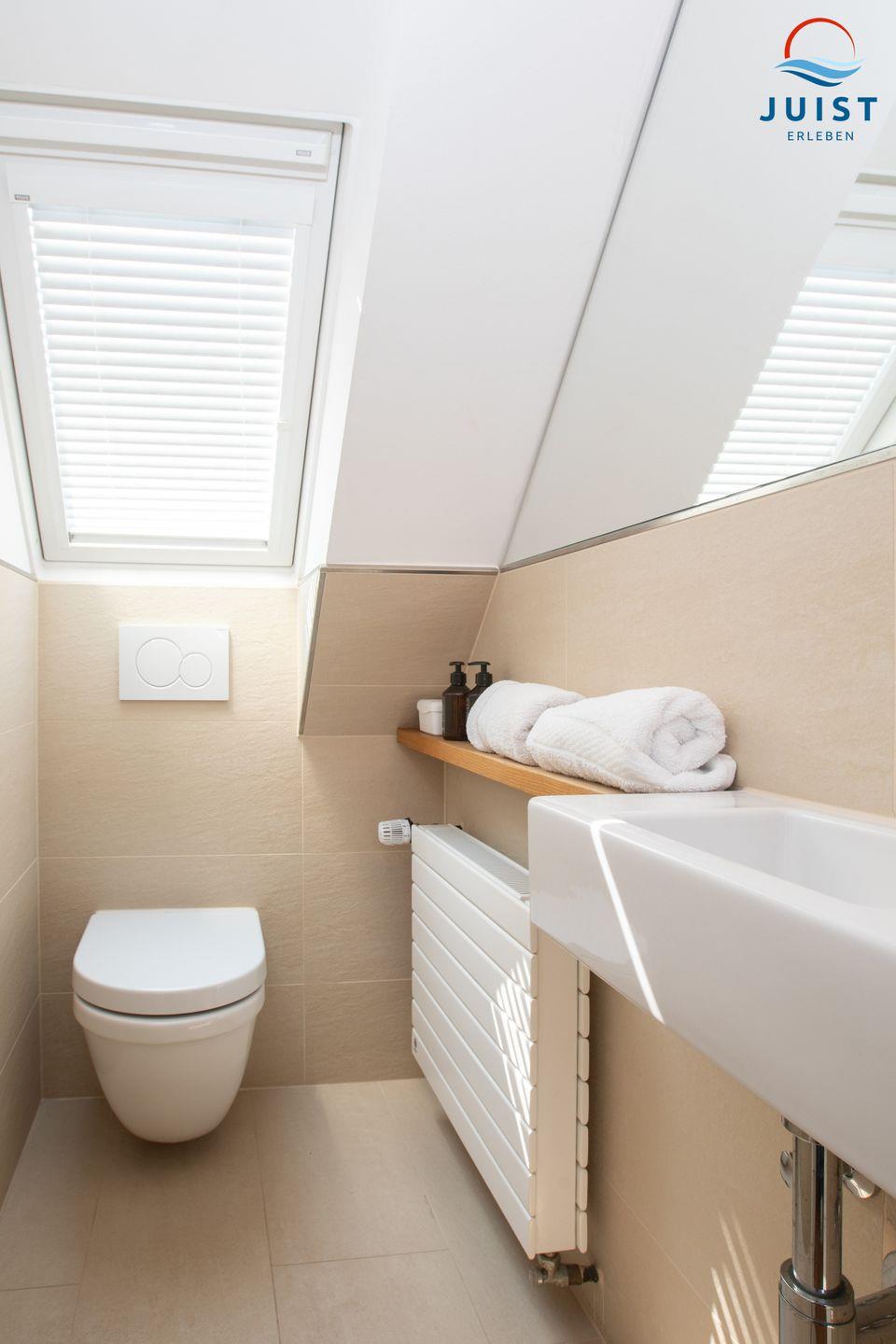 Das Badezimmer mit Fenster verfügt über eine Dusche und Toilette. Eine weitere Toilette befindet sich separat in einem Gäste-WC.