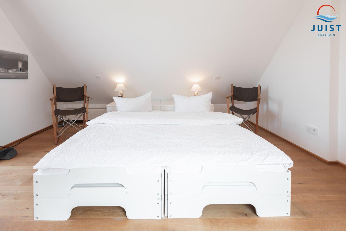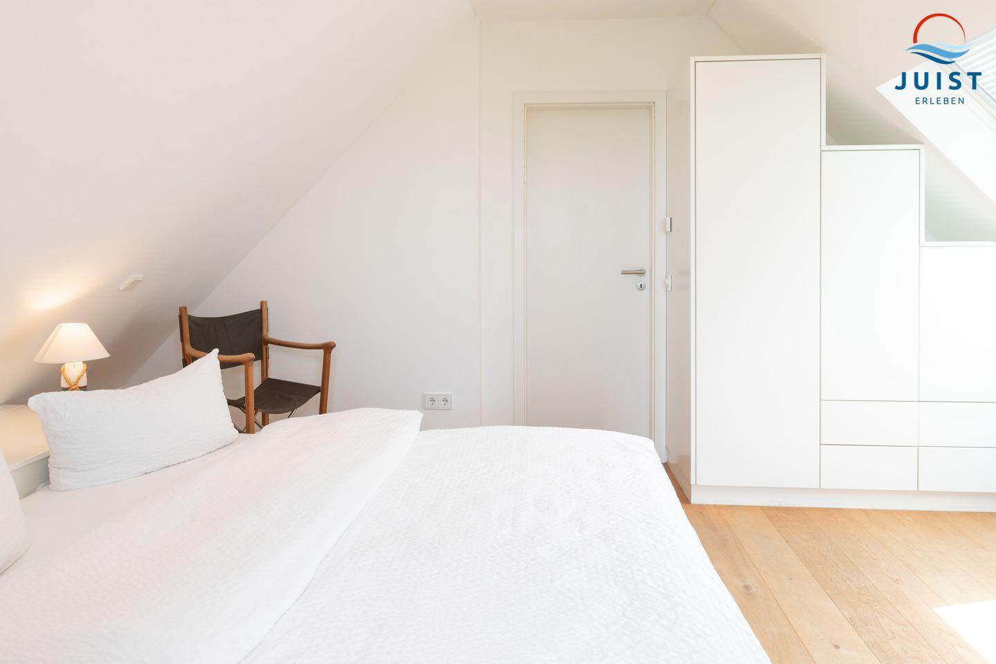 Das Schlafzimmer ist mit einem bequemen Doppelbett ausgestattet und bietet mit seiner großen Fensterfront und einem weiteren Balkon einen wunderschönen Blick in die Dünenlandschaft.