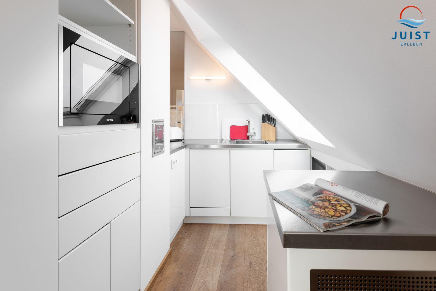 Die moderne Einbauküche verfügt über einen 4-Platten-Herd, Backofen, Geschirrspüler, Kühlschrank, Mikrowelle, Kaffeemaschine, Wasserkocher und Toaster, sodass sich auch im Urlaub schnell und einfach Gerichte zubereiten lassen.