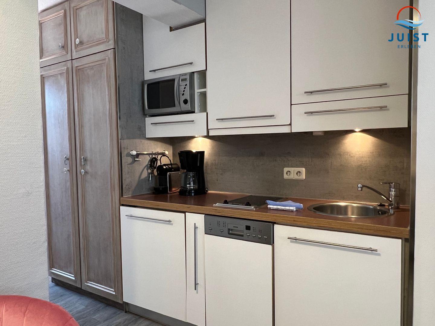 Die Küche ist so ausgestattet, dass eine bequeme Selbstverpflegung möglich ist, darunter ein 2-Platten-Herd, Mikrowelle, Spülmaschine, Kaffeemaschine, Wasserkocher und Toaster. Ein Essplatz für 4 Personen lädt zu gemütlichen Mahlzeiten ein.