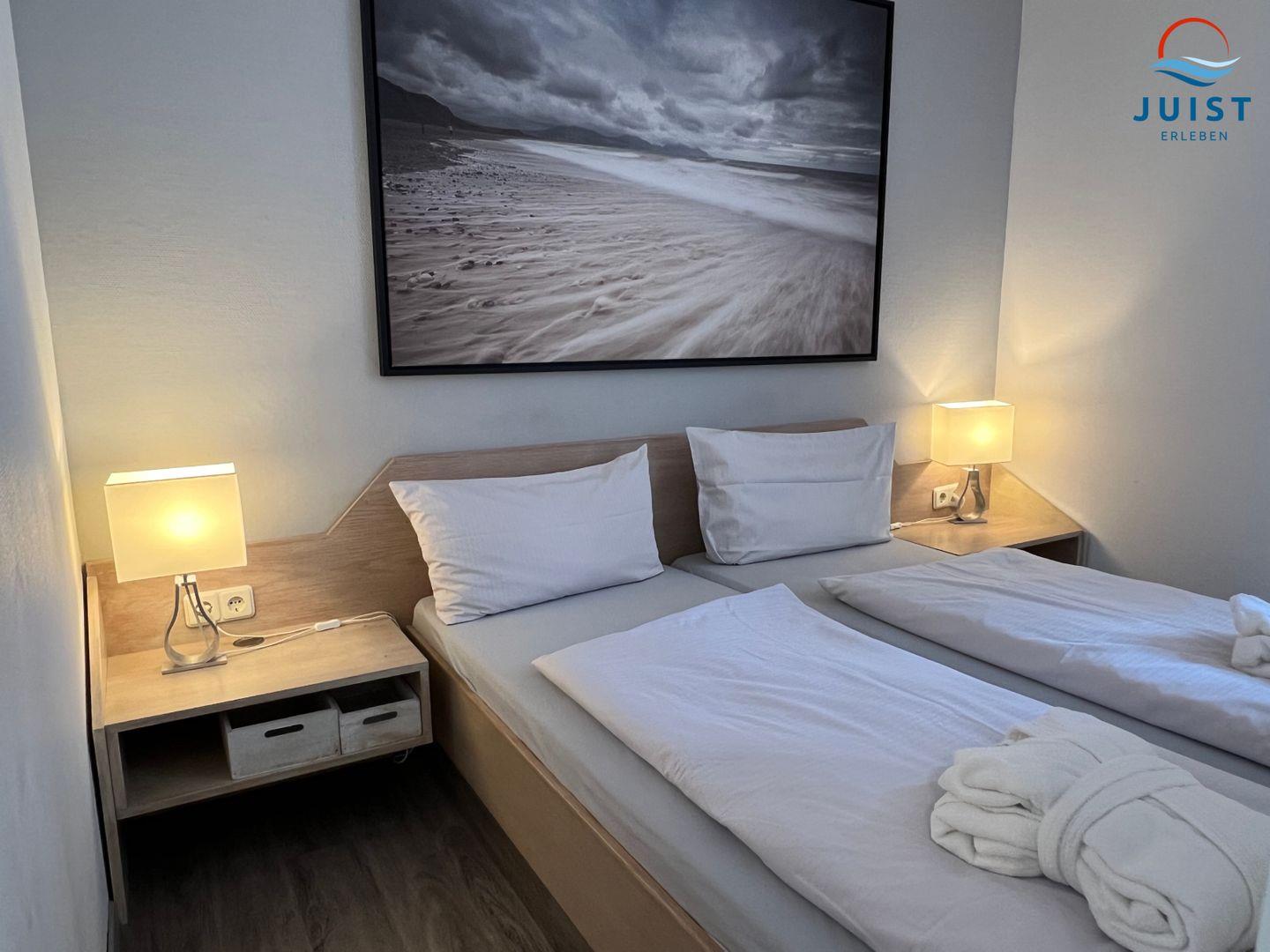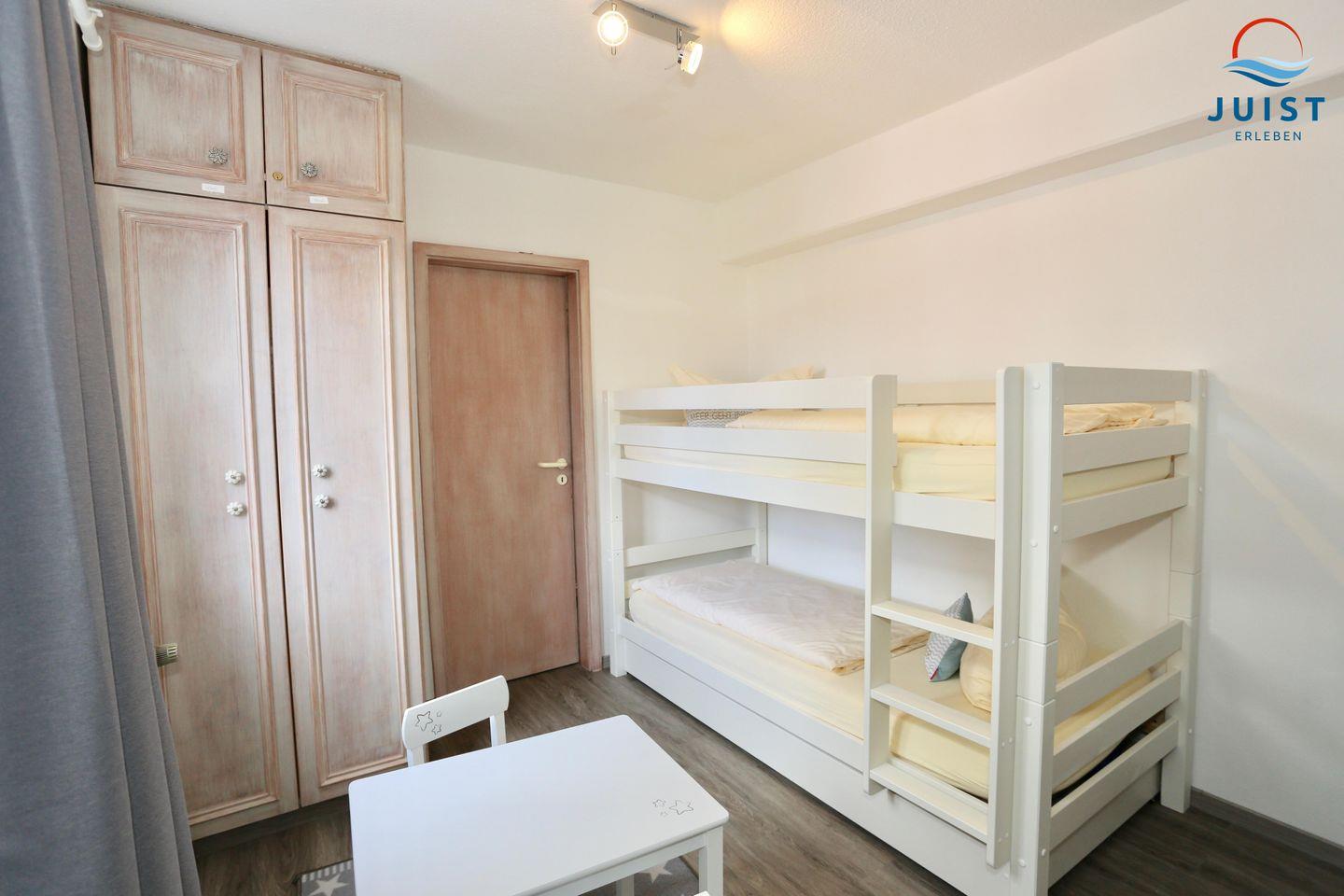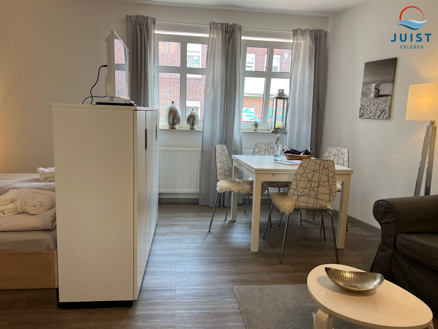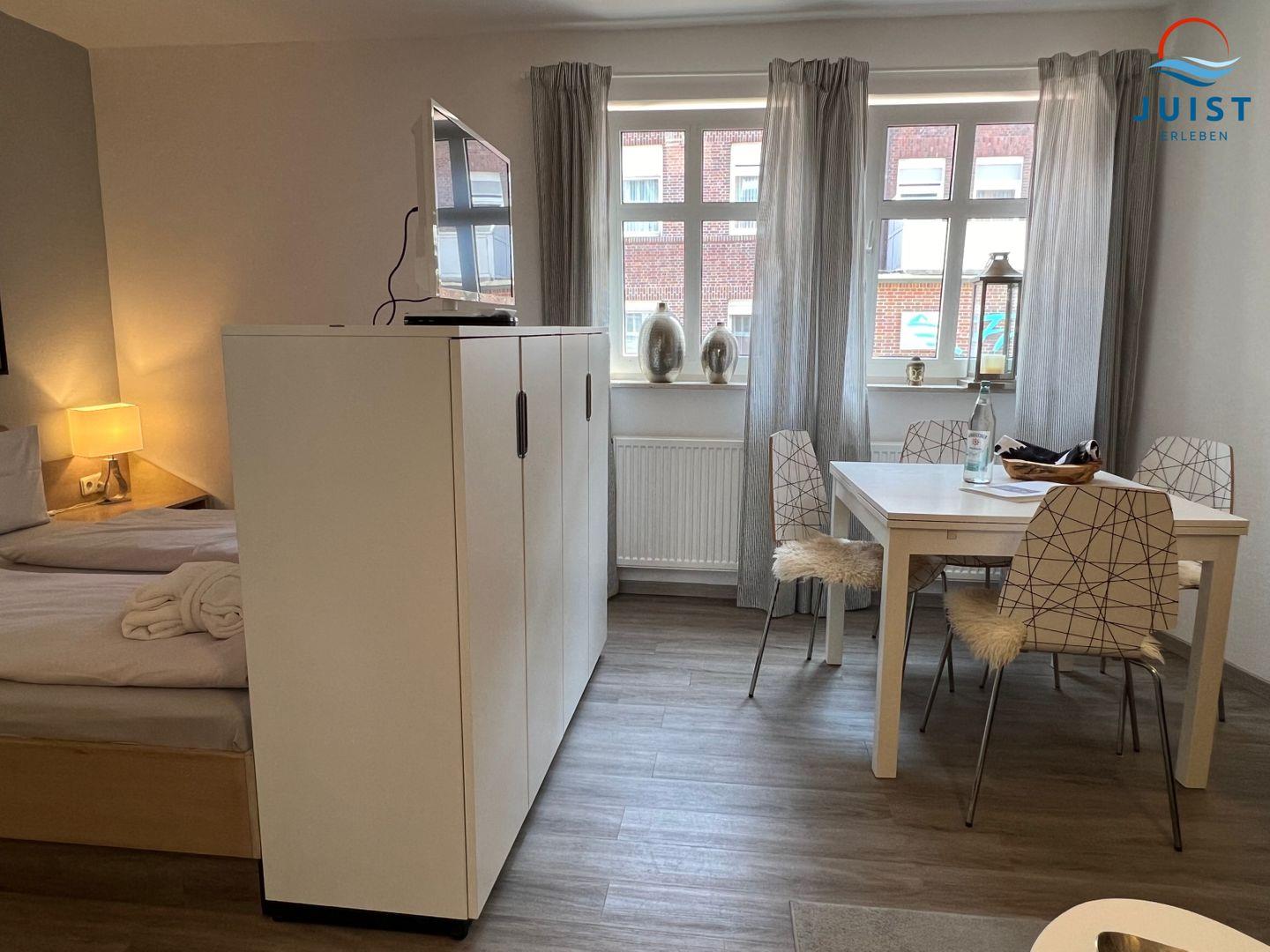 Die Wohnung besteht aus einem Wohn- / Esszimmer mit einem optisch abgetrennten Schlafbereich und einem separaten Schlafzimmer mit Etagenbett für 2 Personen. Das feststehende Doppelbett ist durch eine offene Schrankwand vom übrigen Wohnzimmer abgetrennt.