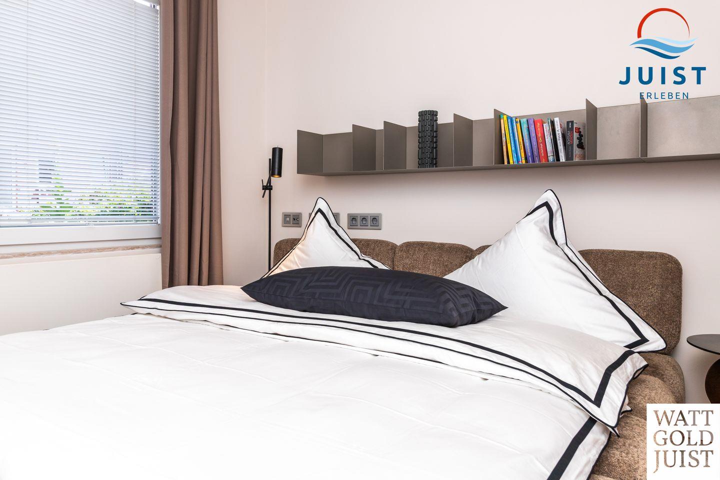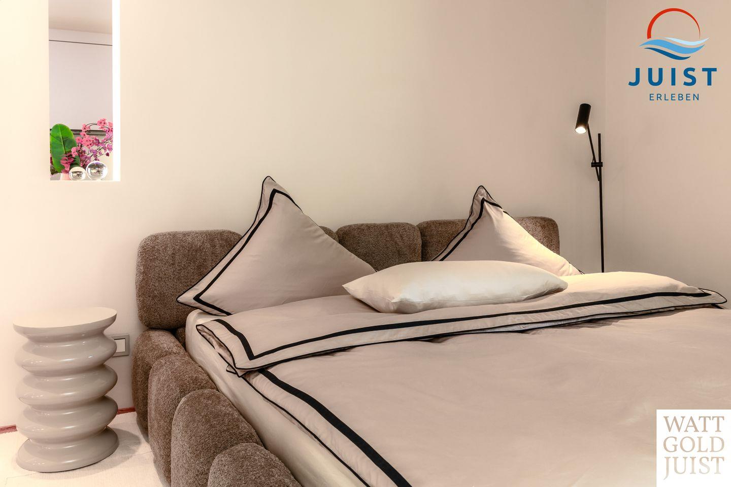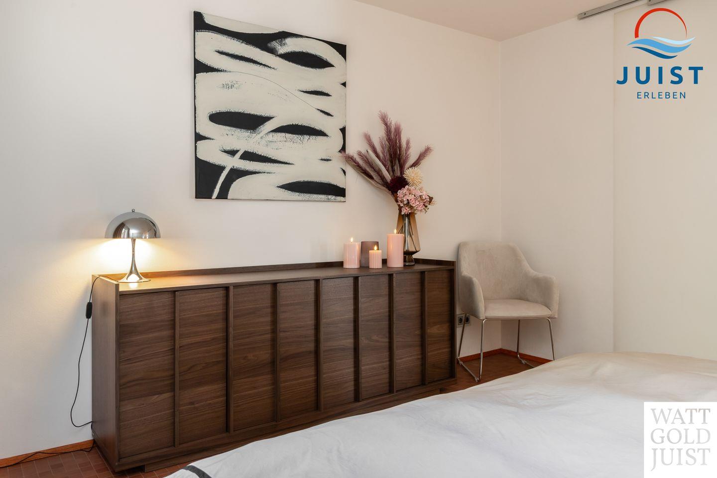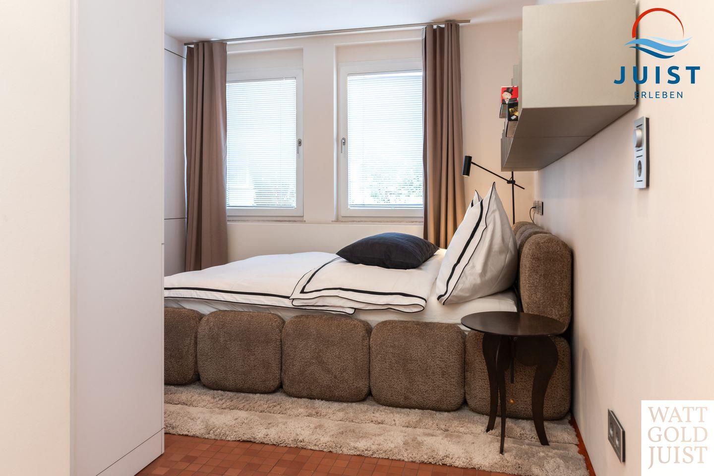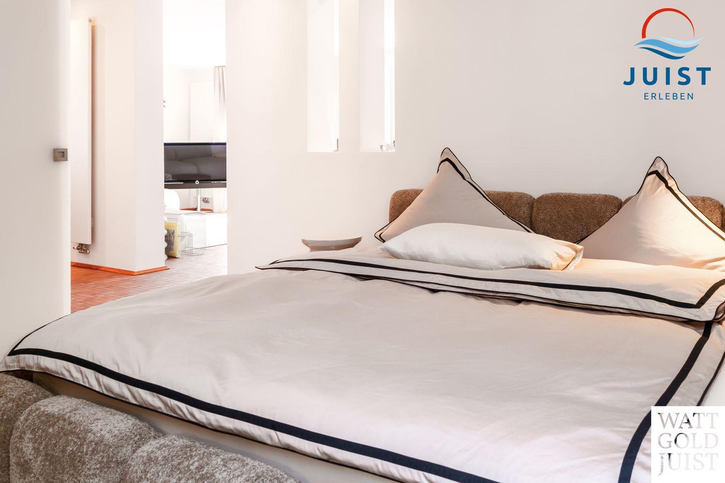 Zwei geräumige Schlafzimmer bieten bis zu vier Gästen Platz zum Träumen und Entspannen. Ausgestattet mit hochwertigen Premiummatratzen und erstklassigen Lattenrosten (Bettenmaße: 2,00 x 2,00 m bzw. 2,00 x 1,80 m), genießen Sie hier unvergleichlichen Komfort und den legendären „Juist-Tiefschlaf“.