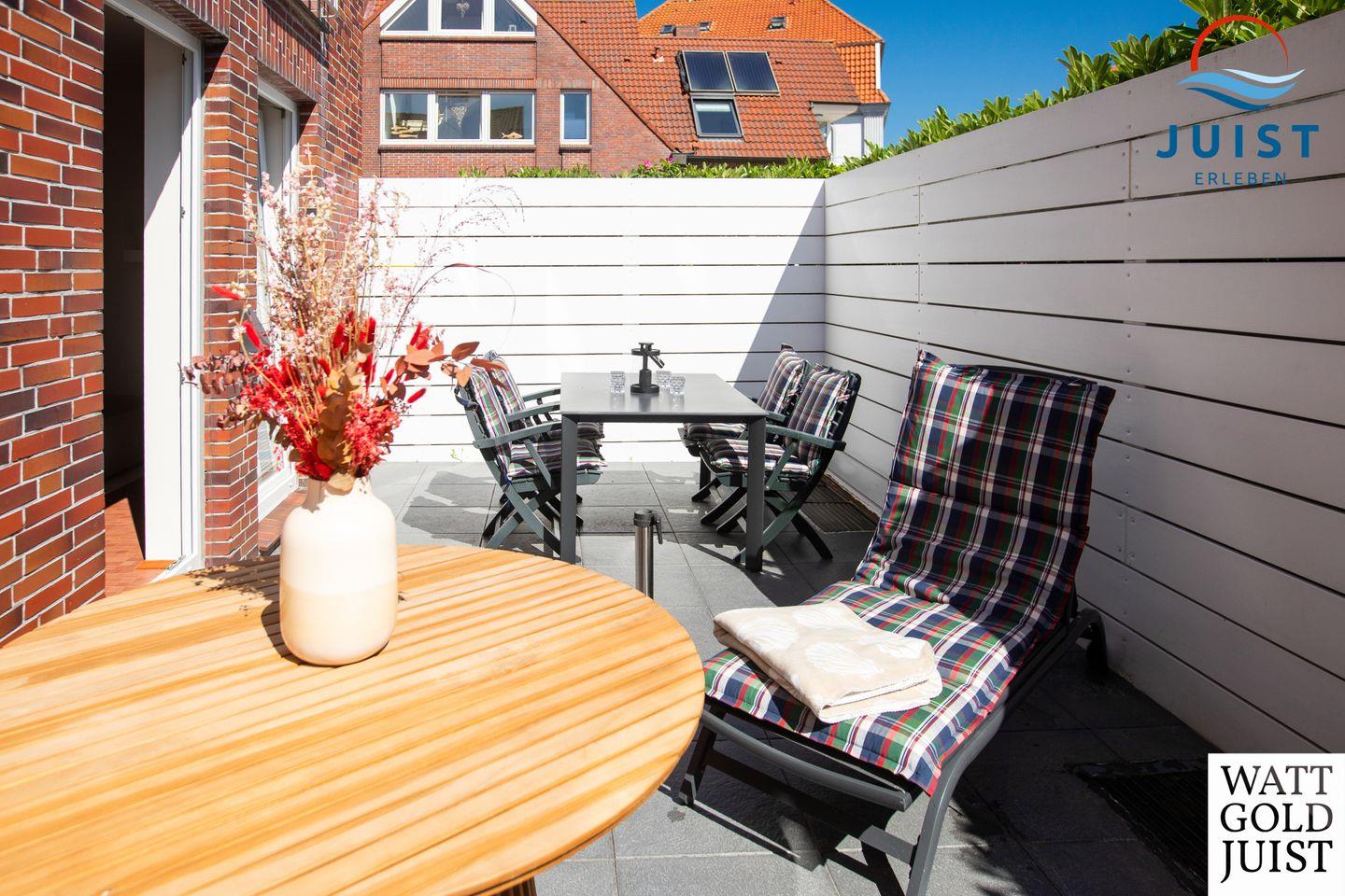 Bodentiefe Fenster öffnen den Blick auf die sonnige Südterrasse – ein Ort der Muße, perfekt für Frühstück im Freien oder entspannte Sonnenbäder auf den komfortablen Liegen, geschützt vor neugierigen Blicken.