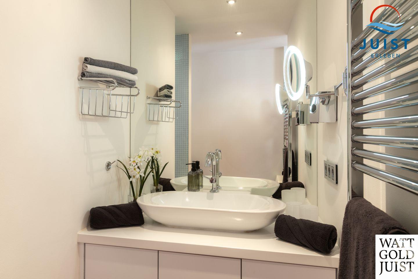 Das moderne Bad begeistert mit einer großzügigen, bodengleichen Dusche, stilvollem Interieur und viel Raum für Ihre persönliche Beautyroutine. Ergänzend steht Ihnen ein separater Hauswirtschaftsraum mit Waschmaschine, Trockner und zusätzlichem Stauraum zur Verfügung.