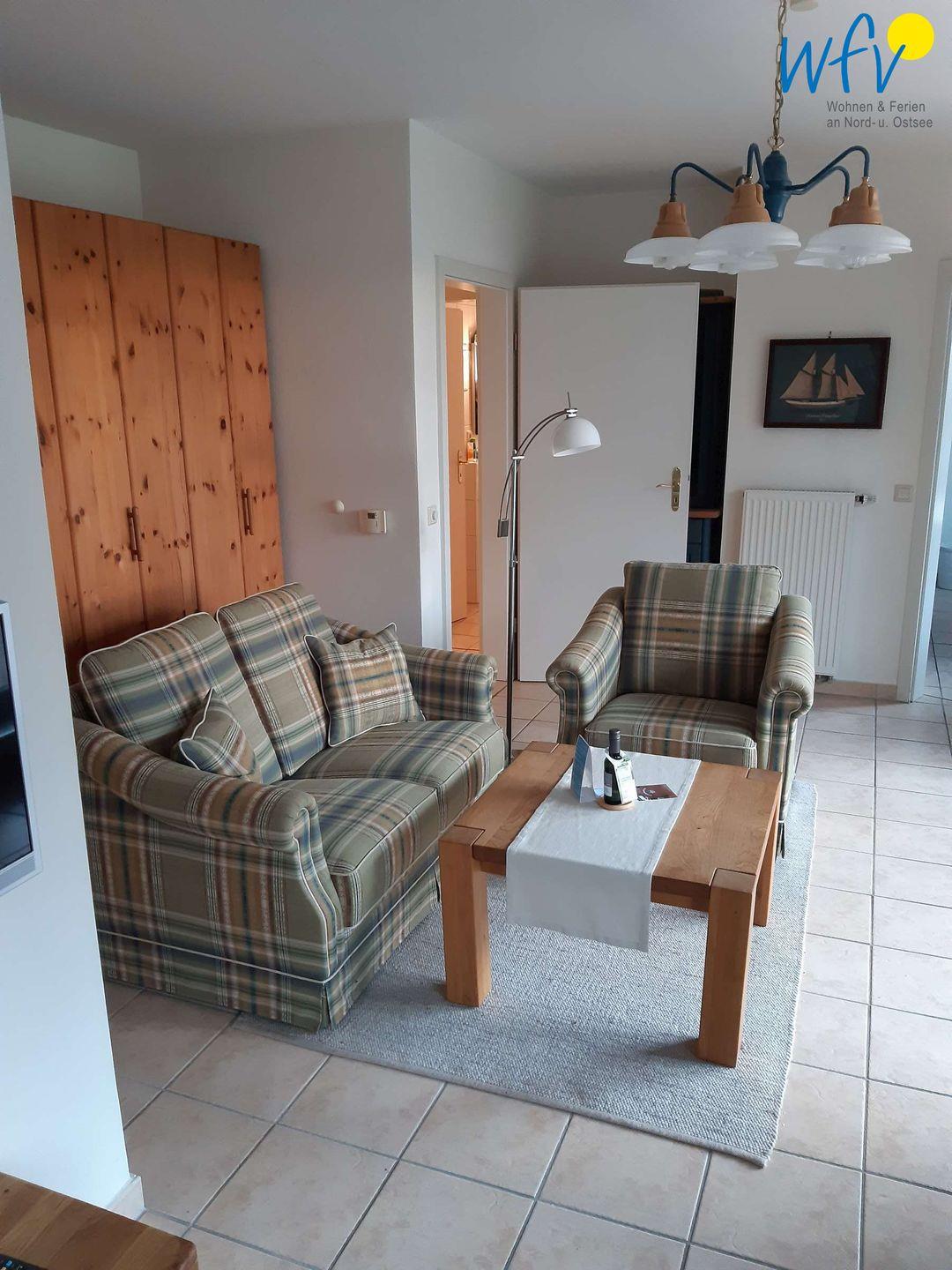 Auch der großzügige helle Wohnraum mit bequemen Sitzgelegenheiten, Fernseher (Kabel-TV) und CD-Player lädt zum Entspannen ein. So können Sie gemeinsam gemütliche Abende verbringen.