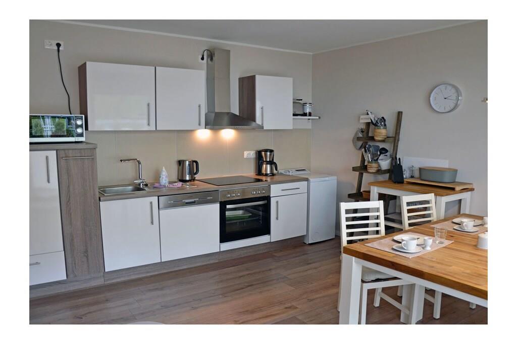 Parterre: großzügiger Wohn- Essbereich, gemütliche Couchlandschaft, TV/ Sat (Smart-TV Flatscreen), Radio/CD, Internet (WLAN), Bücher und Gesellschaftsspiele für gemütliche Abende, Fliegenschutzgitter im Wohnzimmer und in den Schlafräumen, offene komplett ausgestattete Einbauküche mit hochwertigen Geräten, Filter-und Kapselkaffeemaschine (Tchibo Cafissimo pure+) 4- Plattenherd (Ceranfeld), Backofen, Kühlschrank mit kleinem Gefrierfach, Geschirrspüler, Mikrowelle und diversen Elektrogeräten, Waschmaschine in der Küche vorhanden, großes Bad mit ebenerdiger Dusche und WC 1. Schlafzimmer mit Doppelbett (2 Matratzen je 90x200), TV/Sat (Flatscreen) und Kleiderschrank, 2. Schlafzimmer mit einem Doppelbett (zwei Einzelbetten mit je einer Matratze 90x200) und Kleiderschrank Außenbereich: große Terrasse (20 m²) mit Strandkorb, Tisch und Gartenstühle, Sonnenschirm vorhanden, Grillmöglichkeit besteht (Gemeinschaftsgrill)