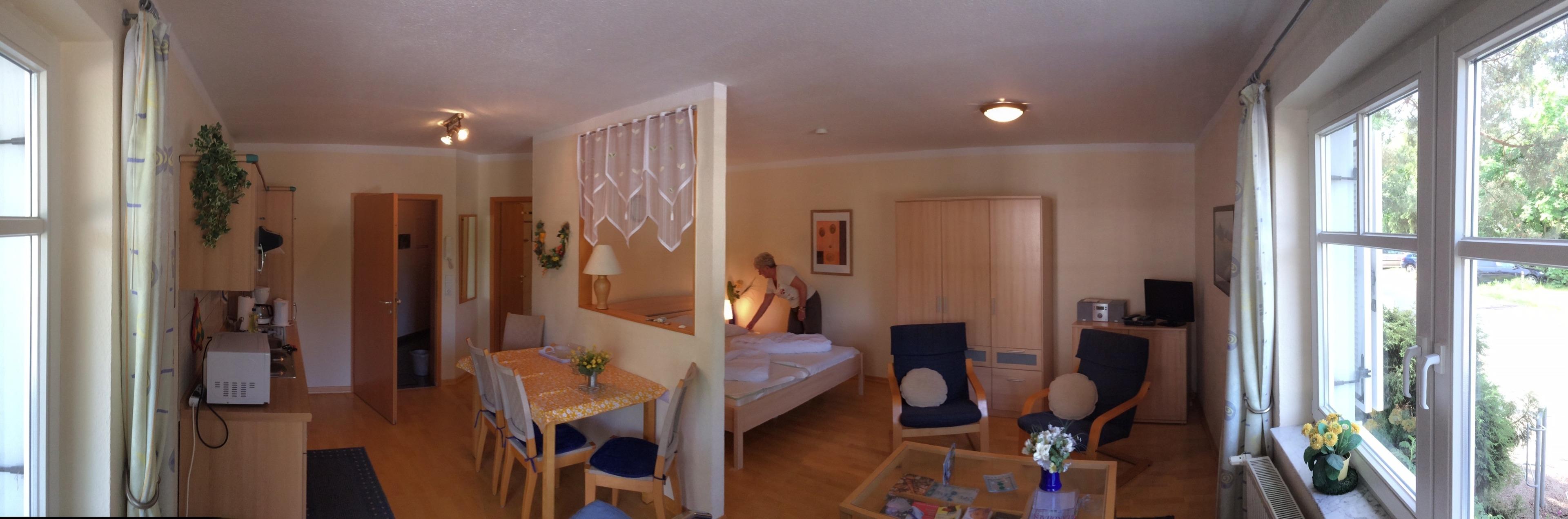 Es stehen Ihnen im Studio Apartment ein Wohnzimmer mit Küchenzeile , mit Doppelbett, und eine Schlafcouch für 2 Personen zur Verfügung. Ein Badezimmer mit Dusche/WC und Spiegelschrank und Fön.