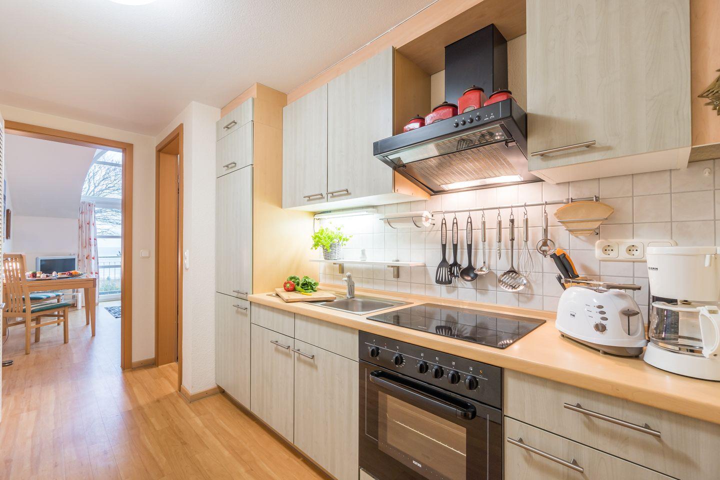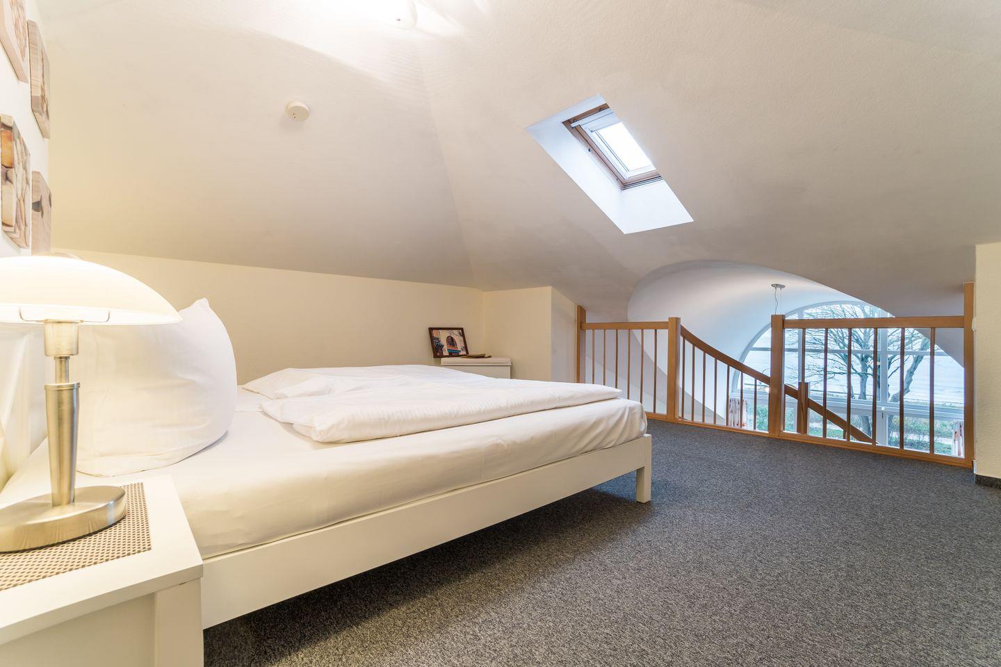 Auf 40?m² bietet die elegante Ferienwohnung „Strandkorb“ ein offenes Raumkonzept mit viel Komfort und einem fantastischen Meerblick. Lassen Sie einen erlebnisreichen Urlaubstag stilvoll auf dem möblierten Balkon ausklingen und genießen Sie den Blick auf die strahlende Ostsee. Im offenen Schlafbereich auf der Galerie erwartet Sie ein gemütliches Doppelbett unter einer charakteristischen Dachschräge mit großem Dachfenster, die dem Raum eine besonders behagliche Atmosphäre verleiht. Bitte berücksichtigen Sie, dass die Stehhöhe hier bauartbedingt nicht überall voll gegeben ist. Die gut ausgestattete Küche und ein kostenloser Parkplatz direkt am Haus runden das Angebot ab.