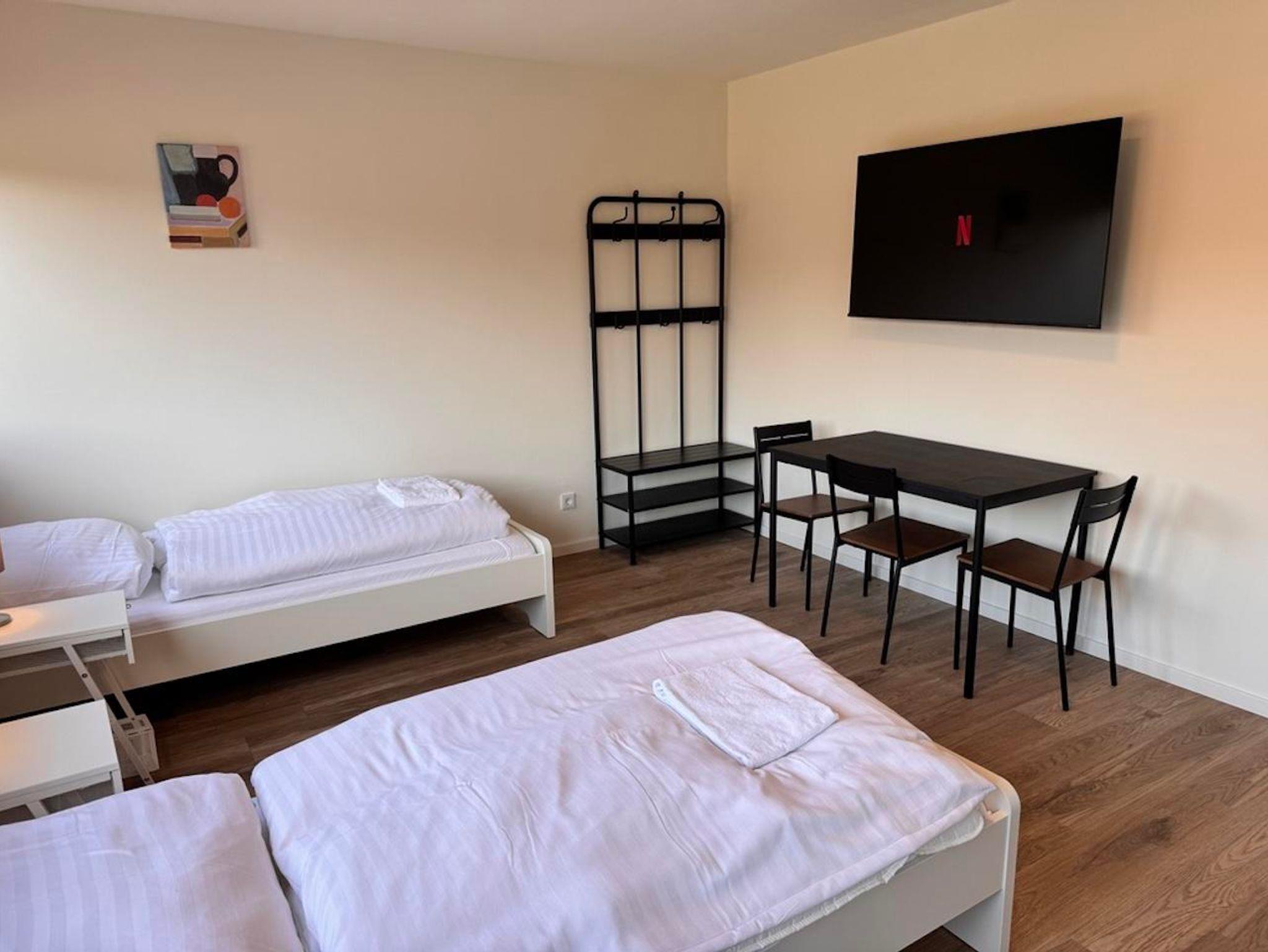 Das McMonti Köln Nord ist eine moderne und einladende Unterkunft, die sowohl für Geschäftsreisende als auch für Urlauber ideal geeignet ist. Sie liegt strategisch günstig und bietet schnellen Zugang zu den wichtigsten Sehenswürdigkeiten und Verkehrsanbindungen der Stadt Köln. Die komfortablen Zimmer sind geschmackvoll eingerichtet und schaffen eine entspannende Atmosphäre. Jedes Zimmer verfügt über kostenloses WLAN, einen Flachbildfernseher, Kühl-/Gefrierkombination und einen Schreibtisch. Die Küche sowie das Badezimmer mit Dusche sind gemeinsam genutzte Bereiche.
