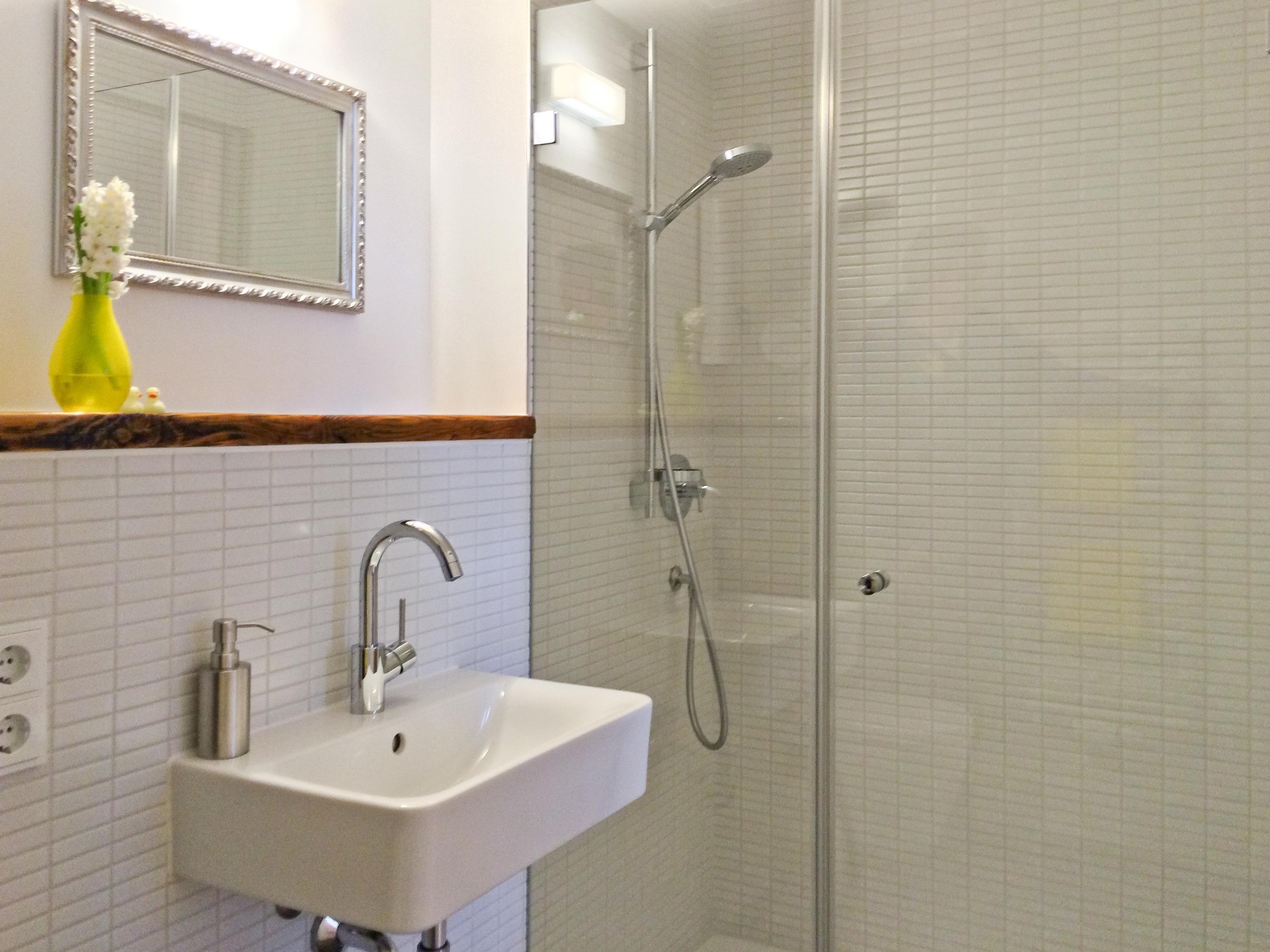 Das Appartement oMo hat hohe Decken und Fenster zum Hinterhof. Im Schlafzimmer liegt Parkett, im Bad Kieselfliesen und die Küche ist mit hellgrauem Sichtestrich gestaltet. Typisch für ein altes Stadthaus hat es Sprossenfenster mit moderner Doppelverglasung sowie überwiegend aufgearbeitete Originaltüren. Heizung und Handtuchtrockner im Bad sind modern. Die Einrichtung ist eine Mischung aus Familienschätzen und schlichten modernen Möbeln.