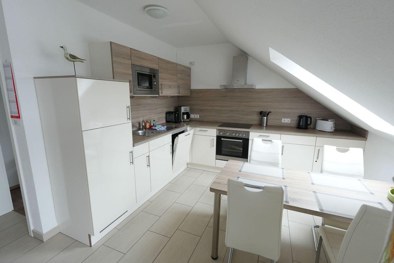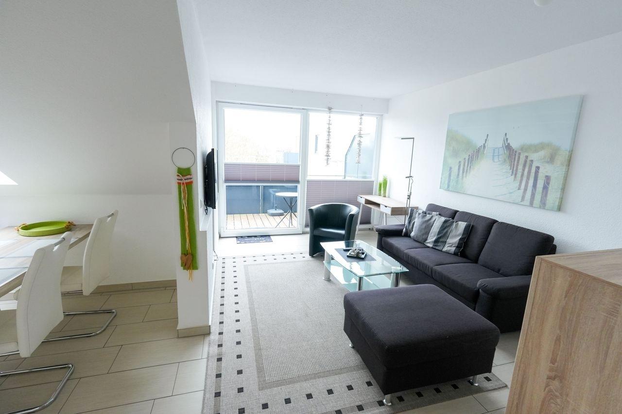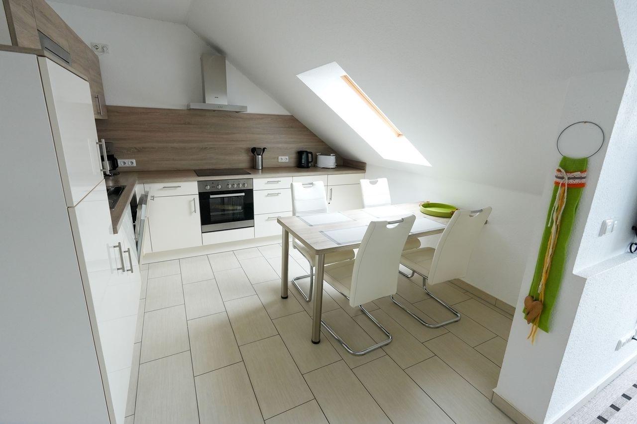 Wir bieten Ihne eine neue, exklusive Ferienwohnung für 2-4 Personen an. Sie ist modern und geschmackvoll eingerichtet und befindet sich im Dachgeschoss eines Hauses mit insgesamt 6 Wohneinheiten. Die Wohnfläche beträgt etwa 55 m² und besteht aus einem großzügigen Wohnbereich mit offener Küchenecke. Es gibt ein Schlafzimmer mit einem Doppelbett und ein kleines Kinderzimmer mit Etagenbett. Das Badezimmer verfügt über eine ebenerdige Dusche und das WC ist separat, beide Räume sind mit einem Waschbecken ausgestattet. Der Balkon liegt nach Süden ausgerichtet und ein eigener Parkplatz steht zur Verfügung. Bitte beachten Sie die Hausordnung, die in der Ferienwohnung ausliegt und Teil des Mietvertrags ist. Bei Nichtbeachtung haftet der Mieter innerhalb der Vermieter-Mieter-Beziehung.