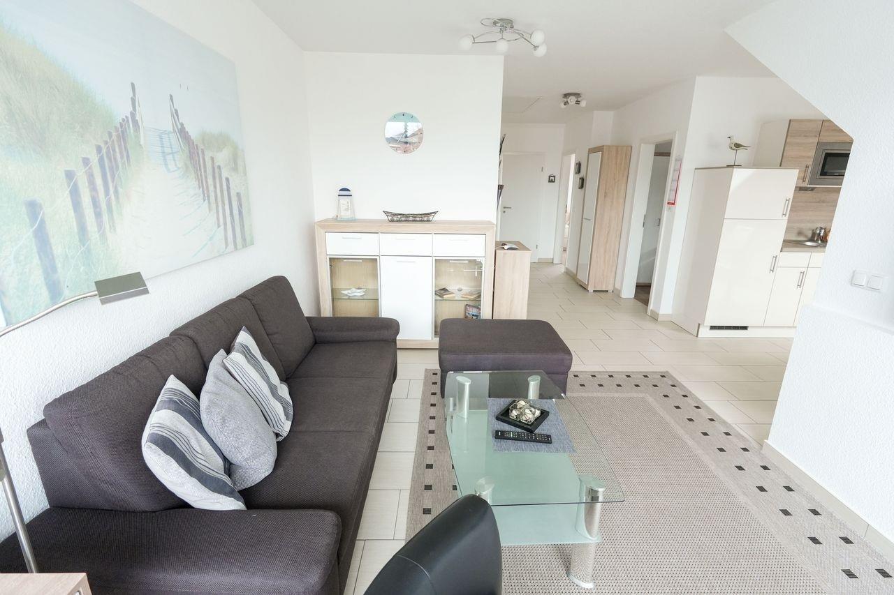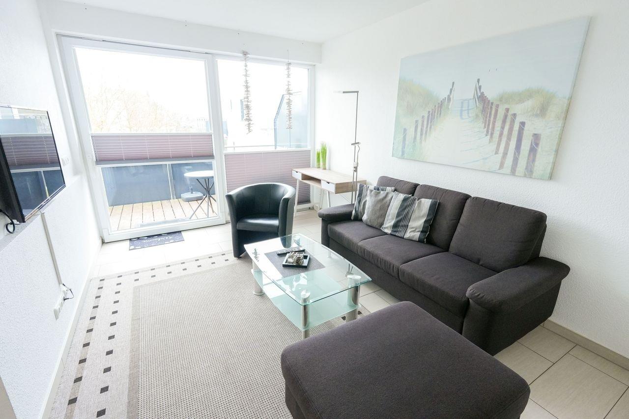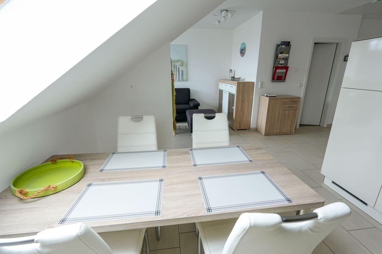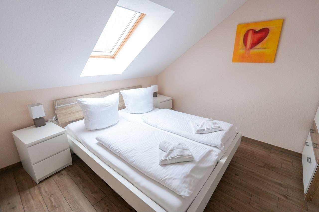 Wir bieten Ihne eine neue, exklusive Ferienwohnung für 2-4 Personen an. Sie ist modern und geschmackvoll eingerichtet und befindet sich im Dachgeschoss eines Hauses mit insgesamt 6 Wohneinheiten. Die Wohnfläche beträgt etwa 55 m² und besteht aus einem großzügigen Wohnbereich mit offener Küchenecke. Es gibt ein Schlafzimmer mit einem Doppelbett und ein kleines Kinderzimmer mit Etagenbett. Das Badezimmer verfügt über eine ebenerdige Dusche und das WC ist separat, beide Räume sind mit einem Waschbecken ausgestattet. Der Balkon liegt nach Süden ausgerichtet und ein eigener Parkplatz steht zur Verfügung. Bitte beachten Sie die Hausordnung, die in der Ferienwohnung ausliegt und Teil des Mietvertrags ist. Bei Nichtbeachtung haftet der Mieter innerhalb der Vermieter-Mieter-Beziehung.