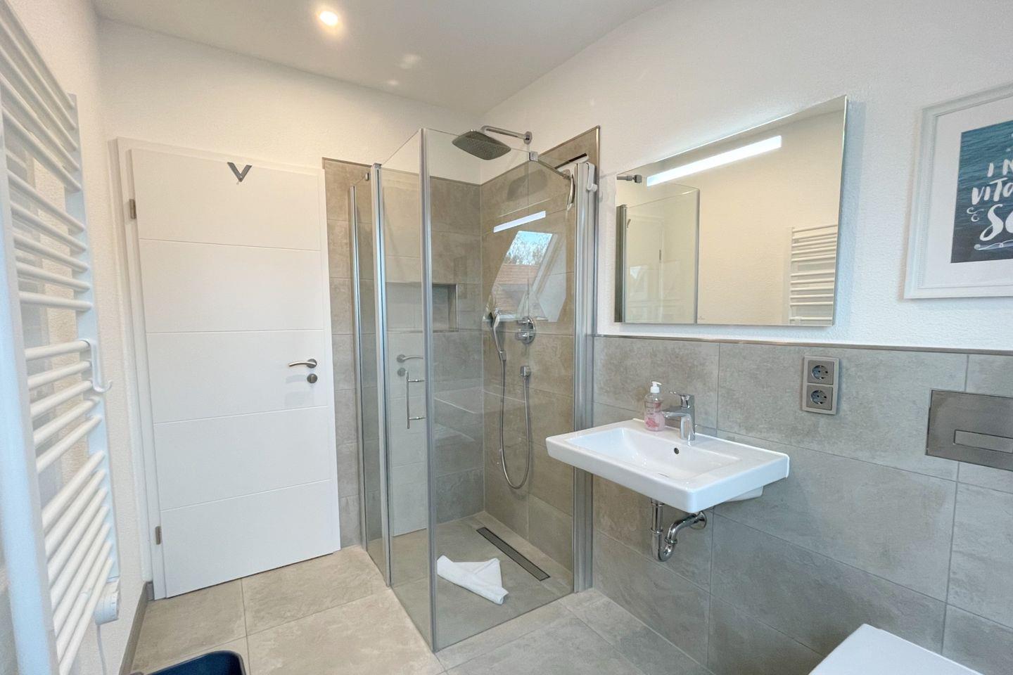 Die Ferienwohnung verfügt über zwei geschmackvoll eingerichtete Schlafzimmer, eine gemütliche Sofaecke im Wohnzimmer sowie zwei moderne Badezimmer. Die offene Küche lädt dazu ein, gemeinsam zu kochen und gesellige Abende zu verbringen. Sie ist voll ausgestattet mit allem, was Sie benötigen: von einem Induktionsherd über einen Backofen bis hin zu einer Spülmaschine und einer Mikrowelle. Zu Ihrer Bequemlichkeit stehen Geschirr und Besteck bereit, sodass Sie direkt mit dem Kochen loslegen können.
