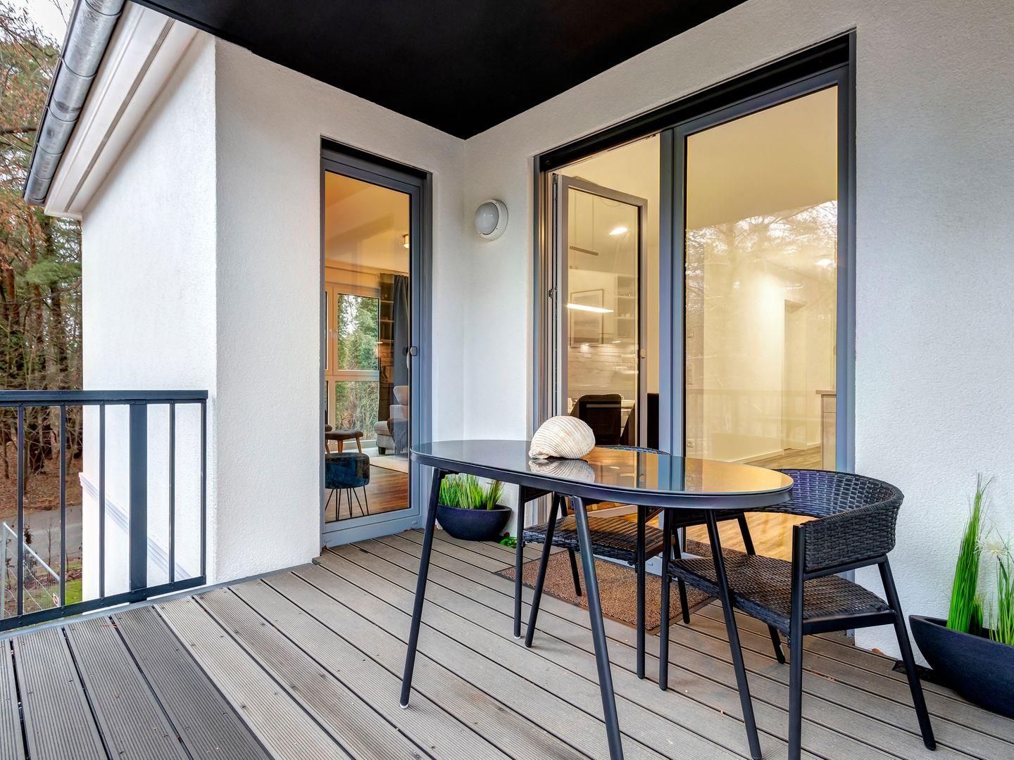 Genießen Sie den offenen Wohnbereich mit einer voll ausgestatteten Küche, die sich zum überdachten Balkon hin öffnet. Dort können Sie den beruhigenden Blick auf den Wald und die frische Luft genießen.