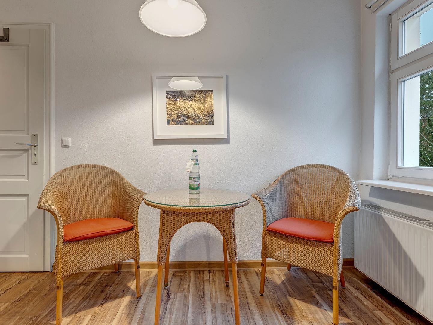 Die gemütliche Wohnung 6 ist besonders beliebt bei jungen Leuten, Ehepartnern, die Angehörige in der Klinik besuchen, und Großeltern, deren Familie die angrenzende Wohnung 7 gemietet haben. Bei stärkerem Meereswellengang kann man bei geöffnetem Fenster die Ostsee hören. Die Wohnung 6, etwa 22 qm groß, befindet sich im zweiten Obergeschoß. Sie besteht aus einem Wohnzimmer und einem separaten Badezimmer welches zugänglich über den Flur ist. Wohnzimmer und Badezimmer sind durch einen kleinen Flur verbunden, der auch von den Gästen der Wohnung 7 beim Betreten und verlassen der Wohnung genutzt wird. Der Kleiderschrank mit Ablagemöglichkeiten befindet sich im Bad. Im Wohnraum befinden sich zwei Einzelbetten, die hintereinander angeordnet sind, ein Fernseher, sowie eine Pantry-Küche mit zwei Herdplatten, Kühlschrank, Kaffeemaschine und Toaster.