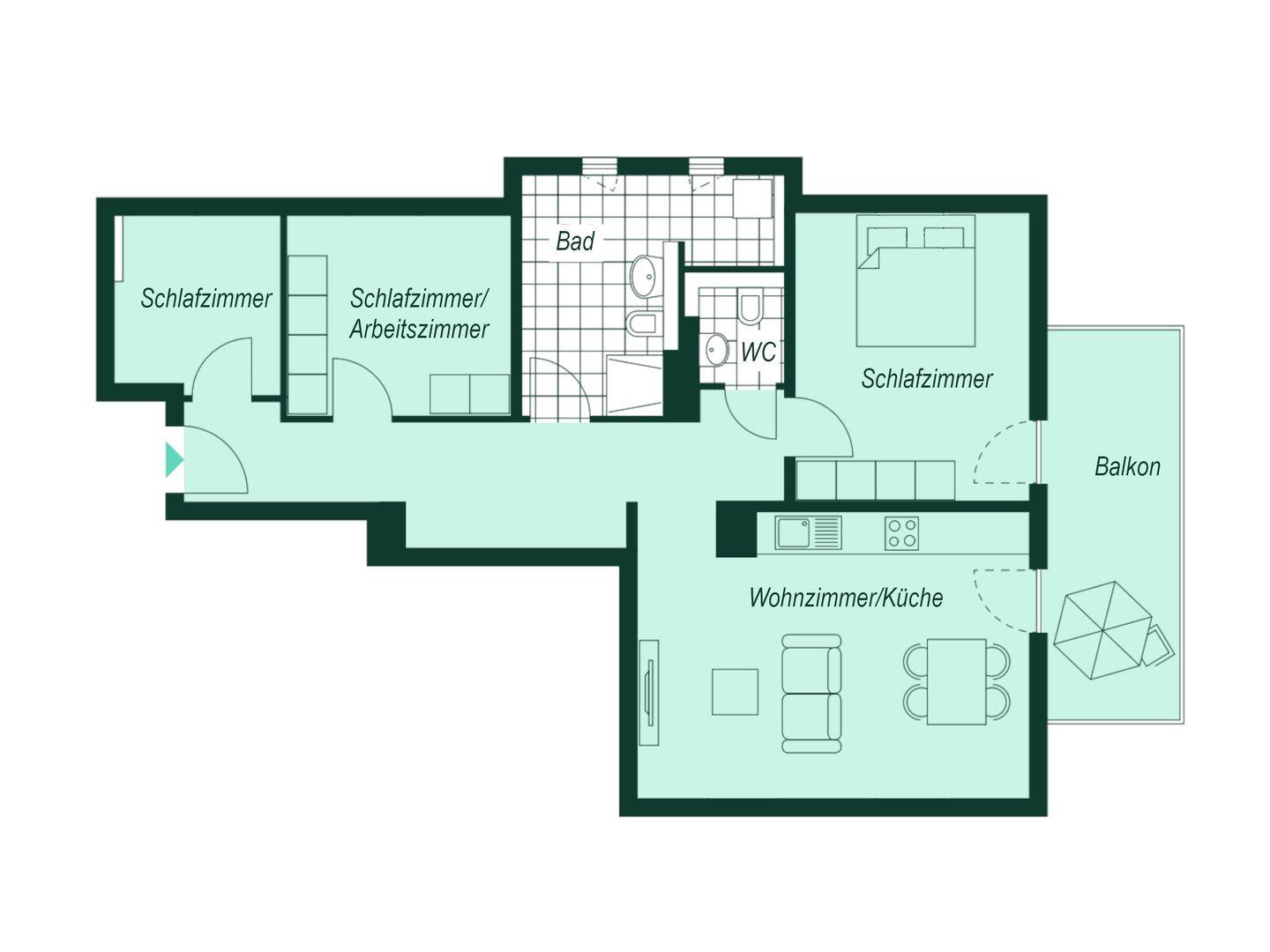 In der geräumigen Wohnung vereinen sich Design und Geborgenheit. Ruhen Sie in hochwertigen Betten, Sesseln in beruhigendem Grün oder genießen Sie den großen Balkon mit Westausrichtung. Die voll ausgestattete Küche lädt zum Kochen ein. Mit einem Schlafzimmer mit Doppelbett und zwei Zimmern mit Einzelbetten eignet sich die Wohnung für Strandurlaube oder Workation, dank schnellem WLAN und Schreibtisch. Zwei weitere Schlafplätze bietet das Schlafsofa in der Wohnküche mit Top-Matratze.