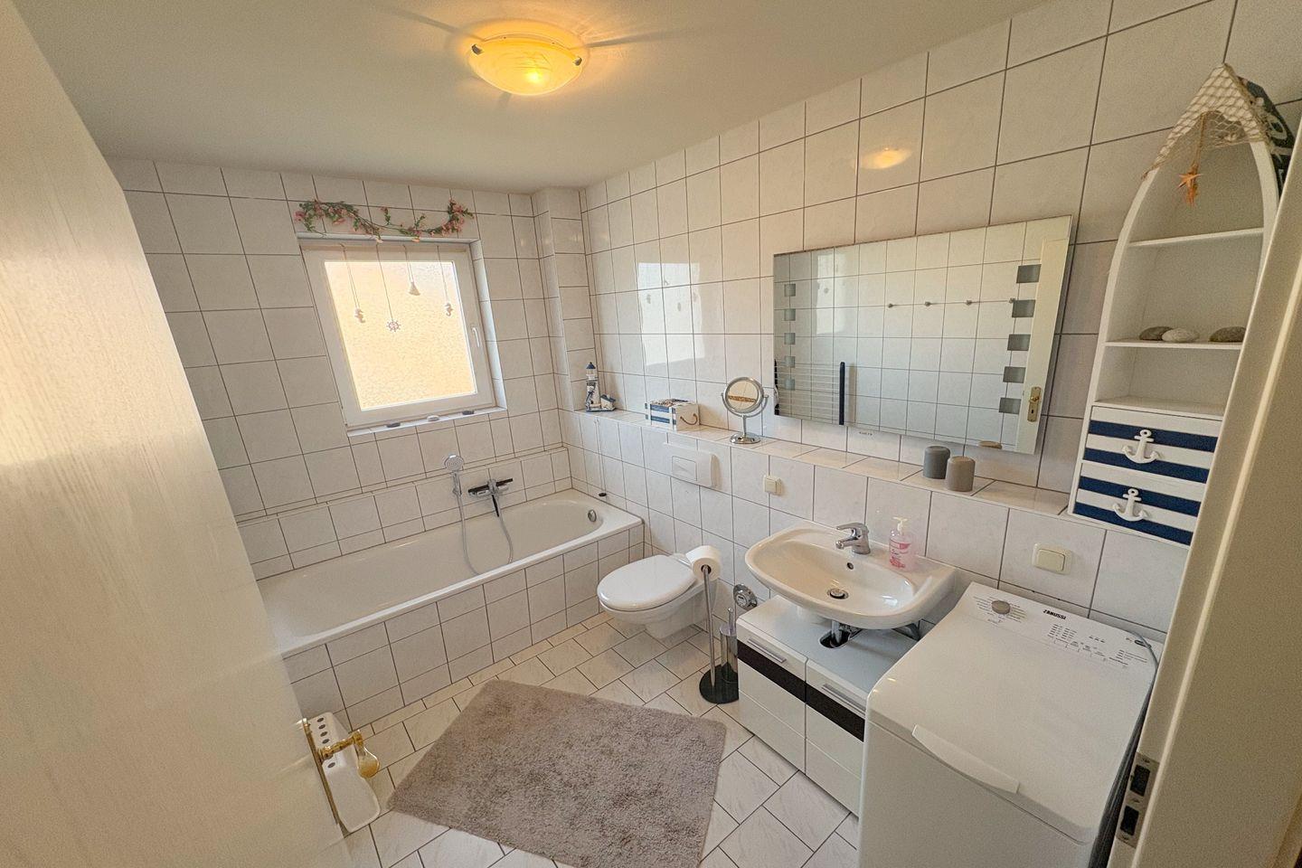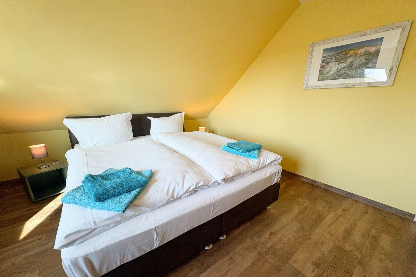Die Ferienwohnung umfasst ein gemütliches Schlafzimmer mit einem komfortablen Bett und ausreichend Stauraum für Ihr Gepäck. Das Badezimmer besticht mit einer Badewanne und modernen Annehmlichkeiten wie einem Haartrockner und Kosmetikspiegel – hier können Sie sich nach einem langen Tag verwöhnen lassen. Für einen sorgenfreien Aufenthalt sind Bettwäsche und Handtücher bereits im Preis enthalten, ebenso wie die Erstausstattung an Haushaltsutensilien. Für Ihre Fahrräder steht ein abgeschlossener Kellerraum zur Verfügung.