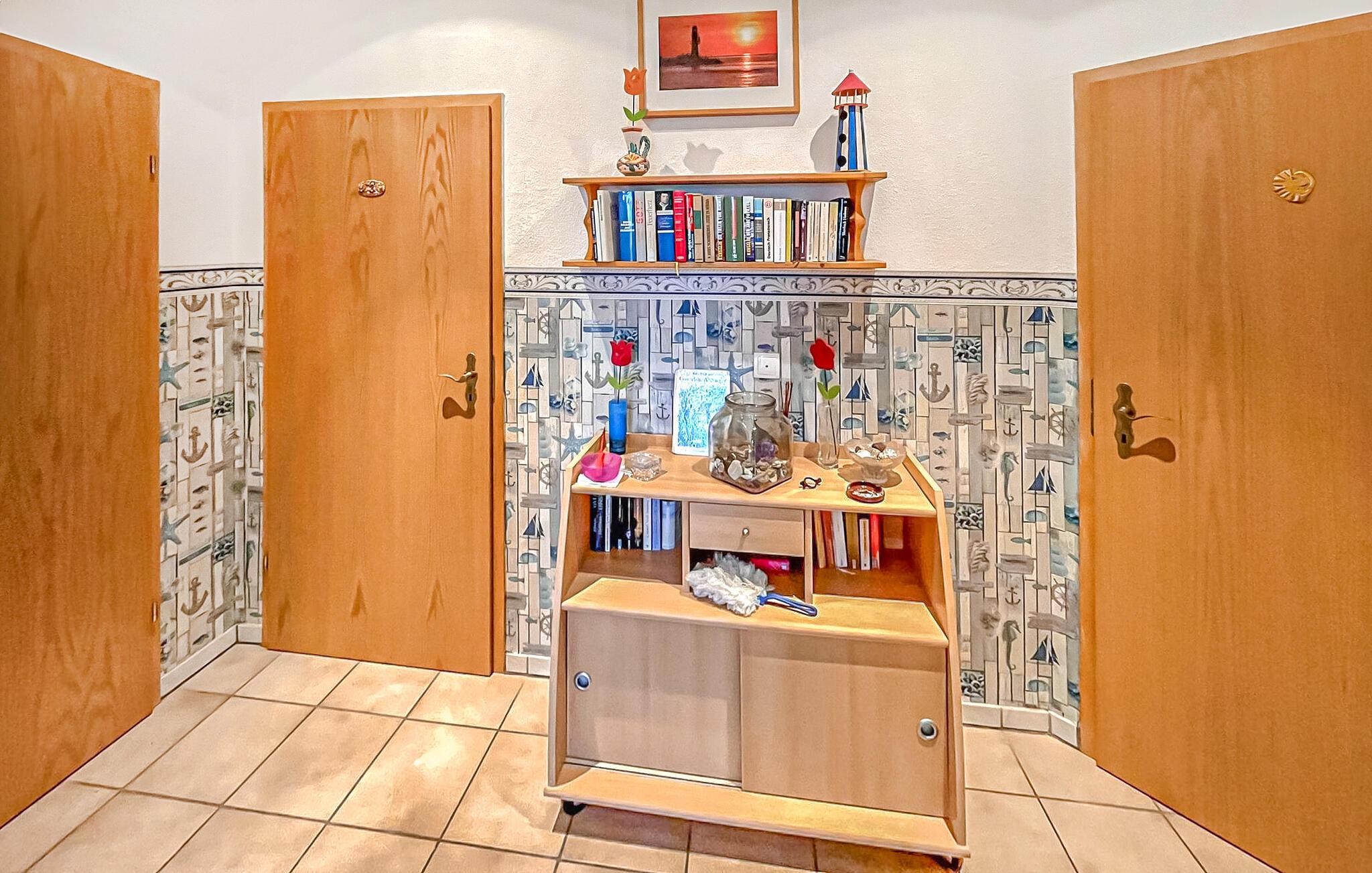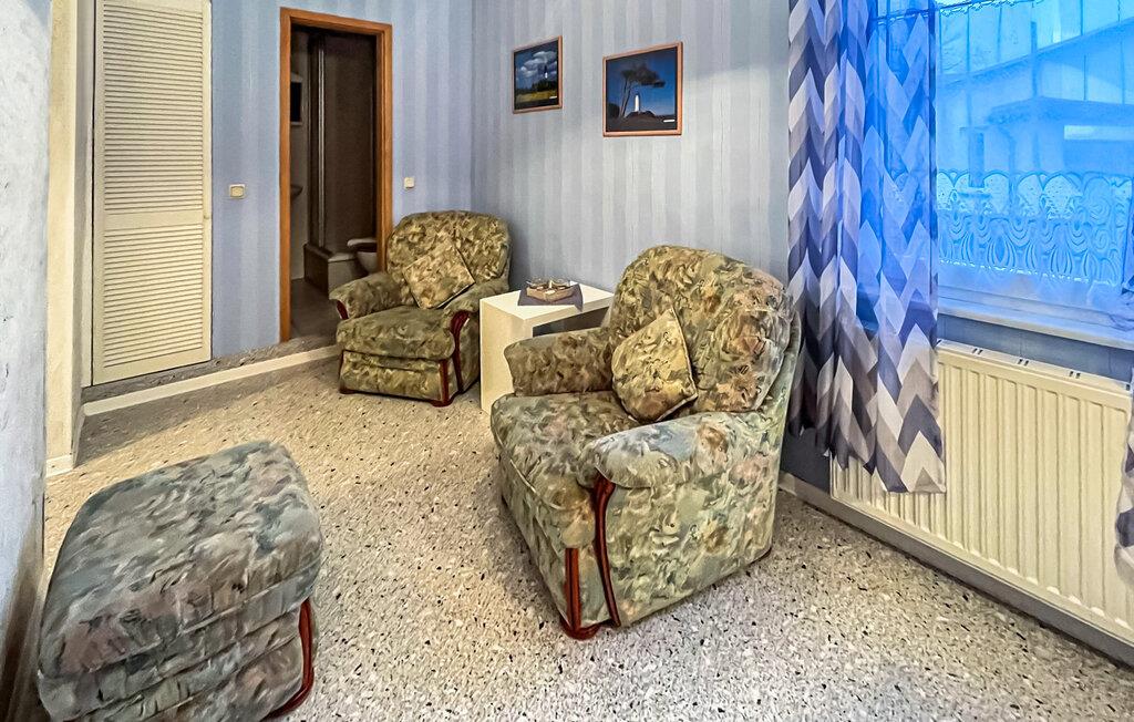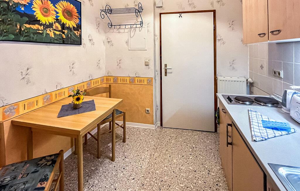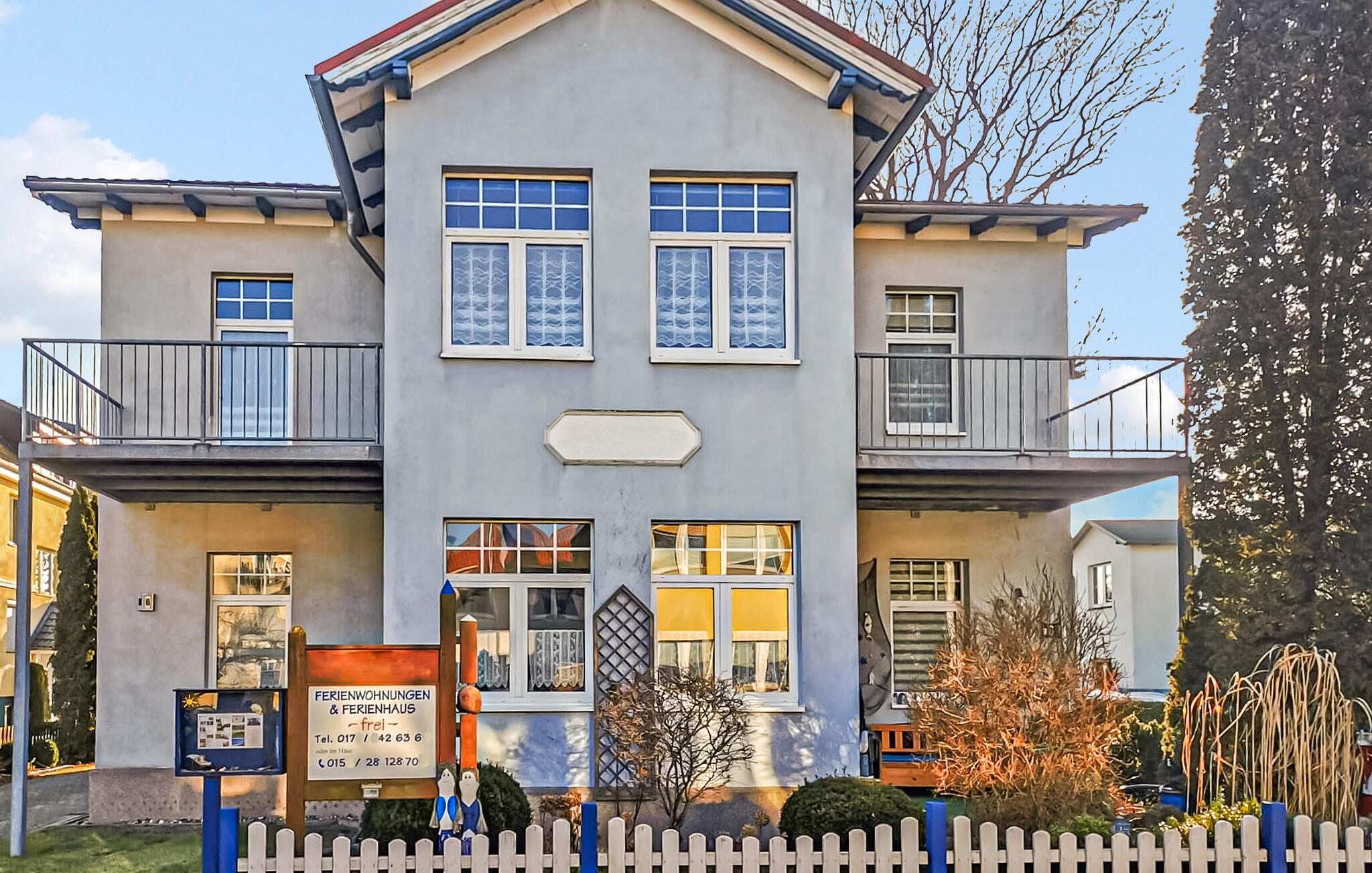 De seks ikke-ryger ferielejligheder af forskellig størrelse og indretning ligger separat i stueetagen og øverste etage i en lejlighedsbygning med en central beliggenhed. Der er også et sommerhus (DZV870) på ejendommen. Østersøstranden med strandpromenade, restauranter/caféer og Usedomer Bäderbahn togstation ligger inden for omkring 500 m. Den lille etværelses lejlighed til 2 personer ligger i stueetagen. Den er udstyret med en kombineret opholdsstue med åbent tekøkken (opholds- og spiseplads, fladskærms-tv, elektrisk kogeplade, køleskab med fryser, mikroovn, forskellige køkkenmaskiner), soveplads med dobbeltseng og badeværelse med bruser /toilet. Der blev indrettet et opholdsområde i indgangspartiet til lejligheden i stueetagen. Alternativt er der et centralt udendørs opholdsområde med grillfaciliteter på den 820 kvm store ejendom. Der er også opbevaringsplads til cykler og parkeringsplads til biler. En barneseng og høj stol kan stilles til rådighed for små børn. Der er også gratis WiFi. Lejeprisen inkluderer slutrengøring, sengetøj samt vand- og elforbrug. Håndklæder skal medbringes. Der skal betales en spaskat i feriestedet Kölpinsee ved Østersøen (betales på stedet) Kæledyr er ikke tilladt på denne ejendom. Badebyen Kölpinsee er et distrikt i Loddin kommune i den midterste del af øen Usedom, på det smalle punkt mellem Østersøen og Achterwasser. Østersøstranden i Kölpinsee er bred og særlig fin. Samtidig lover stedet fred og afslapning ved Achterwassers indre kyst og er et interessant sted at opholde sig, især for lystfiskere takket være den fiskerige Kölpinsee. Der er en multi-generation legeplads på promenaden. Forskellige arrangementer finder sted fra maj til oktober i den lokale spa-pavillon med udsigt over søen Kölpinsee. Restauranter og indkøbsmuligheder, en ridestald og udlejning af cykel, båd og strandstole er også placeret i byen.