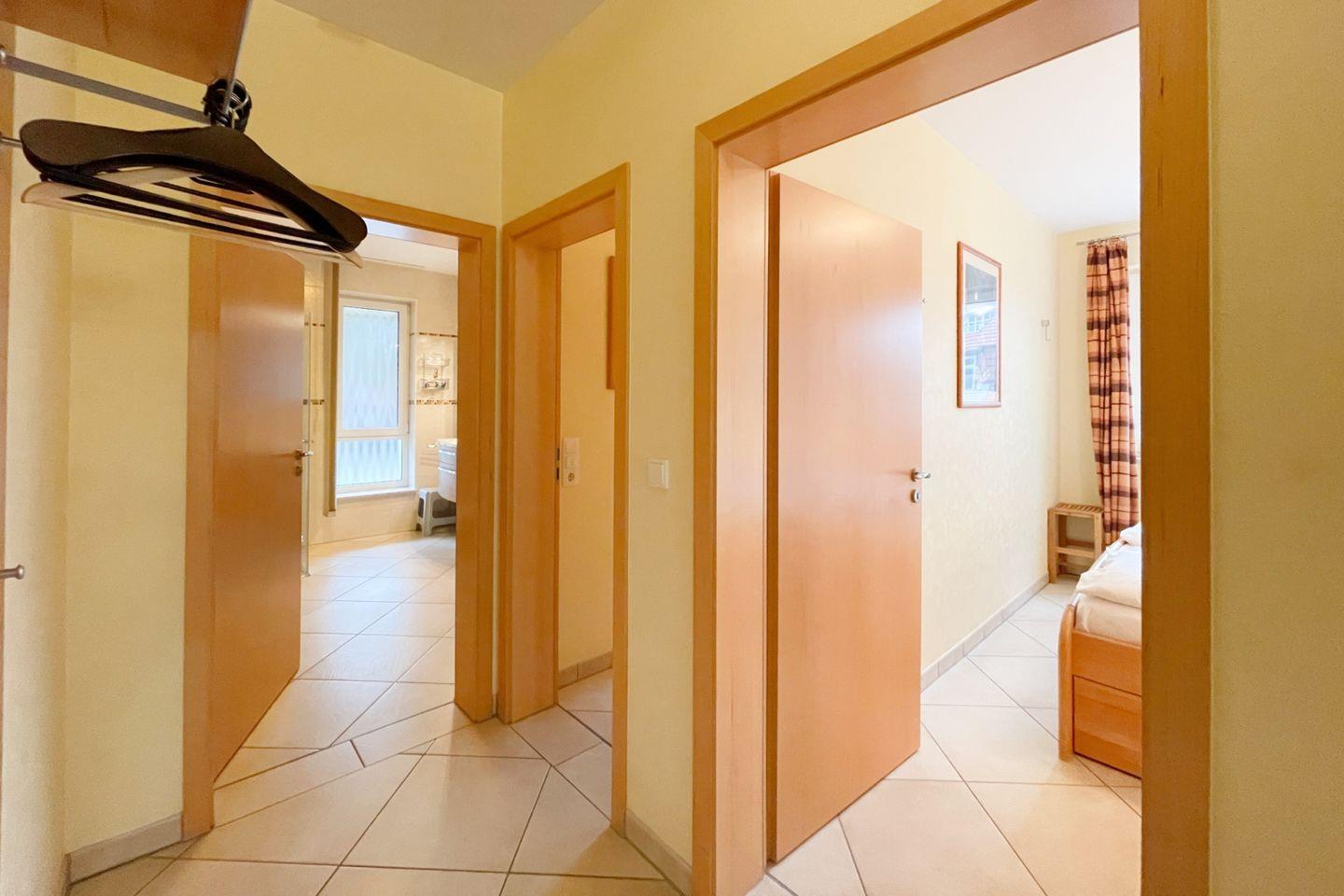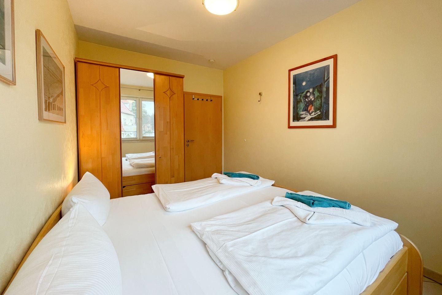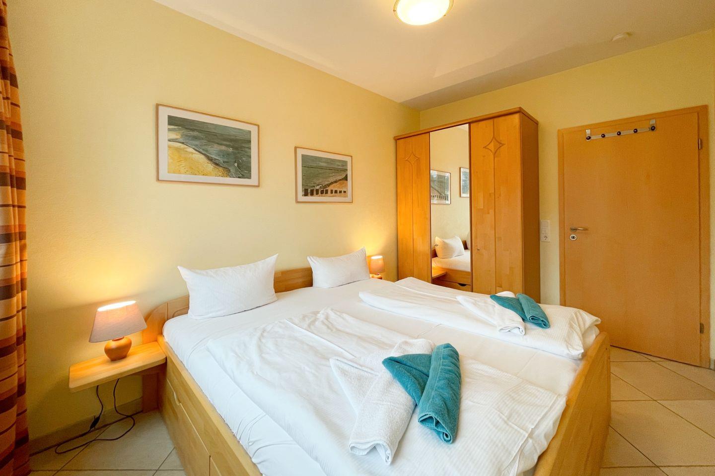 Darüber hinaus stehen Ihnen zwei komfortable Schlafzimmer zur Verfügung, die mit hochwertigen Betten und flauschiger Bettwäsche ausgestattet sind. Hier finden Sie den idealen Rückzugsort für erholsame Nächte. Das Badezimmer verfügt über eine bodengleiche Dusche und ist sorgfältig gestaltet, um allen Komfort zu bieten.