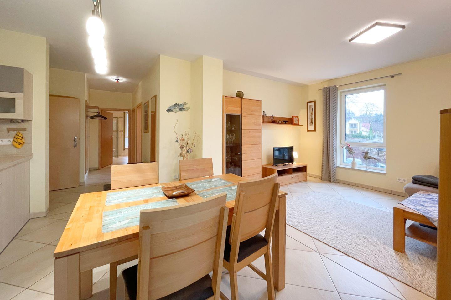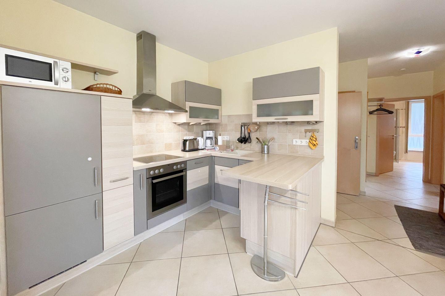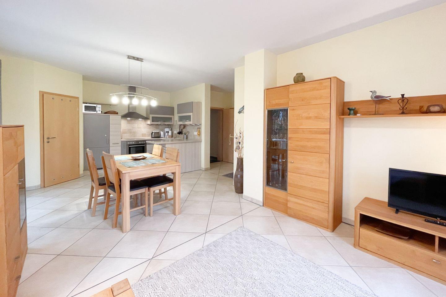 Die Wohnung befindet sich im ersten Stock eines gepflegten Mehrfamilienhauses und überzeugt durch eine lichtdurchflutete, offene Raumgestaltung. Der einladende Wohnbereich ist mit einer gemütlichen Sofaecke ausgestattet, die perfekt ist, um nach einem erlebnisreichen Tag zu entspannen. Ein großer Esstisch lädt zu gemeinsamen Mahlzeiten ein, während die vollständig ausgestattete Küche mit modernen Geräten wie einer Spülmaschine, einem Backofen und einem Kühlschrank dafür sorgt, dass Sie sich im Urlaub wie zu Hause fühlen.
