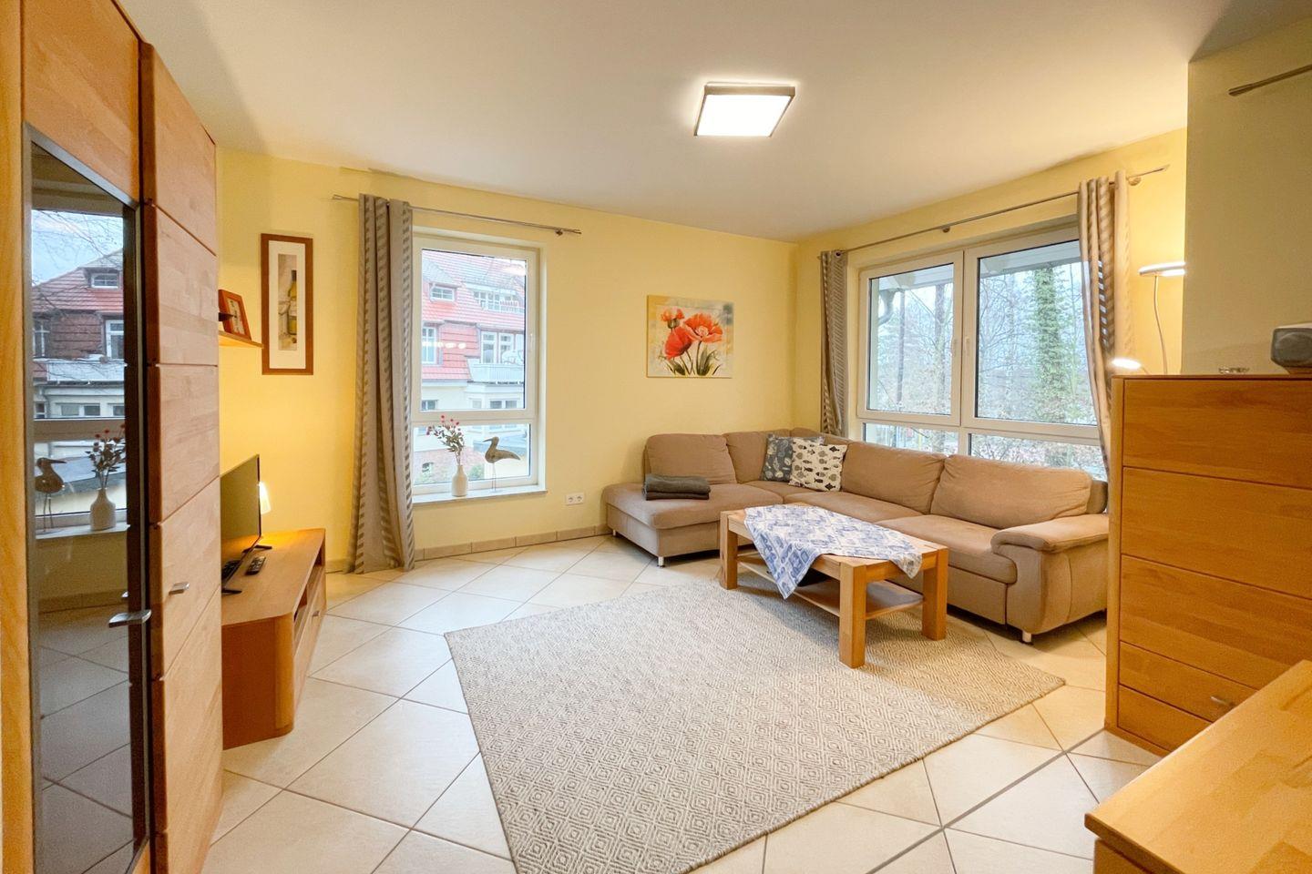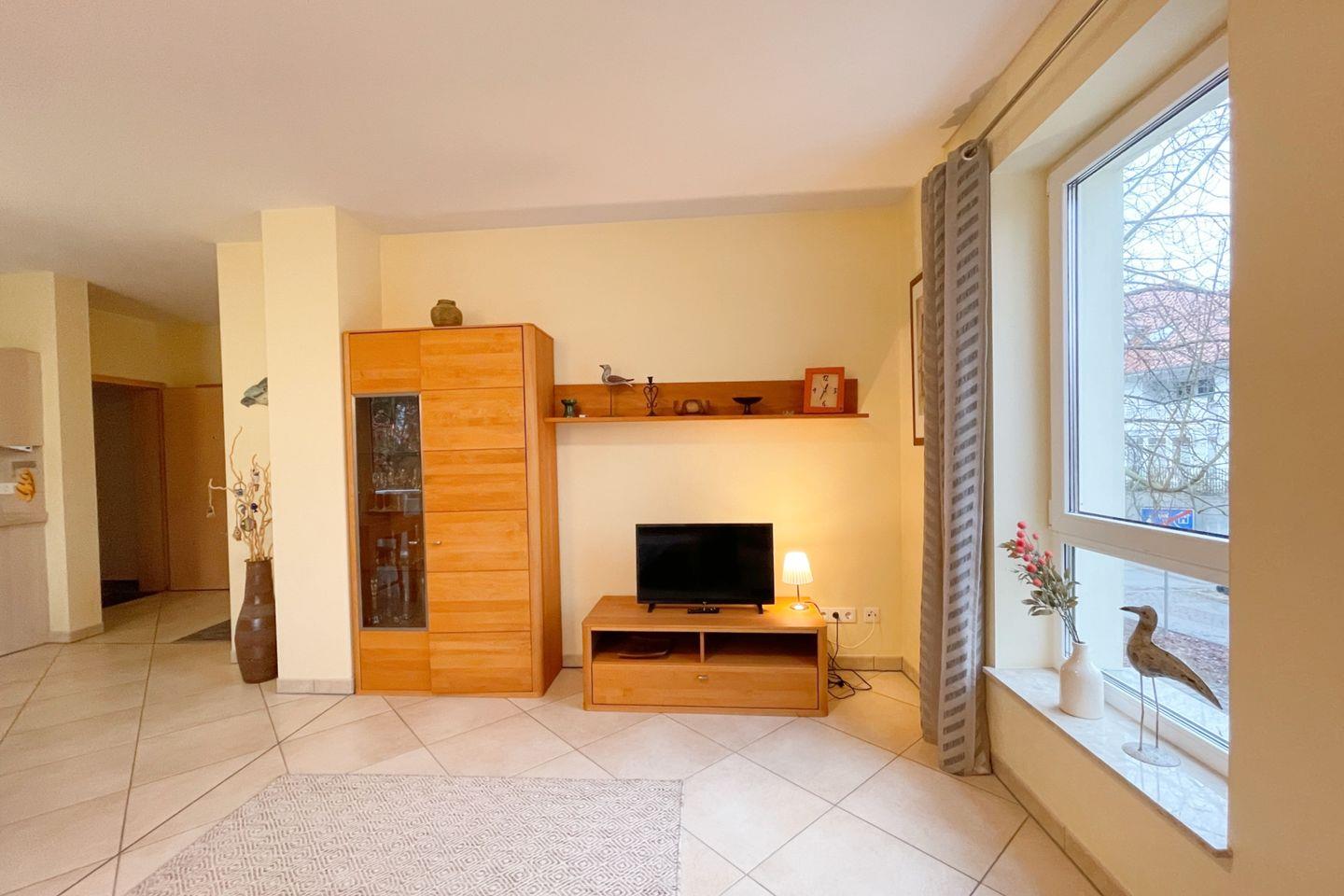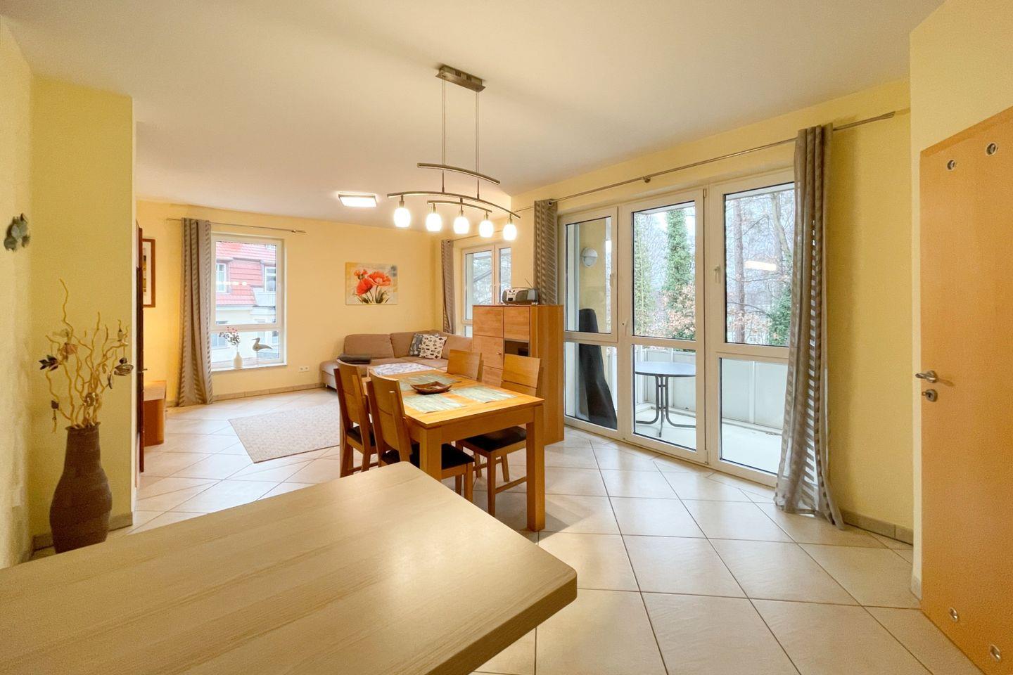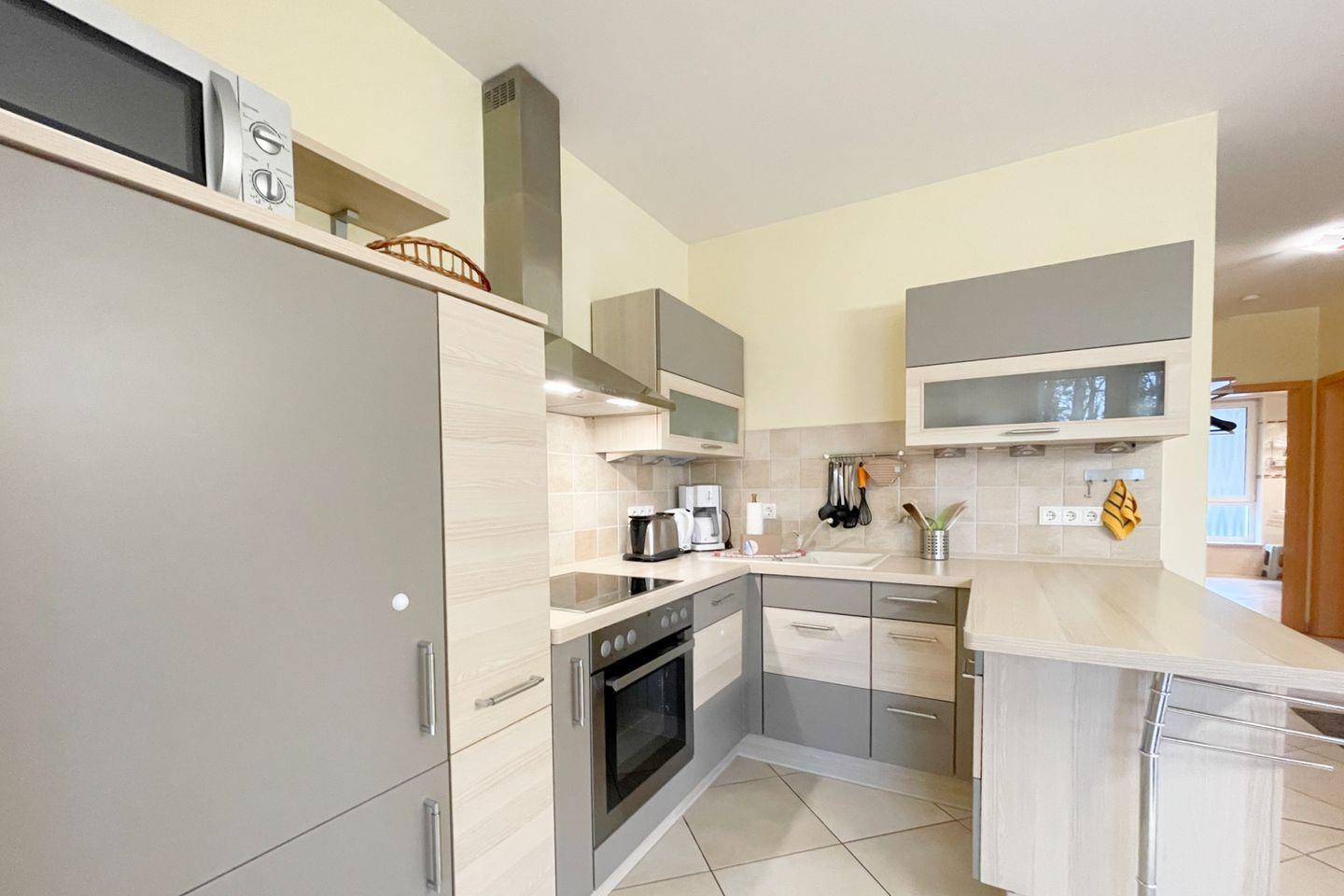 Die Wohnung befindet sich im ersten Stock eines gepflegten Mehrfamilienhauses und überzeugt durch eine lichtdurchflutete, offene Raumgestaltung. Der einladende Wohnbereich ist mit einer gemütlichen Sofaecke ausgestattet, die perfekt ist, um nach einem erlebnisreichen Tag zu entspannen. Ein großer Esstisch lädt zu gemeinsamen Mahlzeiten ein, während die vollständig ausgestattete Küche mit modernen Geräten wie einer Spülmaschine, einem Backofen und einem Kühlschrank dafür sorgt, dass Sie sich im Urlaub wie zu Hause fühlen.