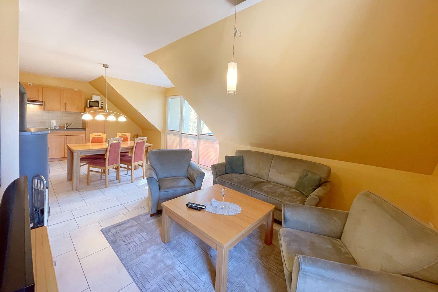 Die Wohnung erstreckt sich über drei lichtdurchflutete Zimmer, darunter zwei gemütliche Schlafzimmer, die durch ihre geschmackvolle Einrichtung und liebevollen Details bestechen. Ein solidarisches Wohngefühl entsteht im offenen Wohn- und Essbereich, der mit einer komfortablen Sitzecke, einem Esstisch und einem Kaminofen ausgestattet ist. Hier können Sie entspannte Abende verbringen und den Blick auf die wunderschöne Umgebung genießen. Die moderne Küche ist mit allen Annehmlichkeiten ausgestattet, einschließlich Geschirrspüler, Mikrowelle, Backofen und Kaffeemaschine, sodass beim Kochen Ihrer Lieblingsgerichte keine Wünsche offen bleiben.