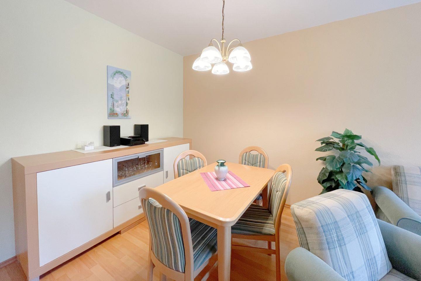 Zur weiteren Ausstattung der Ferienwohnung "Kerre Kiek 8" gehören eine gut ausgestattete Küche mit modernen Geräten wie einem Herd, einem Backofen, einer Mikrowelle und einer Spülmaschine, sowie einem Essbereich, der bequem Platz für alle Gäste bietet. Das Badezimmer ist mit einer Dusche und einer Badewanne ausgestattet und bietet ausreichend Platz zur Erfrischung und Entspannung.