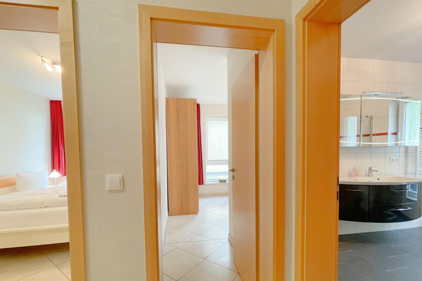 Mit einer Fläche von 76 m² ist die Unterkunft ideal für bis zu vier Personen und überzeugt durch ihre gemütliche und einladende Atmosphäre. Die Ferienwohnung zeichnet sich durch zwei behagliche Schlafzimmer aus, in denen Sie nach einem erlebnisreichen Tag am Strand wunderbar entspannen können. Das offene Wohnkonzept verbindet die voll ausgestattete Küche harmonisch mit dem hellen Wohnzimmer. Genießen Sie gesellige Abende am Esstisch oder verweilen Sie in der Sofaecke, während Sie einen Film auf dem digitalen TV-Gerät schauen.
