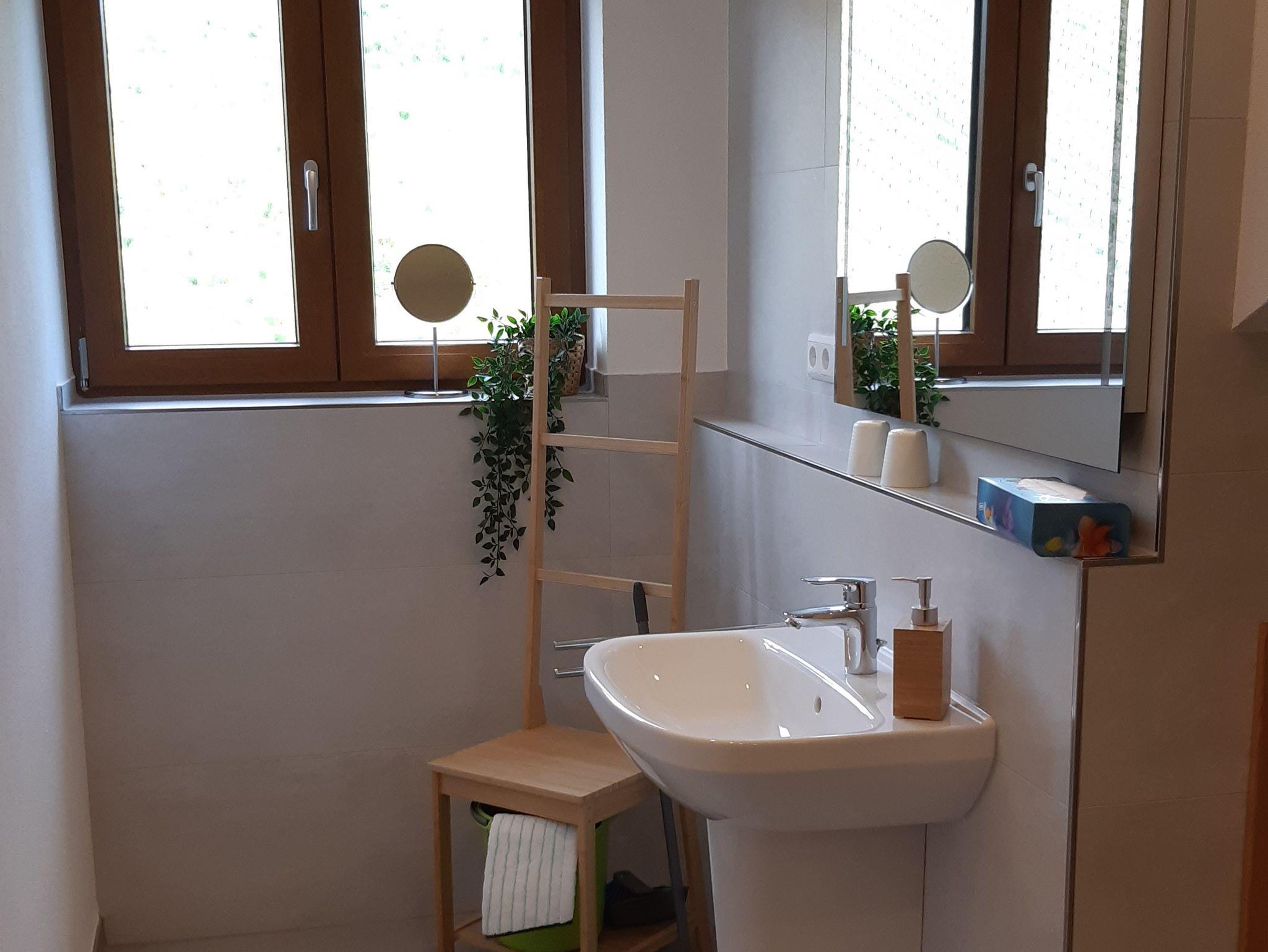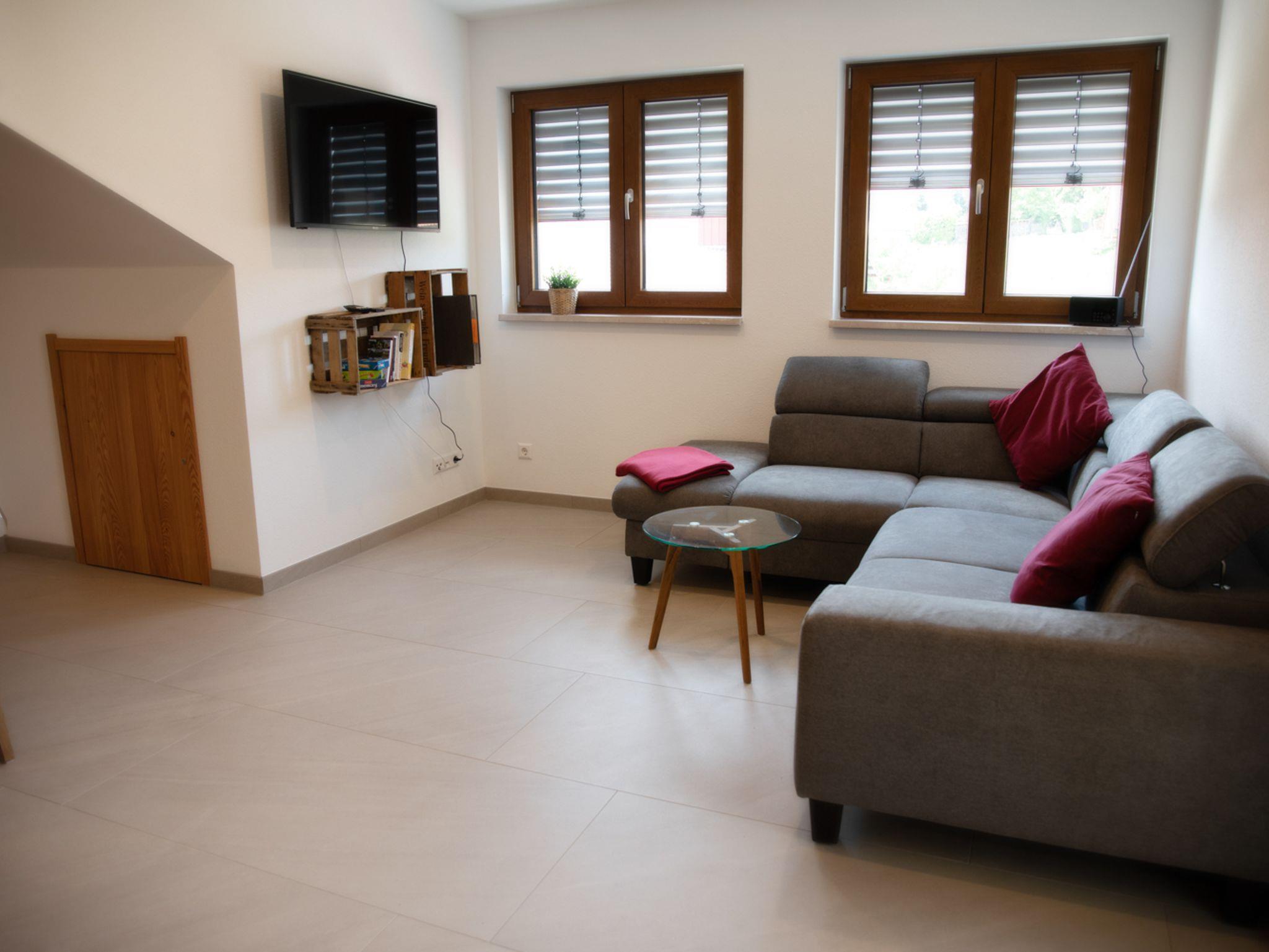 Die Ferienwohnung Weinstube im Dachgeschoss, der ehemaligen Scheune (Der Name Weinstube ist abgeleitet von der schönen Weinbauregion Tauberfranken)ist 57m² groß. Die geflieste Wohnung ist sehr Licht durchflutet. Im Schlafzimmer ist ein 1,80 x 2,00m großes, gemütliches Bett und eine Schlafcouch vorhanden. Im Wohnzimmer ist ebenfalls eine ausziehbare Couch und ein großer Fernseher. Nebenan die Küche mit Essbereich ist komplett ausgestattet. Ebenso ist ein großzügiges Badezimmer mit einer ebenerdigen Dusche. Die Loggia lädt Sie mit einem wunderschönen Blick auf die Natur zum entspannen ein. Waschmaschine und Trockner können gegen Aufpreis mitbenutzt werden. PKW -Stellplatz direkt vor der Haustüre, für Fahrräder gibt es eine abschließbare Garage.