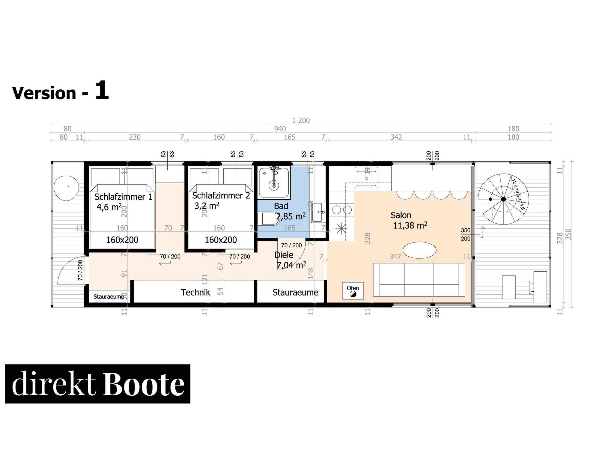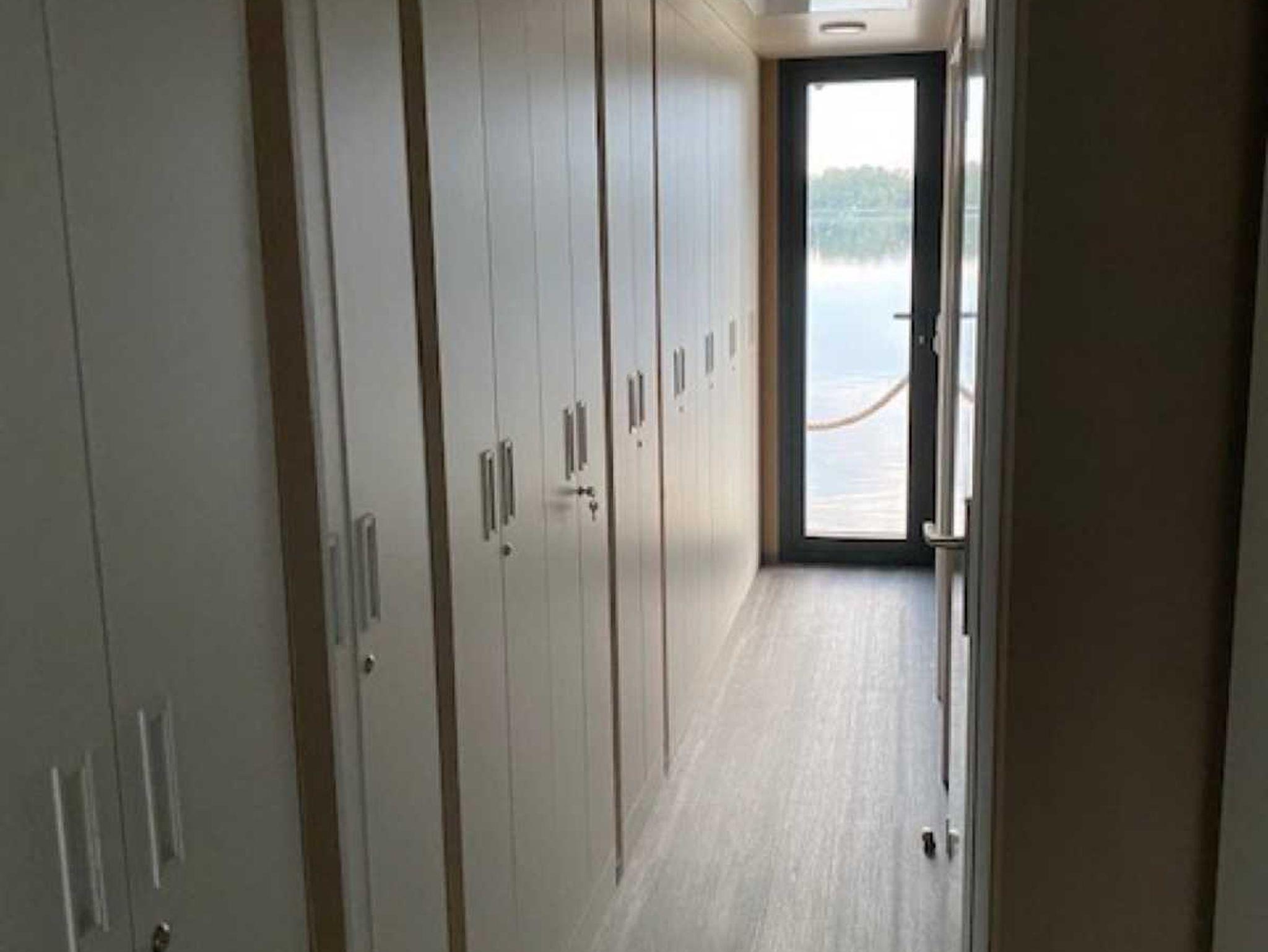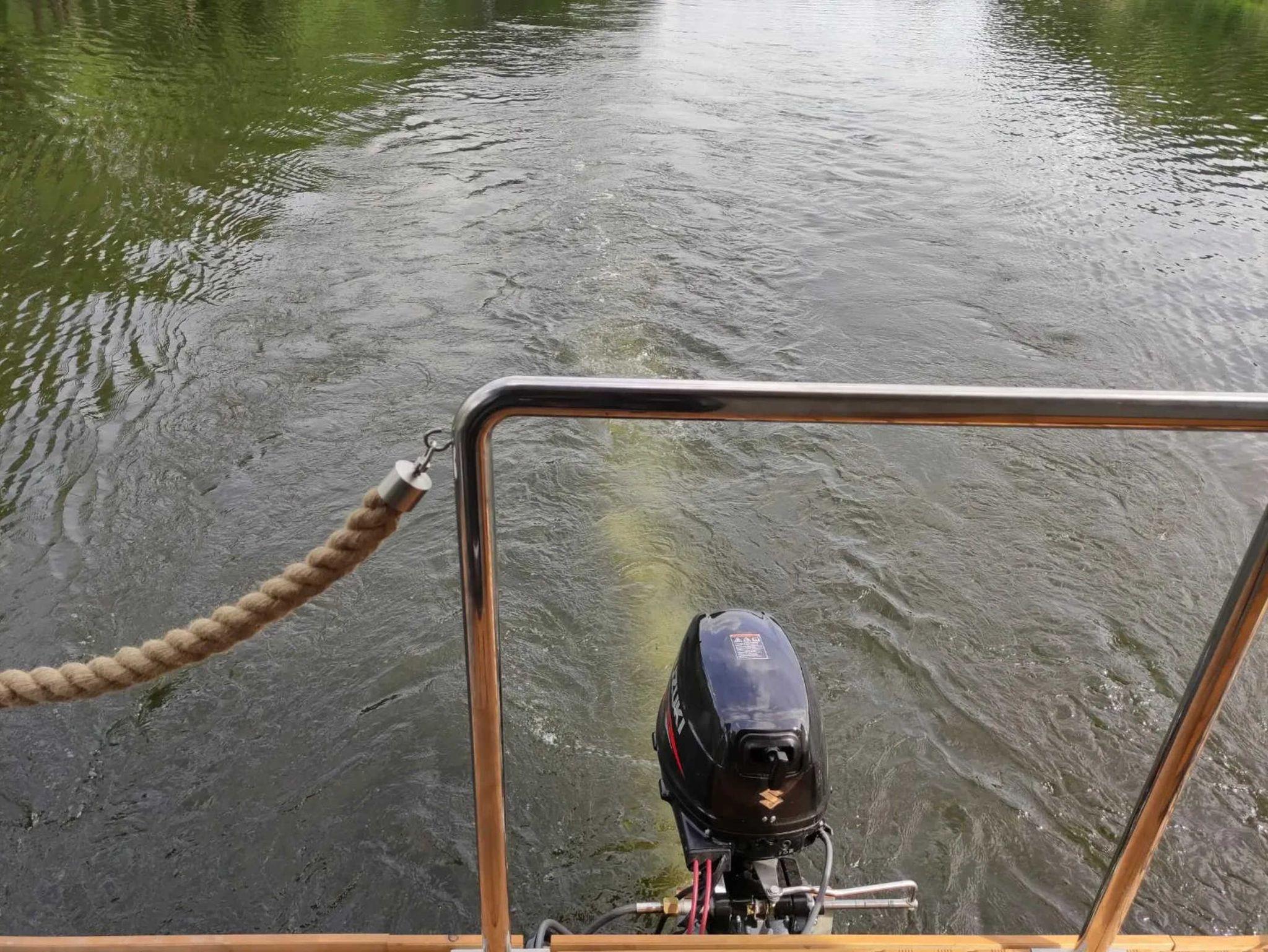 Es handelt sich um ein Hausboot vom Typ Woodstream 12,5 mit den Abmessungen 12,5 Meter x 3,5 Meter und 0,50 Meter Tiefgang. Ausgestattet mit einem 50 PS Motor mit Bug- und Heckstrahlruder und Bugterrasse mit Fahrerstand,: einer Oberterasse mit Lounge-Möbeln, 1 großem Wohnraum mit Couchecke (Schlafcouch) und Kamin, kompletter Küche und Essplatz für 4 Personen, 2 Schlafräume für je 2 Personen und einem großzügigem Bad mit Dusche und WC.