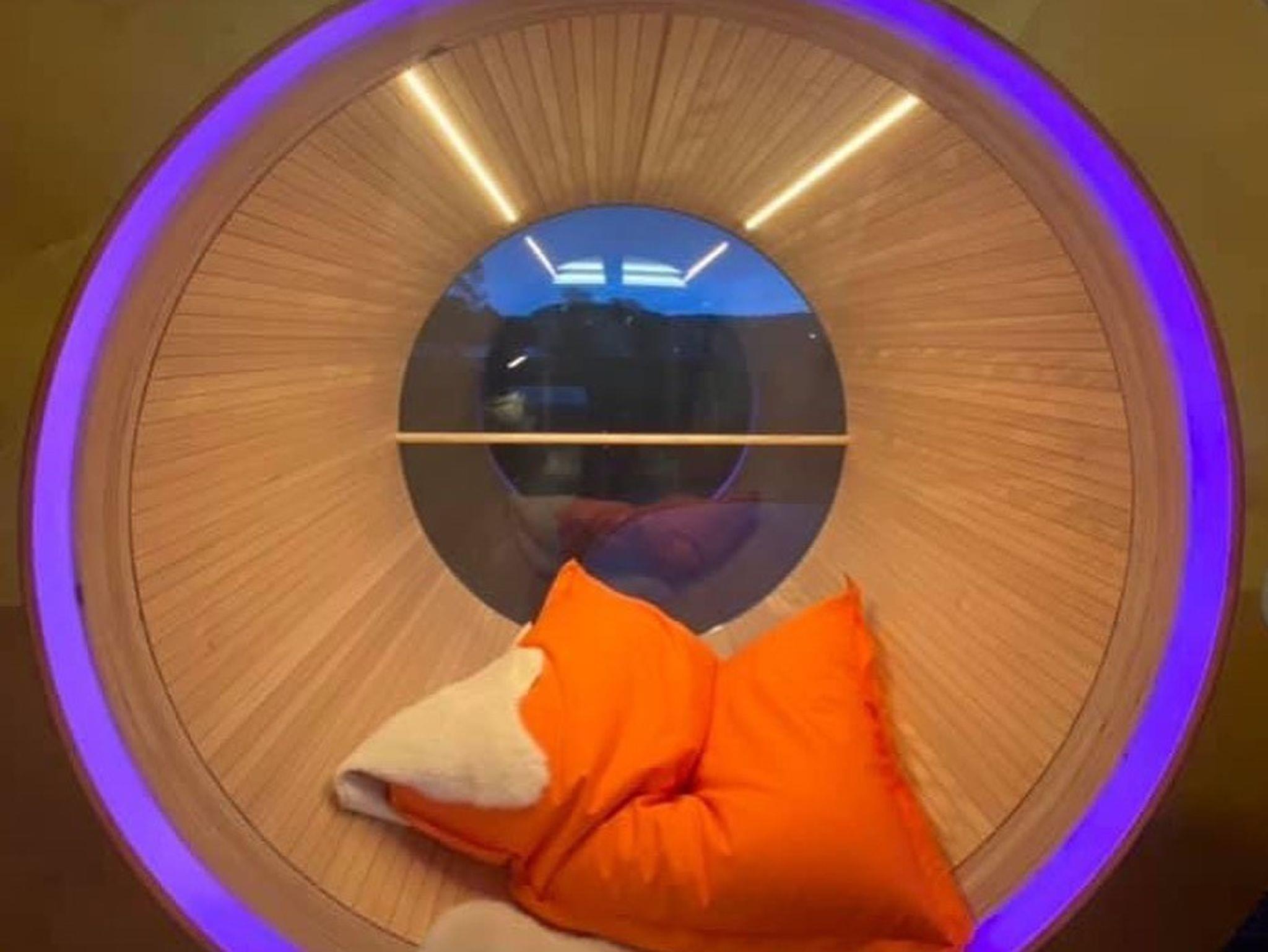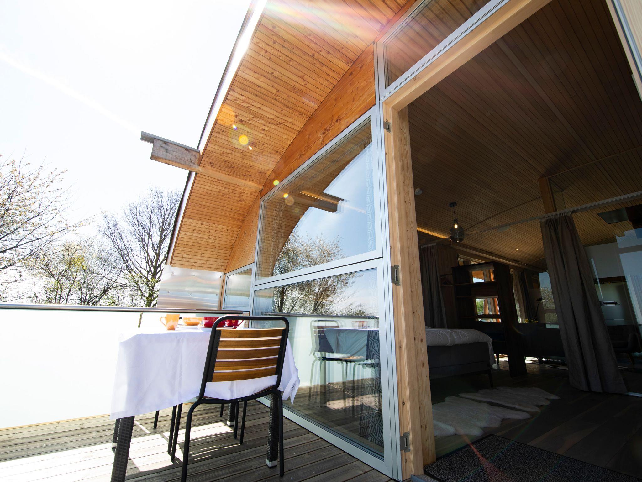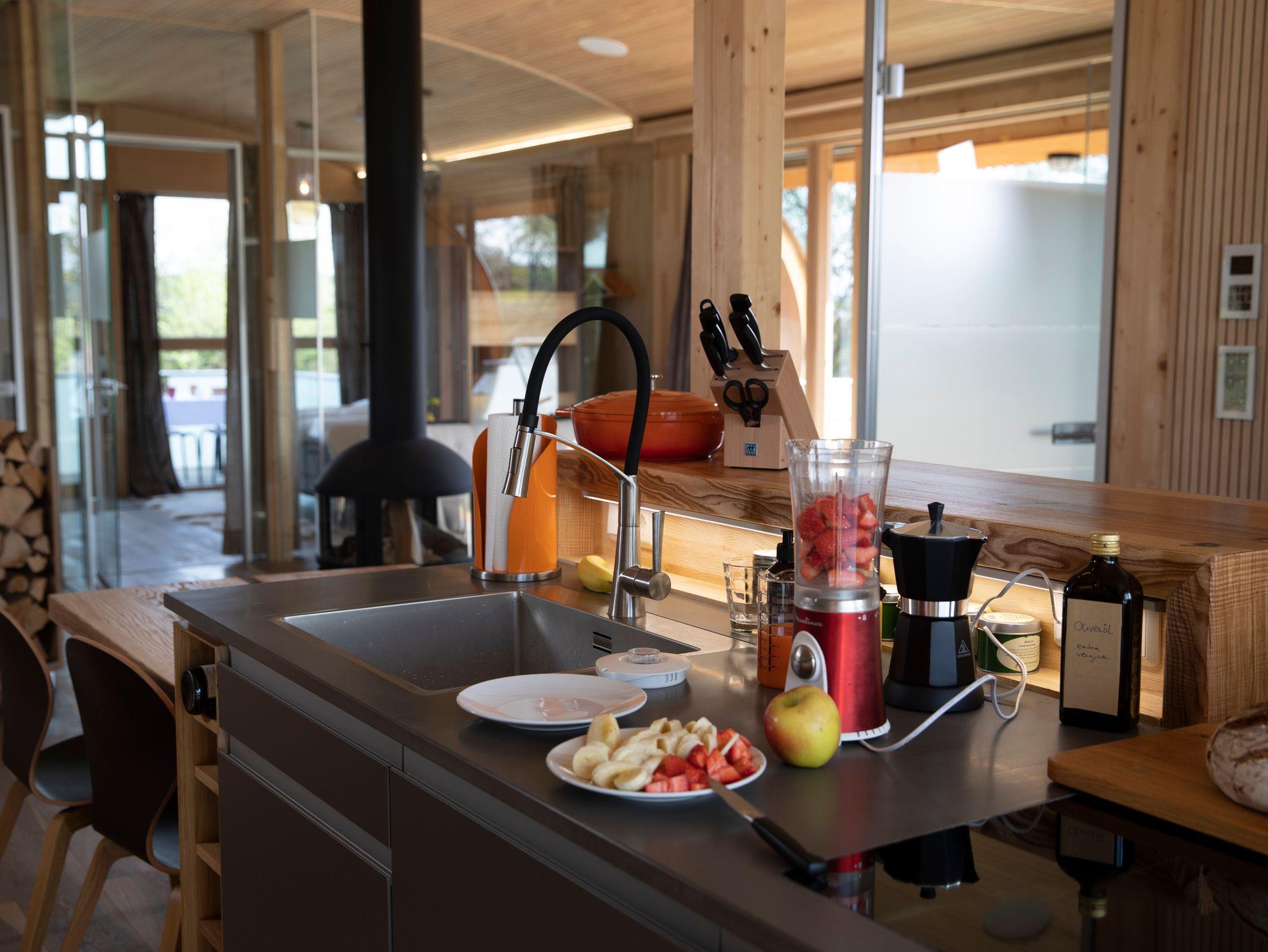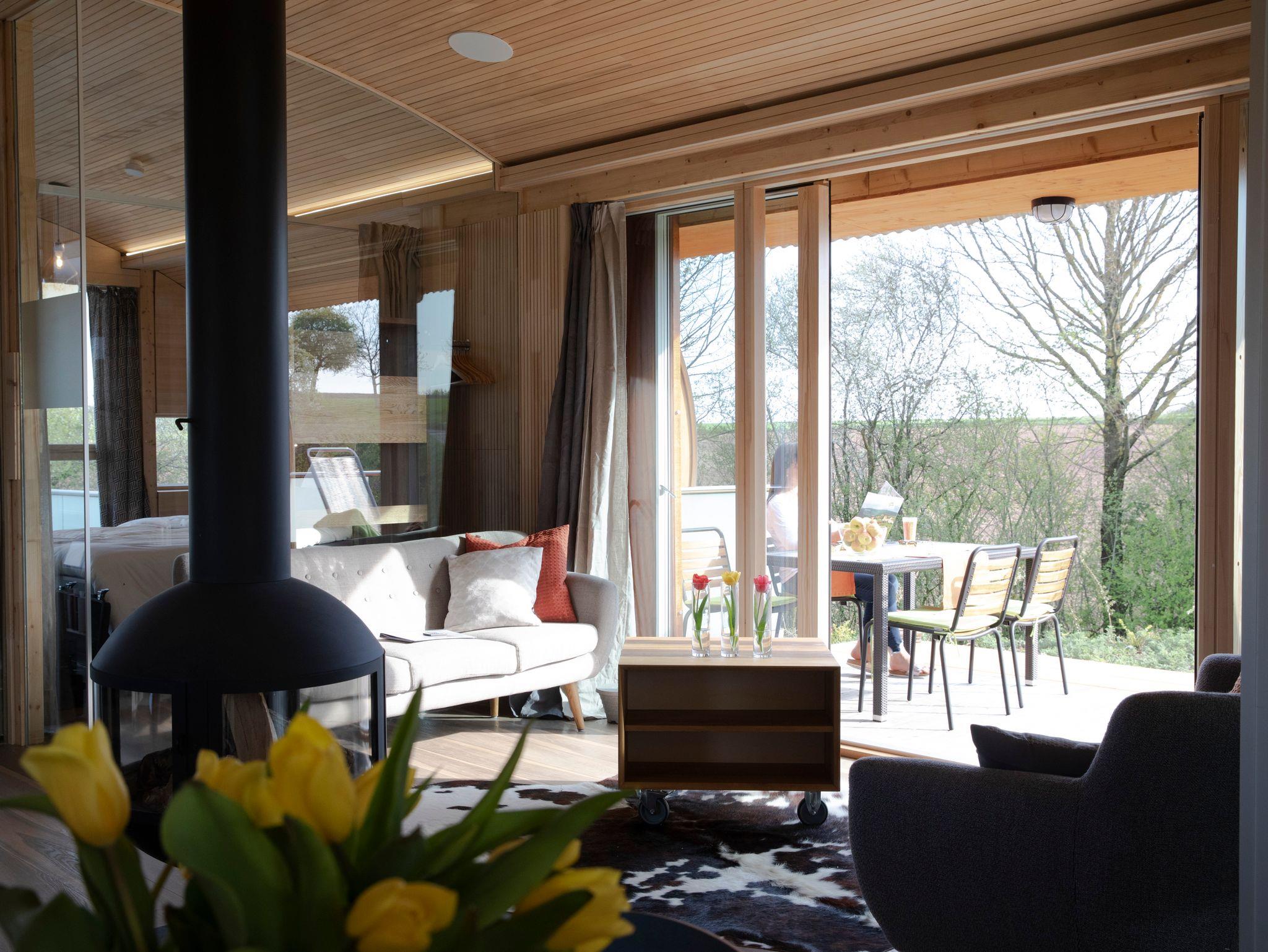Im UFO47 erwartet Dich ein luftig, helles Wohngefühl. Den zentralen Blickfang bildet der Focus-Hängekamin, kinderleicht zu befeuern und wärmender Mittelpunkt zur Kuschelzeit. Die beiden Schlafzimmer sind zum Wohnraum hin nur mit Glas getrennt, eines der Schlafzimmer hat ein Smart-TV-Gerät. Wer frühmorgens nicht von den ersten Sonnenstrahlen an der Nase gekitzelt werden will, verdunkelt die Bettnische in der heimeligen,runden Bettnische mit Vorhängen. Ausblicke hat man im UFO47 nach allen vier Himmelsrichtungen, auf einem der drei Balkone kann man immer ein sonniges oder schattiges Plätzchen finden. Das große Wellness-Bad verwöhnt mit einer Infrarot-Liege und besonderen Einrichtungsideen vom Schreiner-Designer! Auch die passgenau konzipierte Küche lässt keine Wünsche offen, und dann ist da noch der ganz besondere Chillingplace im Bullauge mit Blick auf den Schwimmteich.... einfach galaktisch!