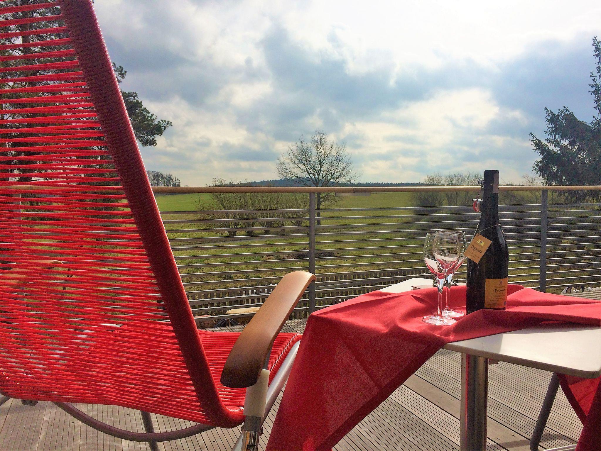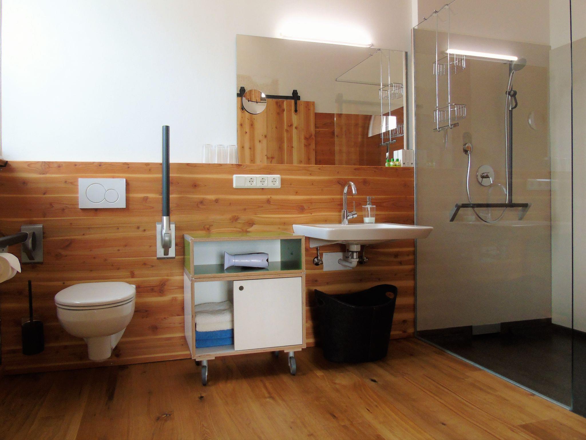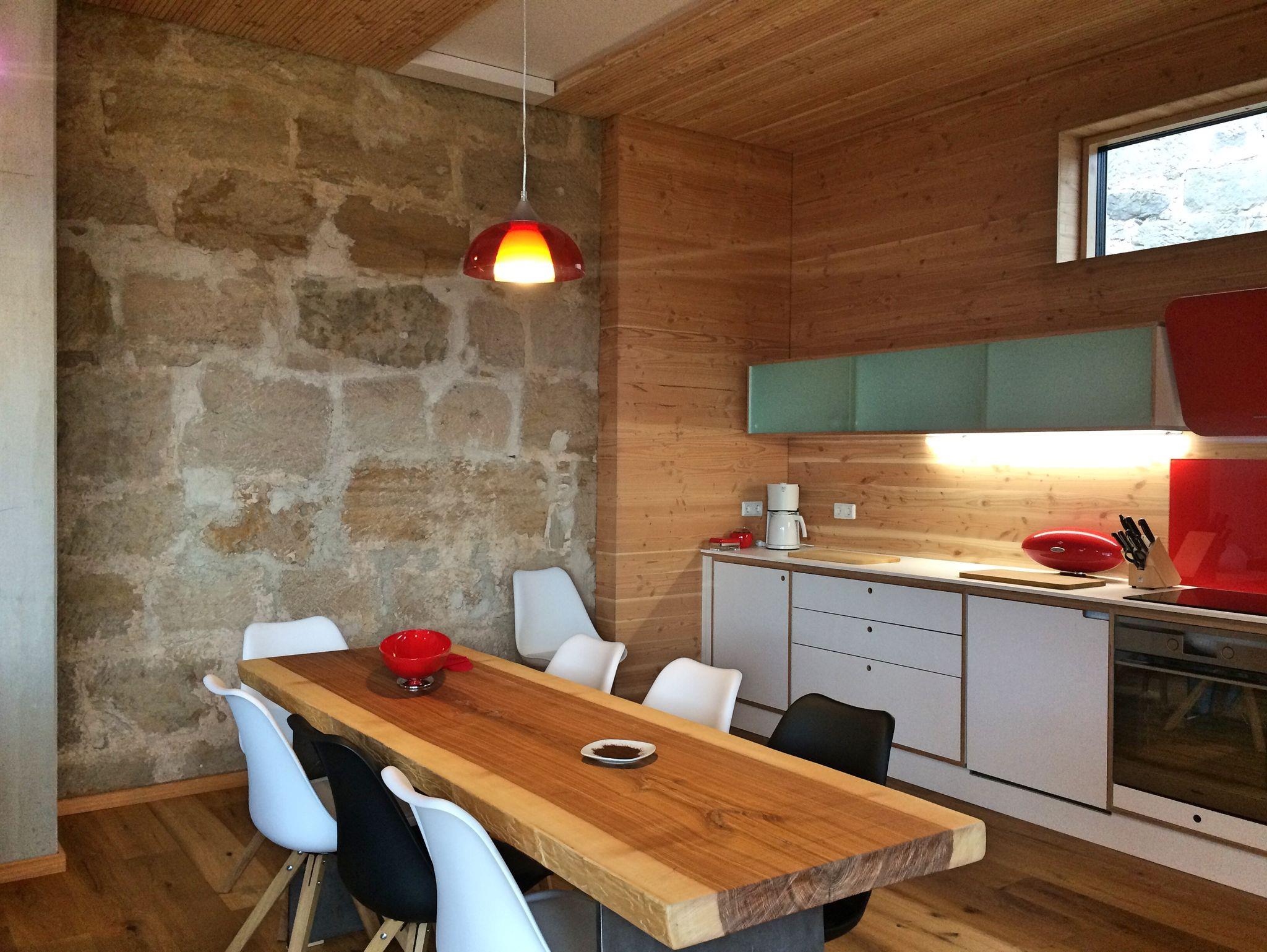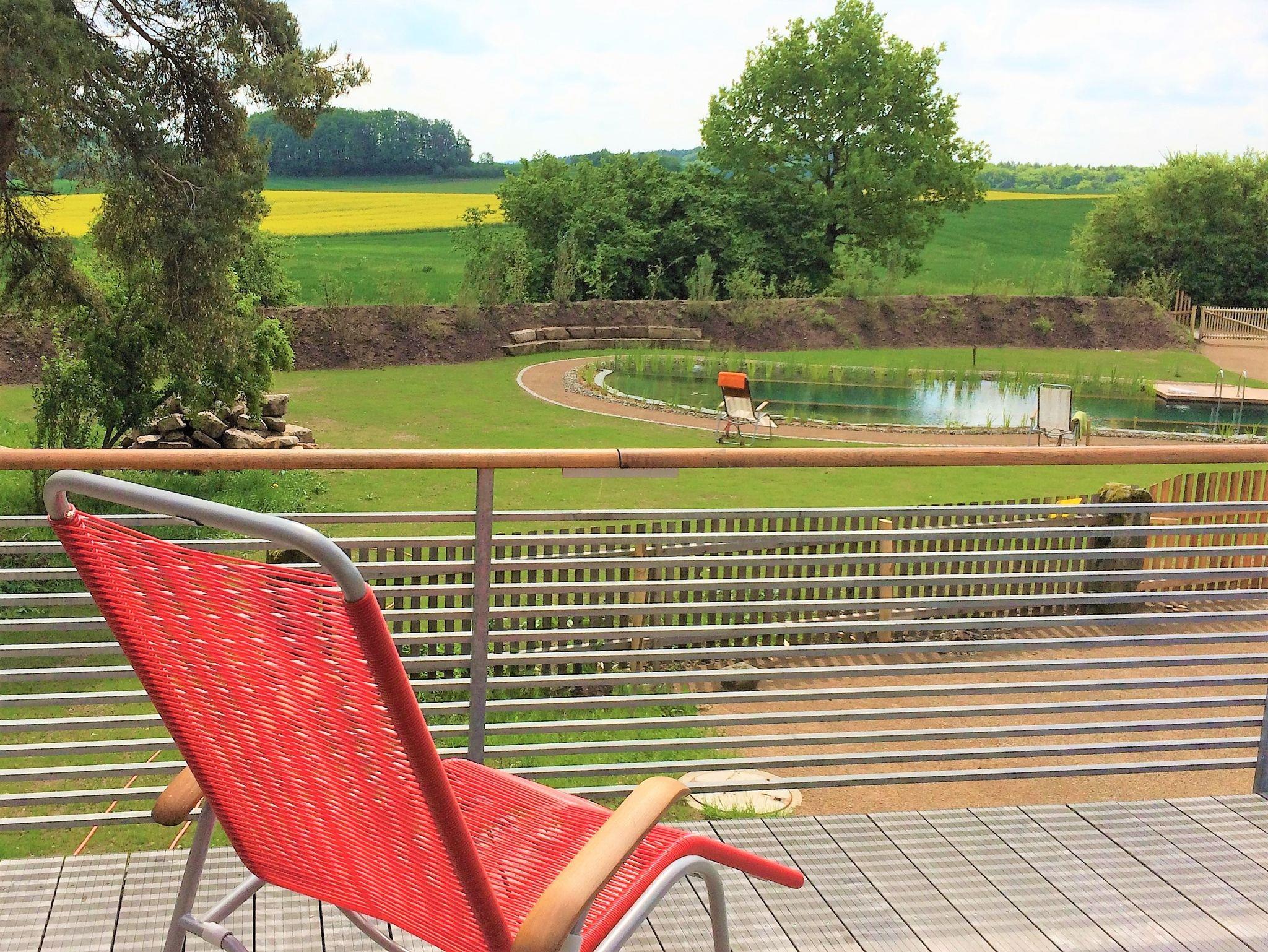 Hell und stylisch, im sympathischen Mix mit originalen Bauelementen, präsentiert sich die Top-Ferienwohnung im Brauhaus auf 82 qm Wohnfläche und mit mehr als 42 qm Hochterrasse und eigenem Whirlpool. Komplett Made in Germany von der eigenen Schreinerei ausgestattet. Freier Blick auf Garten mit Schwimmteich und Sauna, auf Wiesen, Felder, Wälder. Eigener Eingang, seniorenfreundlich, barrierefrei für Rollstuhlfahrer, Klimaanlage im Schlafzimmer.