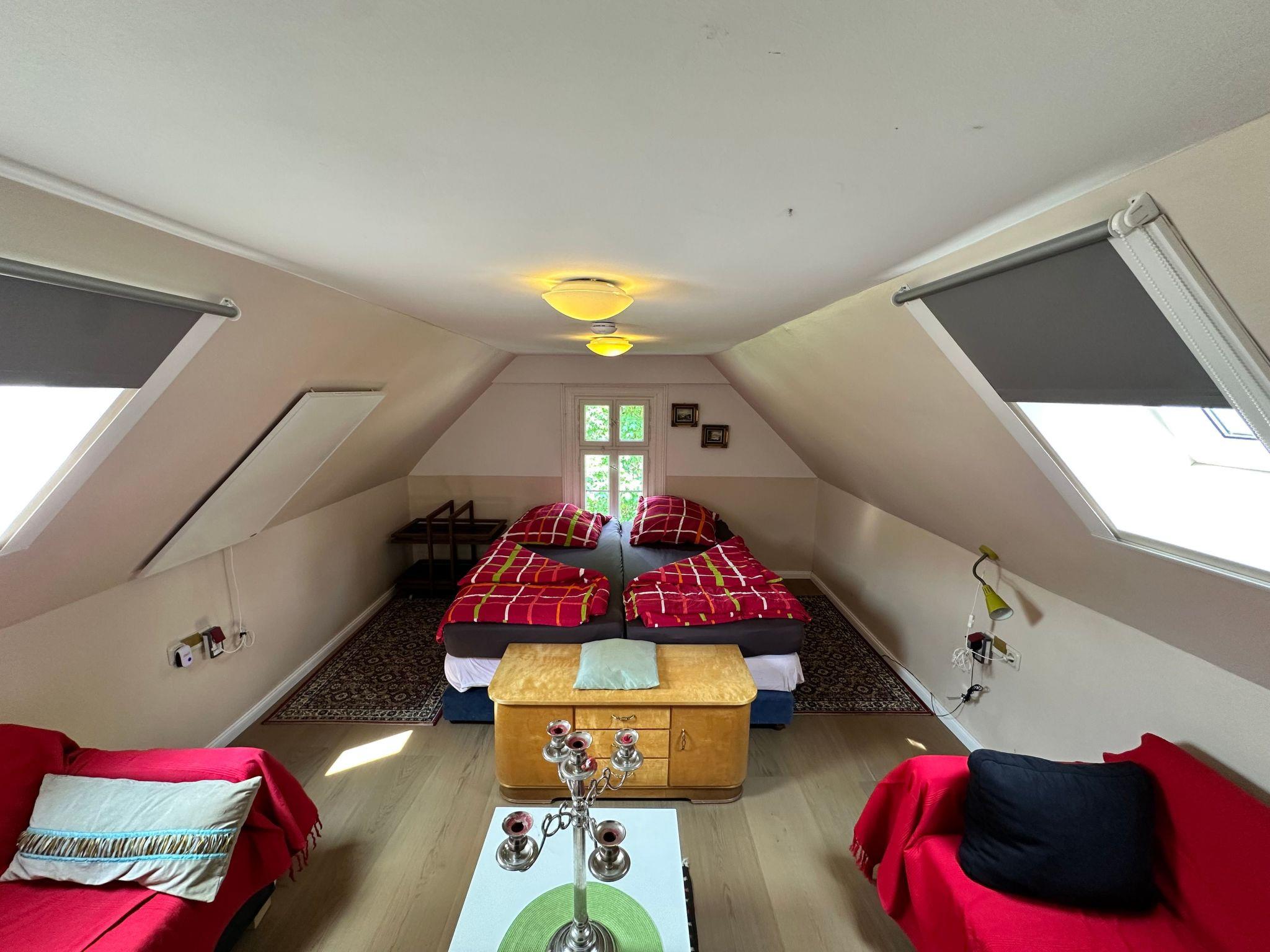 When was the last time you spent the night in a historic railway station building? In our unique holiday flat in Paulinzella station with sauna, you can feel at home and spend an unforgettable holiday. Our accommodation can accommodate up to nine people and is ideal for hikers, tour groups or professional bookers (construction workers). It has two cosy bedrooms, a modern bathroom with shower, a hallway and a spacious living room with kitchen. The kitchen is equipped with everything you need for a delicious meal: a cooker with four induction hobs, a fridge with freezer compartment, a microwave, a kettle, a coffee machine, a toaster, plenty of crockery and cutlery and a mini oven for baking bread rolls. The extendable dining table seats up to nine people.