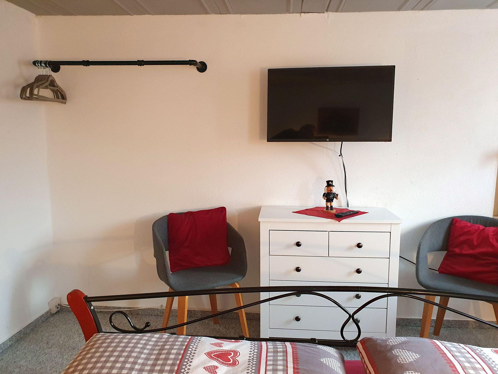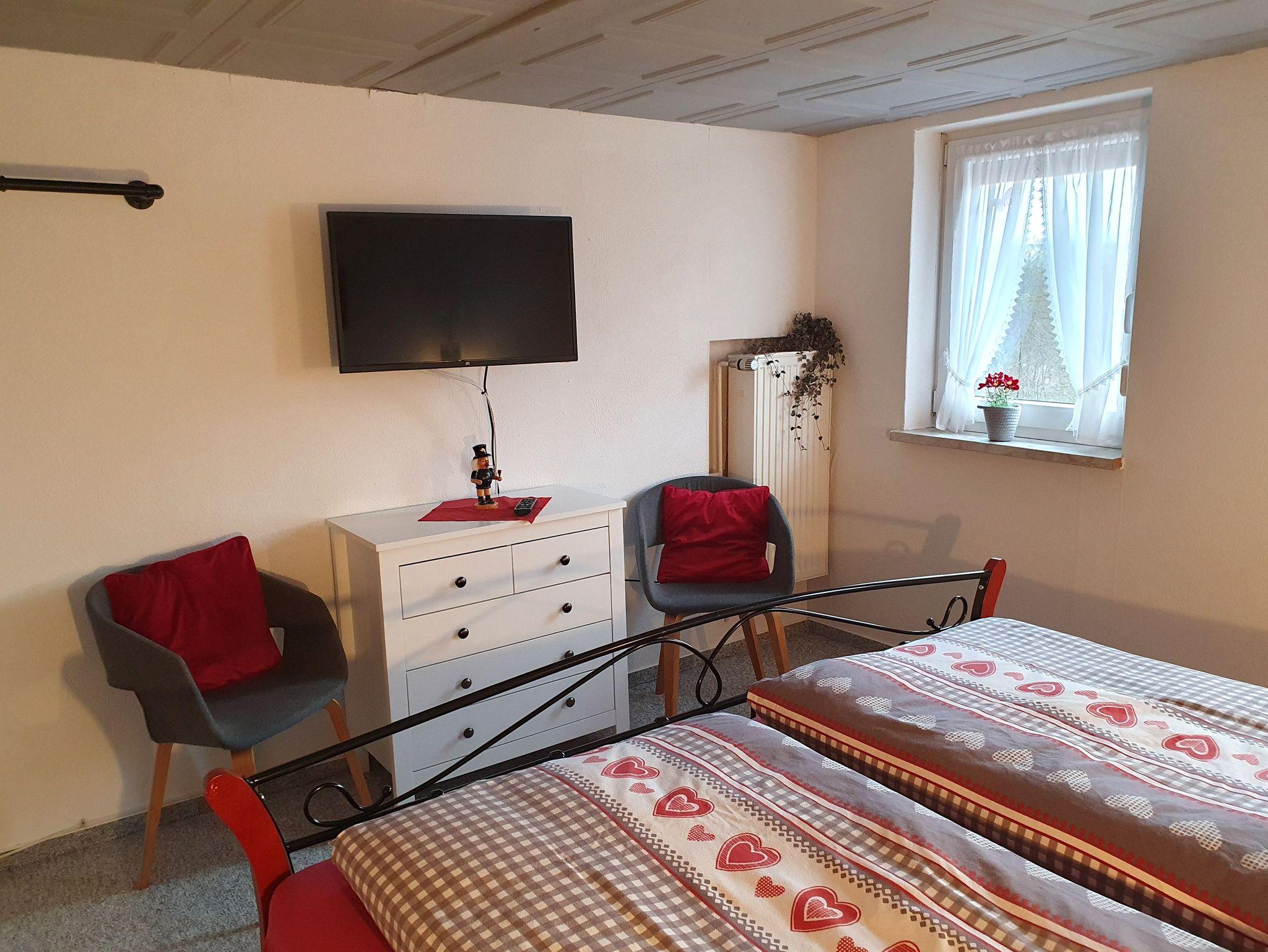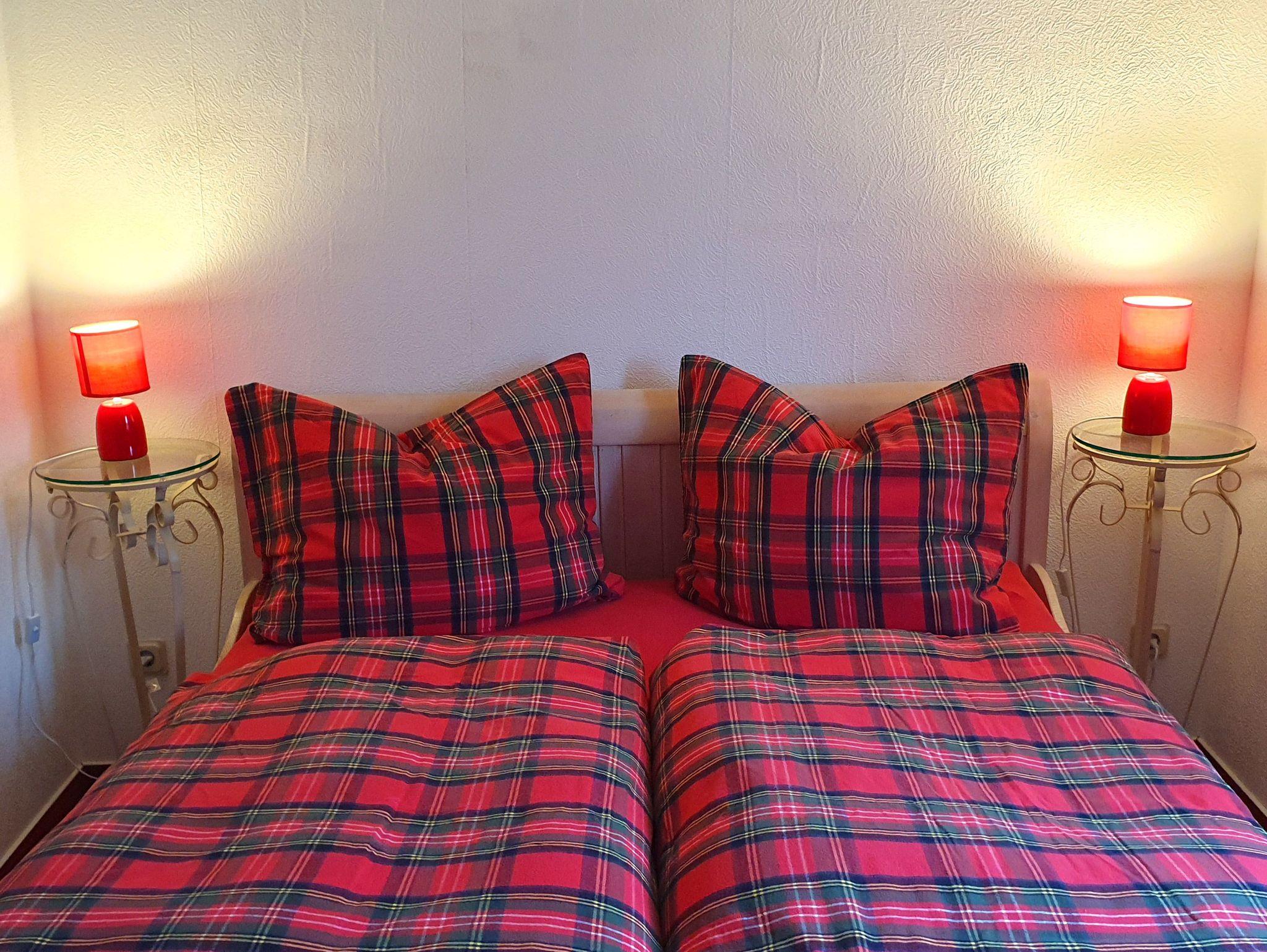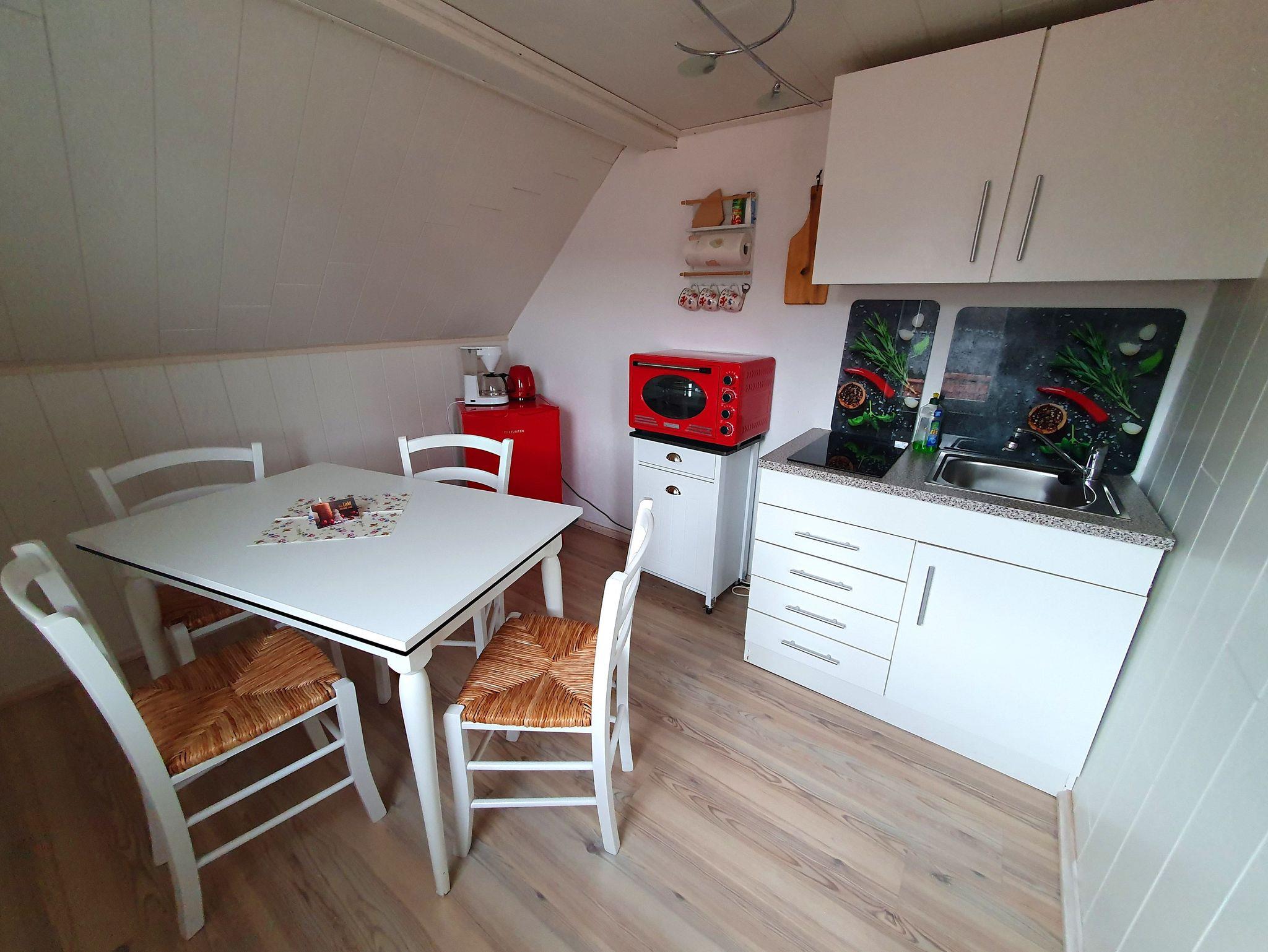 Zur Ausstattung gehören eine kleine Küche mit einem Tisch und vier Stühlen, ein 2-Platten-Ceranfeld und einem kleinen separaten Backofen, sowie zwei Schlafzimmer. Diese bieten Platz für 1 - 4 Personen. In den Schlafzimmern befinden sich jeweils ein Doppelbett (1,80 x 2,00 m) mit Fußende, eine Kleiderstange, eine Kommode und zwei Stühle, sowie ein Flat-TV an der Wand. Zusätzliche Kissen zur Auswahl bieten Ihnen einen besonderen Schlafkomfort.