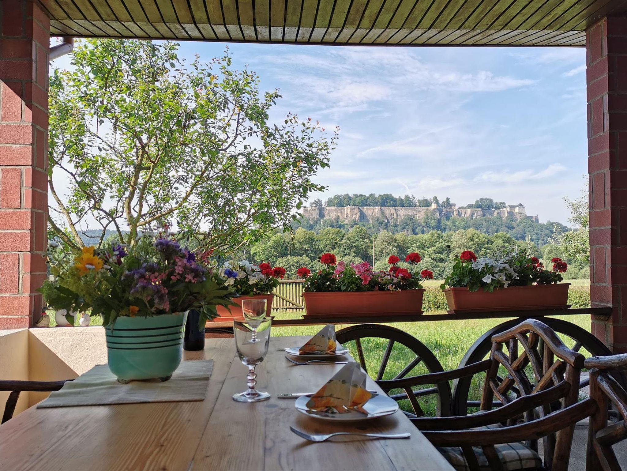 Eine großzügige Terasse (Südseite) mit unverbautem Blick auf die Festung Königstein lädt zum Verweilen ein.