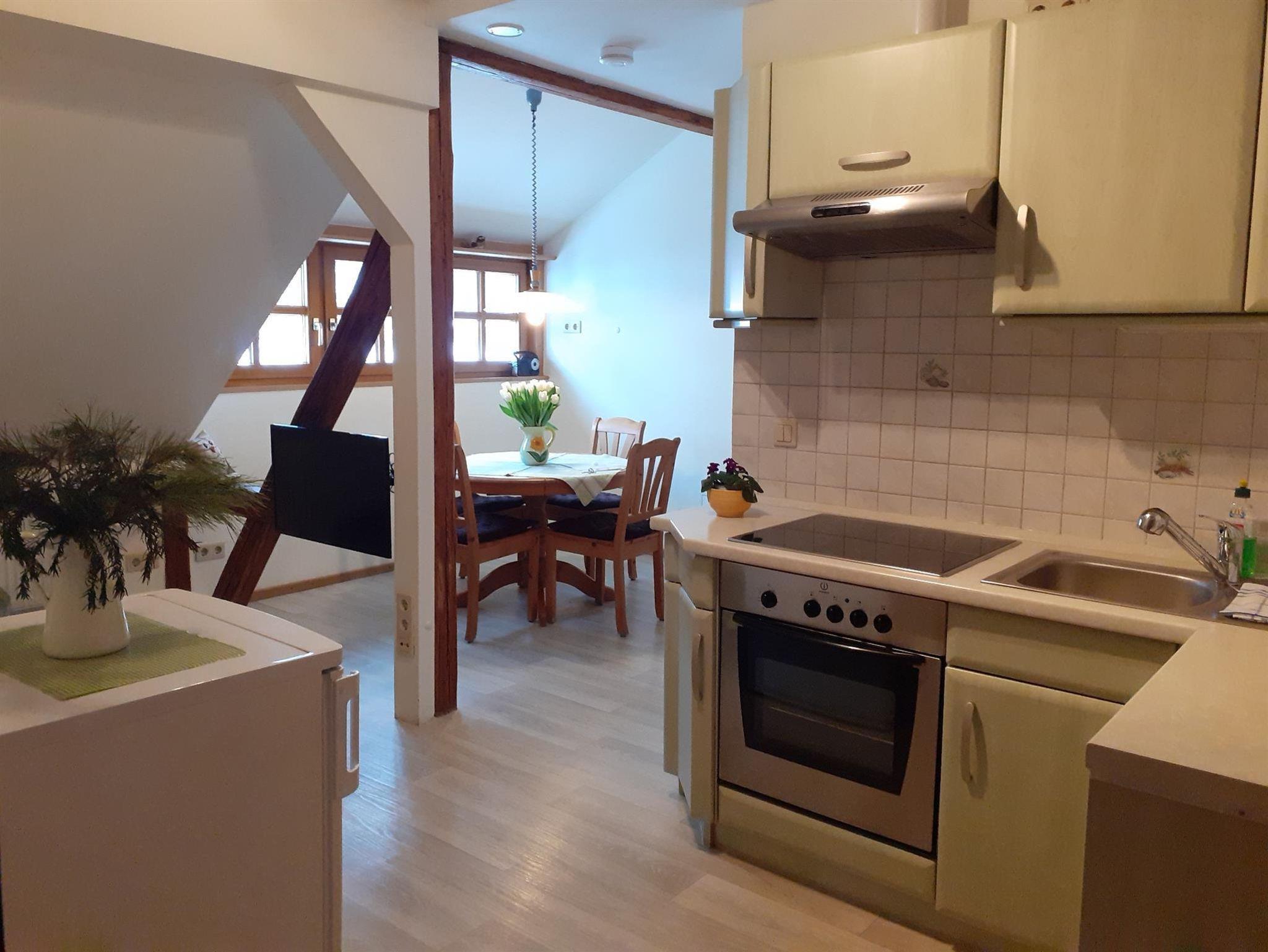 Diese Ferienwohnung ist mit ihren alten Holzbalken, Mansarden und ihrer ganz individuellen Gestaltung etwas für Genießer und Romantiker. Vom Frühstückstisch aus beobachten Sie den Sonnenaufgang über dem Lilienstein, vom Bett aus sehen Sie die angestrahlte Festung Königstein. Die Wohnung verfügt über zwei separate Schlafräume sowie eine urgemütliche Wohnküche mit Essplatz und Fernsehecke. Die Küchenzeile ist mit einem Herd mit 4 Cerankochfeldern u. Backofen, Kühlschrank, Kaffeemaschine, Wasserkocher und Toaster ausgestattet. Das Bad verfügt über Dusche und WC.