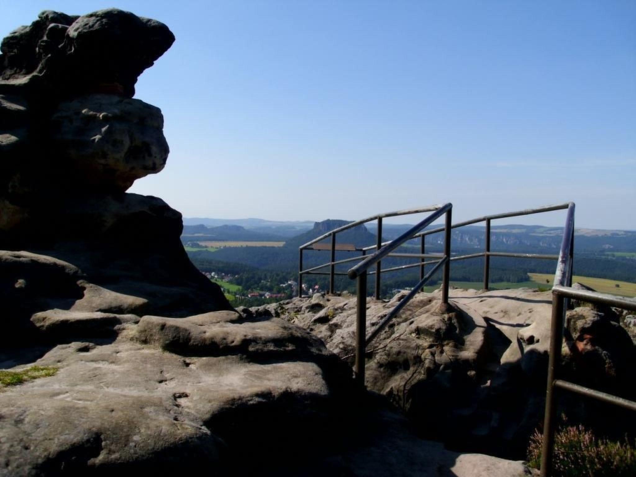 The most striking table mountain in Saxon Switzerland, located near Königstein and Waltersdorf, rises 300 metres above the Elbe valley and offers fantastic views. Ascent via the 110-metre-high foot slope and a 70-metre-high set of steps to a heavily disintegrated summit plateau, which reveals the remains of a 14th century castle complex. The Lilienstein is a control point for the "Eisenach-Budapest International Mountain Hiking Trail".