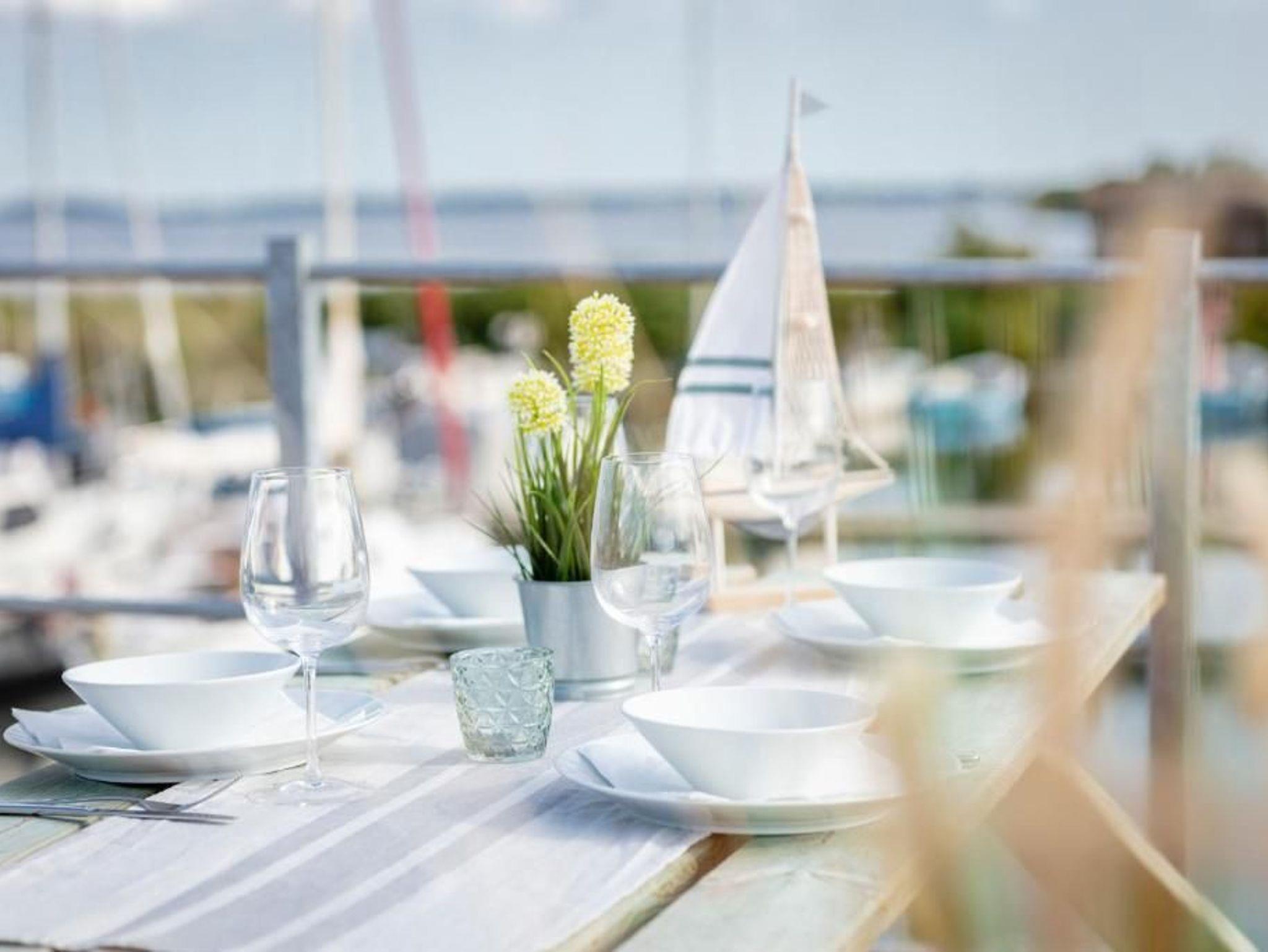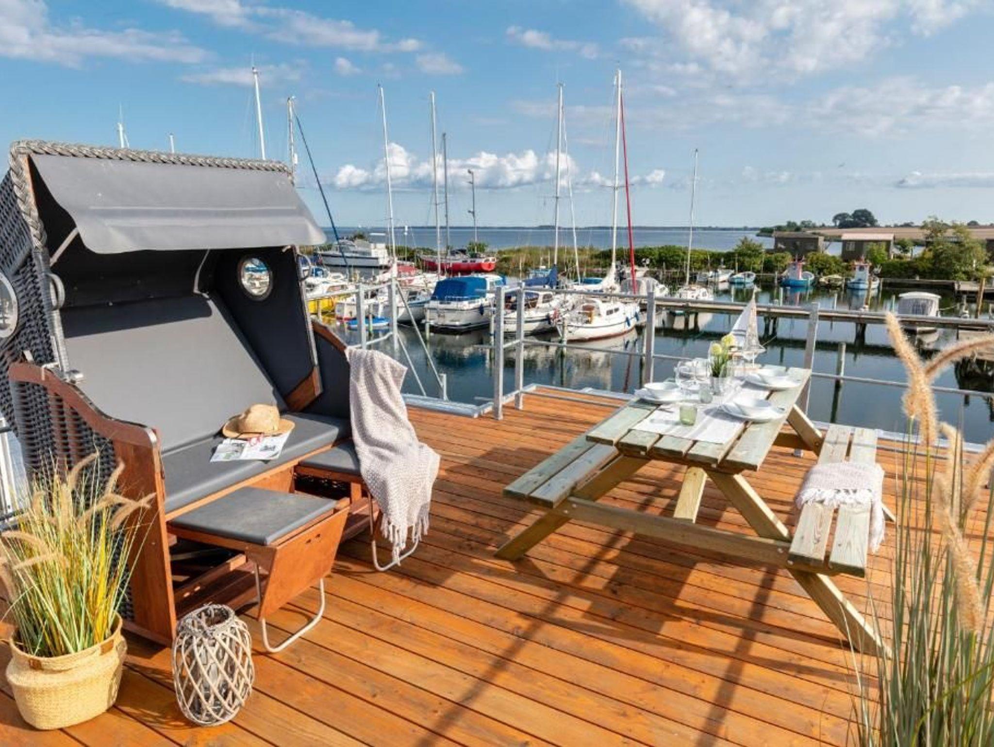 Auf dem großzügigen Oberdeck hat man einen atemberaubenden Rundumblick auf die Schlei, den Hafen und den Dom der Stadt Schleswig. Lassen Sie sich morgens von der Sonne wecken und beginnen Sie hier den Tag mit einem Frühstück an dem gemütlichen Tisch mit Sitzbänken aus Holz, und lassen mit Blick aufs Wasser die Seele baumeln. Auf der unteren überdachten Terrasse genießen Sie auf einer der beiden Sonnenliegen in vorderster Reihe ganz exklusiv das maritime Flair mit einem Sundowner. Schöner kann der Tag nicht beginnen und mit einem romantischen Sonnenuntergang direkt auf dem Wasser nicht schöner enden.