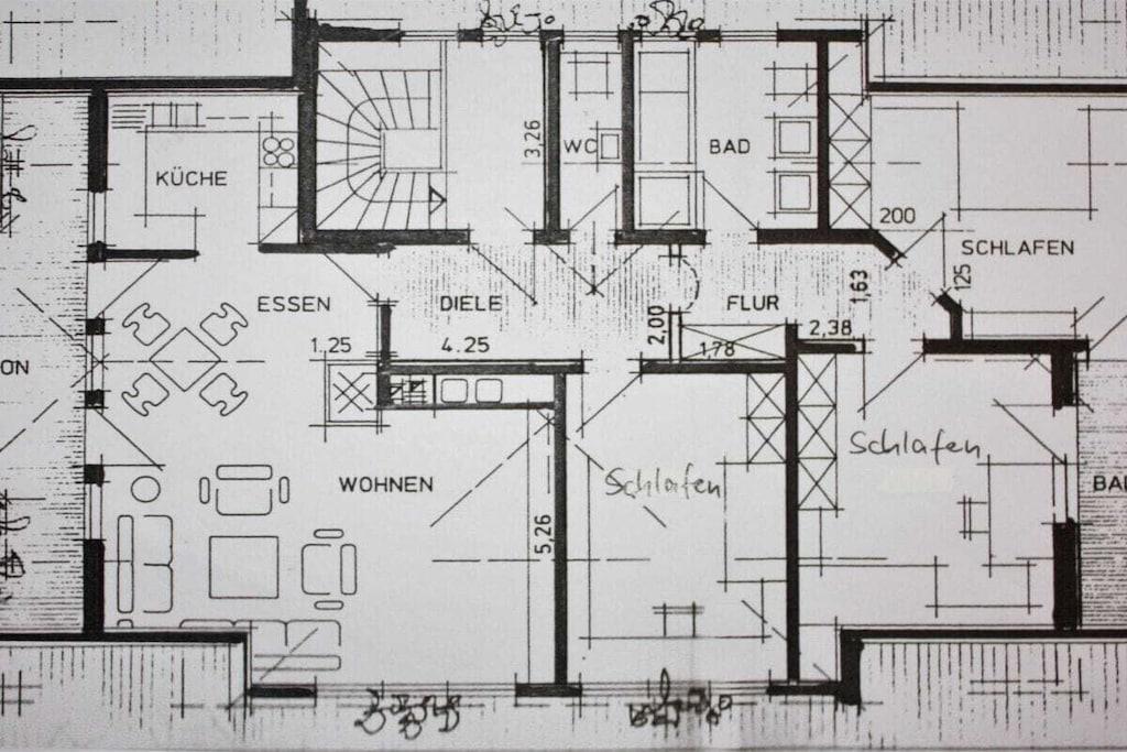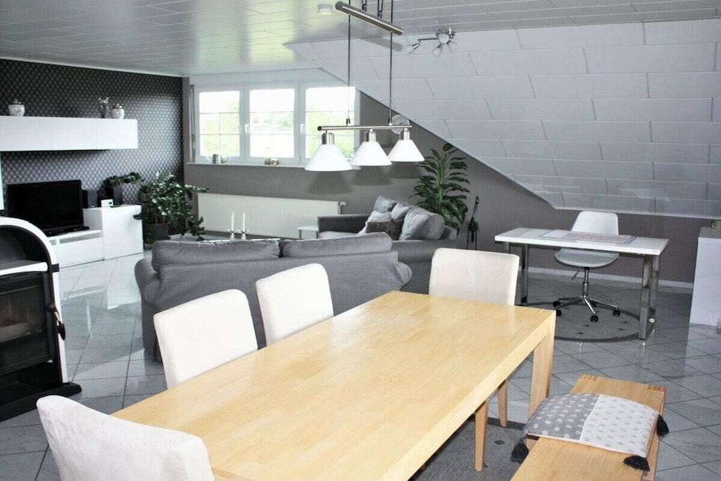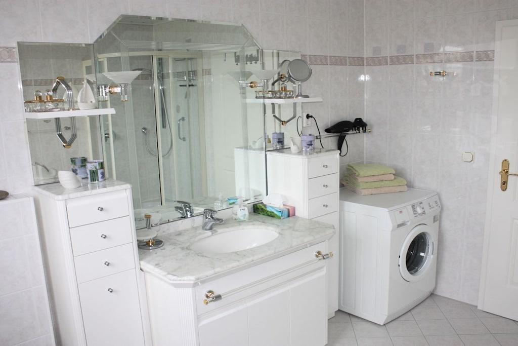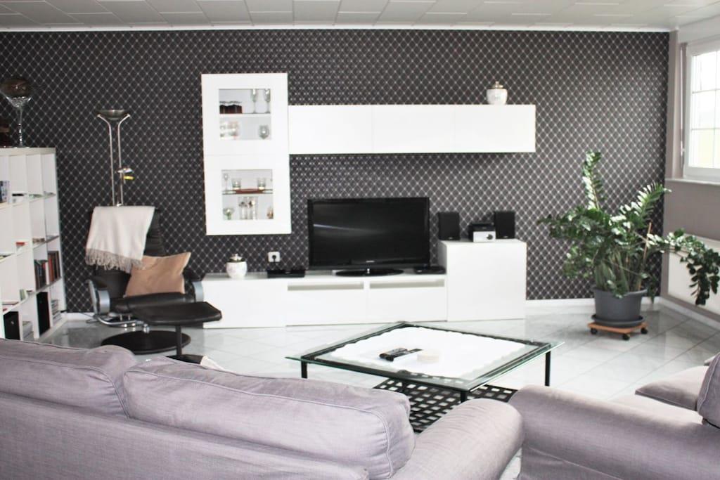 Lejligheden har tre store soveværelser, et fuldt udstyret køkken (mikrobølgeovn, opvaskemaskine, elektrisk komfur, køleskab og fryser osv.) med en tilstødende stue/spisestue (læsehjørne, skrivebord), en brændeovn til supplerende opvarmning, et stort badeværelse med bruser, hjørnebadekar, vaskemaskine og et ekstra toilet. Lejligheden har to fladskærms-tv'er med satellitmodtagelse, en Blu-ray-afspiller, et stereoanlæg og Wi-Fi-internetadgang. De mange vinduer gør lejligheden lys, luftig og indbydende. Det er en ikke-ryger lejlighed, men rygning er tilladt på begge altaner. Et fitnessrum (crosstrainer, løbebånd, motionscykel, stepper, mavetræner, professionel fitnessstation) i kælderen er til rådighed for gæsterne.