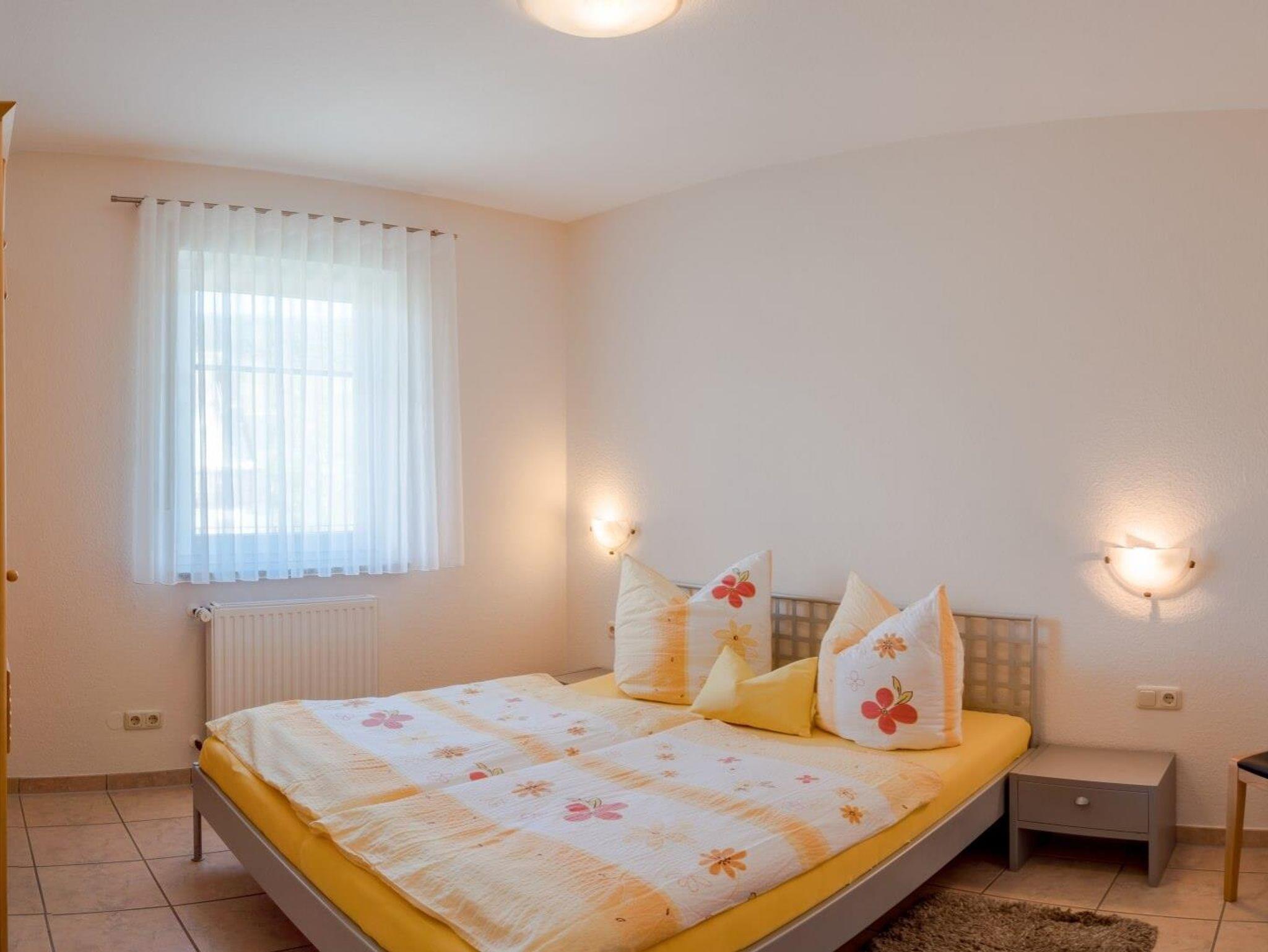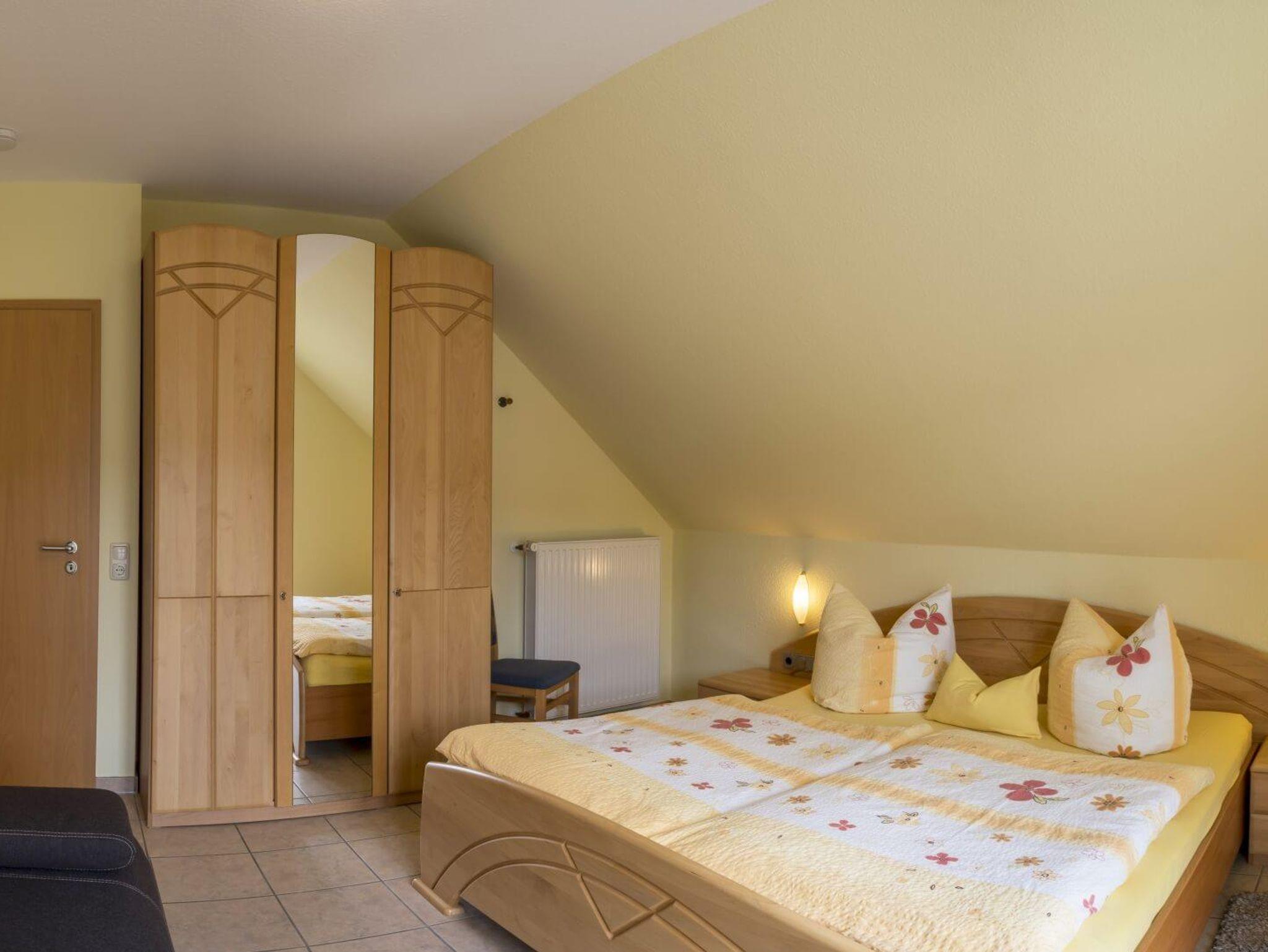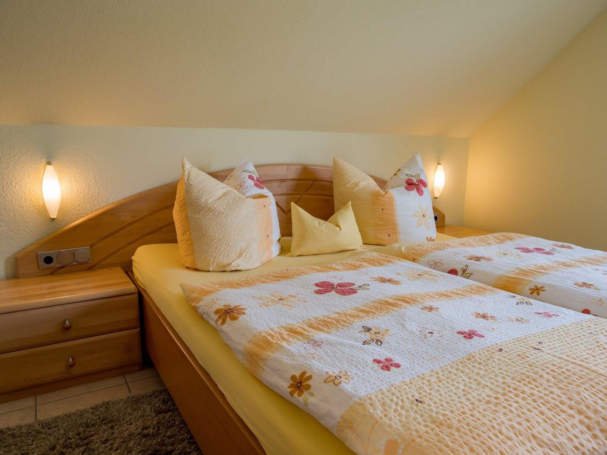 Ferienwohnung für 2-6 Personen, Wohn-Schlafraum mit abgetrennter Kochnische und Eckbankgruppe, 2 Schlafzimmer, SAT-TV, Balkon. Haustiere nur auf Anfrage, Aufpreis pro Tag 10 €.