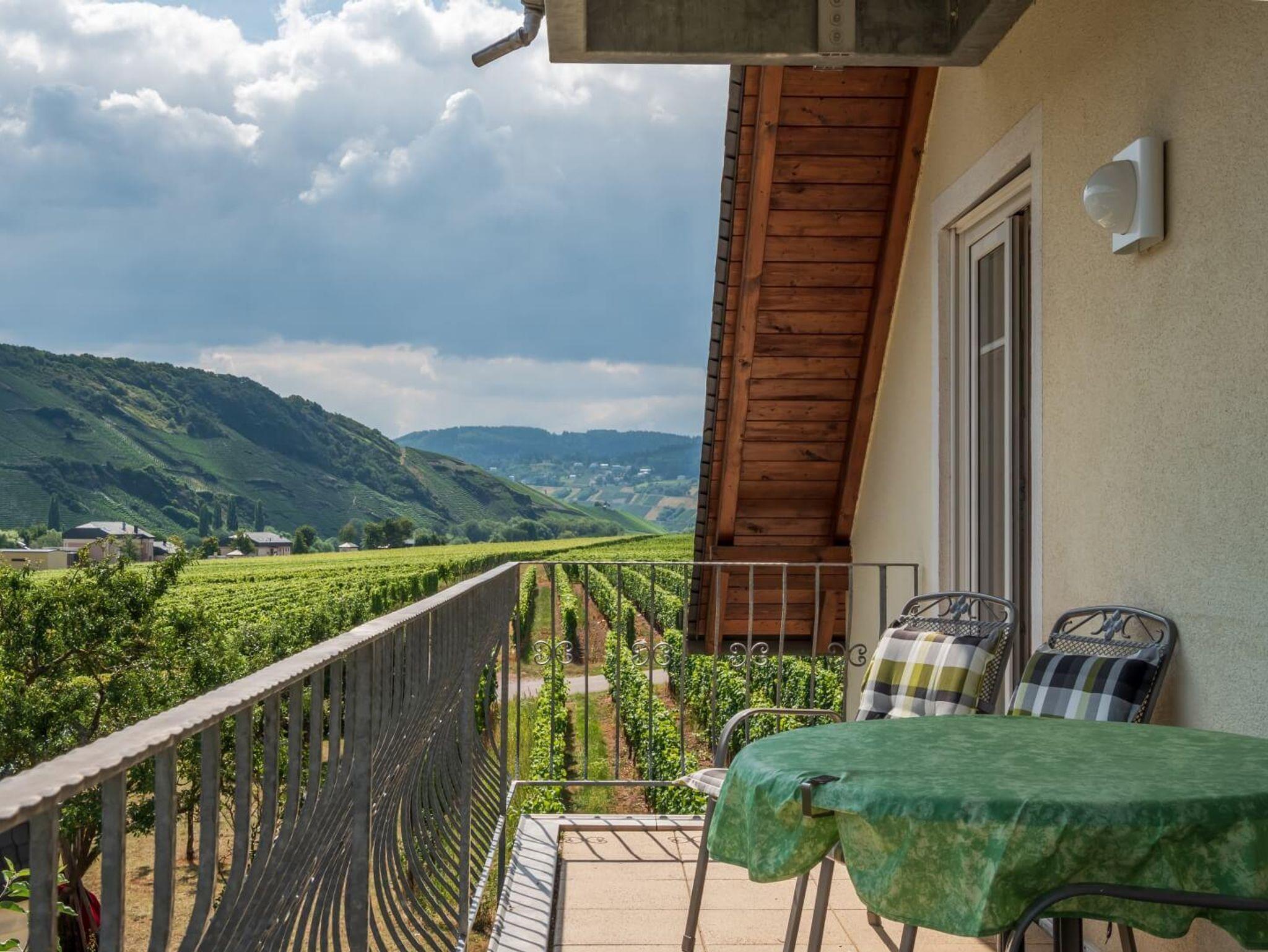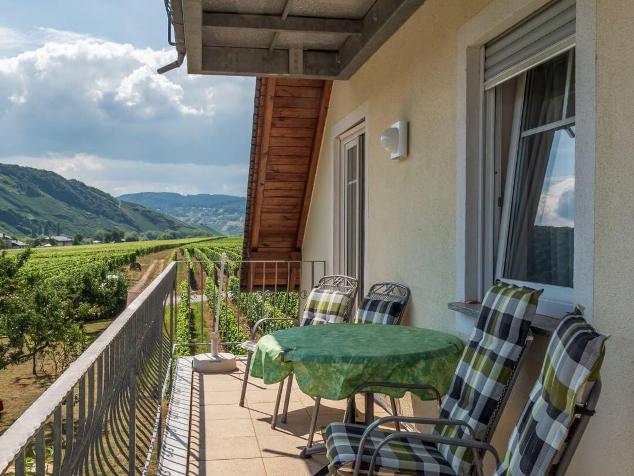 Neun komfortable, mit viel Liebe zum Detail eingerichtete Ferienwohnungen und ein gemütliches Weinstübchen zum geselligen Beisammensein, stehen auf unserem fämiliär geführten Ferienweingut für Sie bereit. Die Küchen in unseren Ferienwohnung sind komplett ausgestattet. Von unserem Haus bzw. Balkons haben Sie eine herrliche Aussicht auf das Moseltal. Für alle Gäste steht eine gemütliche Sitzecke im Freien, eine große Liegewiese, Kinderspielplatz und Parkplatz direkt am Haus zur Verfgügung. Jeden Morgen frische Brötchen vom Bäcker. Eine Betriebsbesichtigung unseres Weingutes mit Umtrunk in unserem gemütlichen Weinstübchen gehört zum Service unseres Hauses.