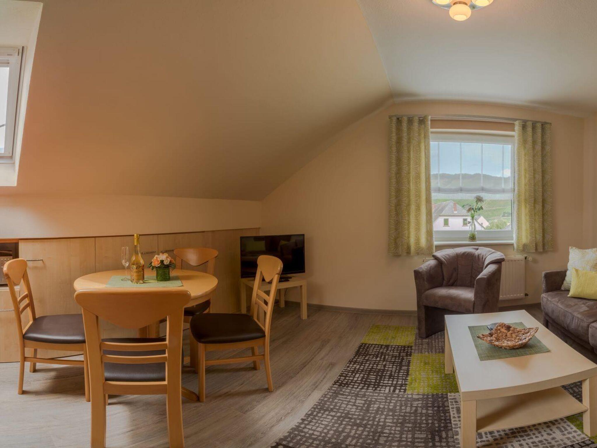 Neun komfortable, mit viel Liebe zum Detail eingerichtete Ferienwohnungen und ein gemütliches Weinstübchen zum geselligen Beisammensein, stehen auf unserem fämiliär geführten Ferienweingut für Sie bereit. Die Küchen in unseren Ferienwohnung sind komplett ausgestattet. Von unserem Haus bzw. Balkons haben Sie eine herrliche Aussicht auf das Moseltal. Für alle Gäste steht eine gemütliche Sitzecke im Freien, eine große Liegewiese, Kinderspielplatz und Parkplatz direkt am Haus zur Verfgügung. Jeden Morgen frische Brötchen vom Bäcker. Eine Betriebsbesichtigung unseres Weingutes mit Umtrunk in unserem gemütlichen Weinstübchen gehört zum Service unseres Hauses.