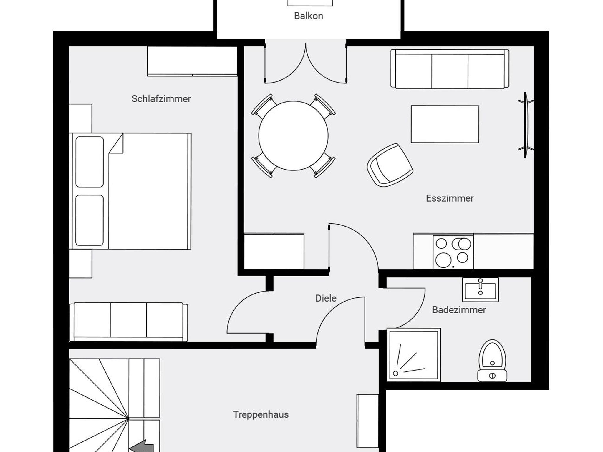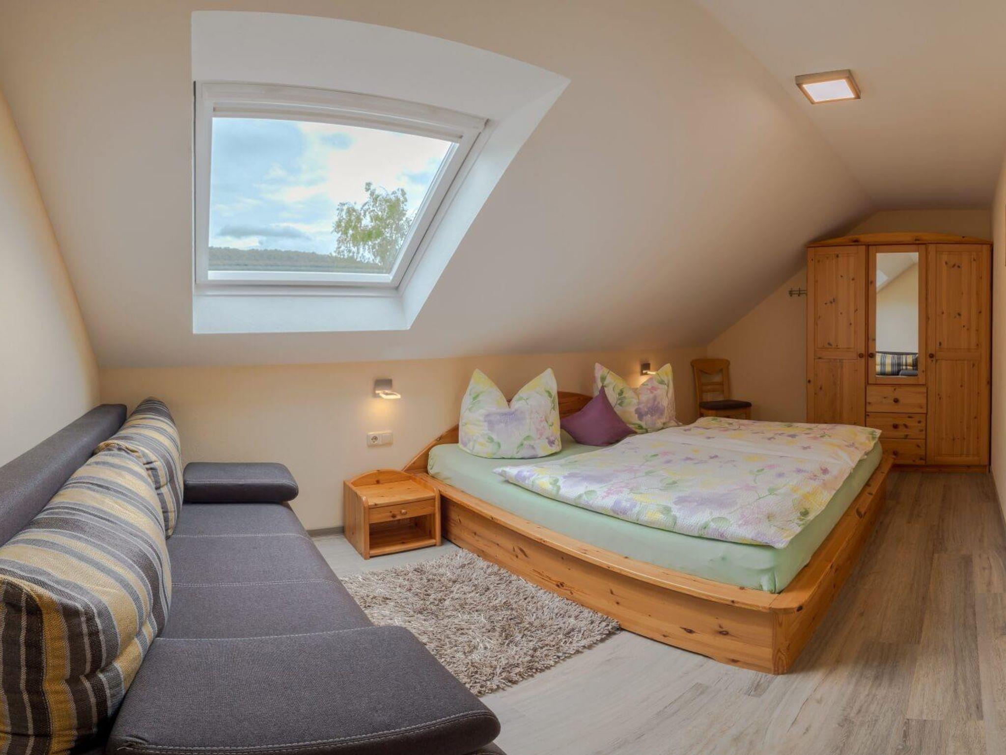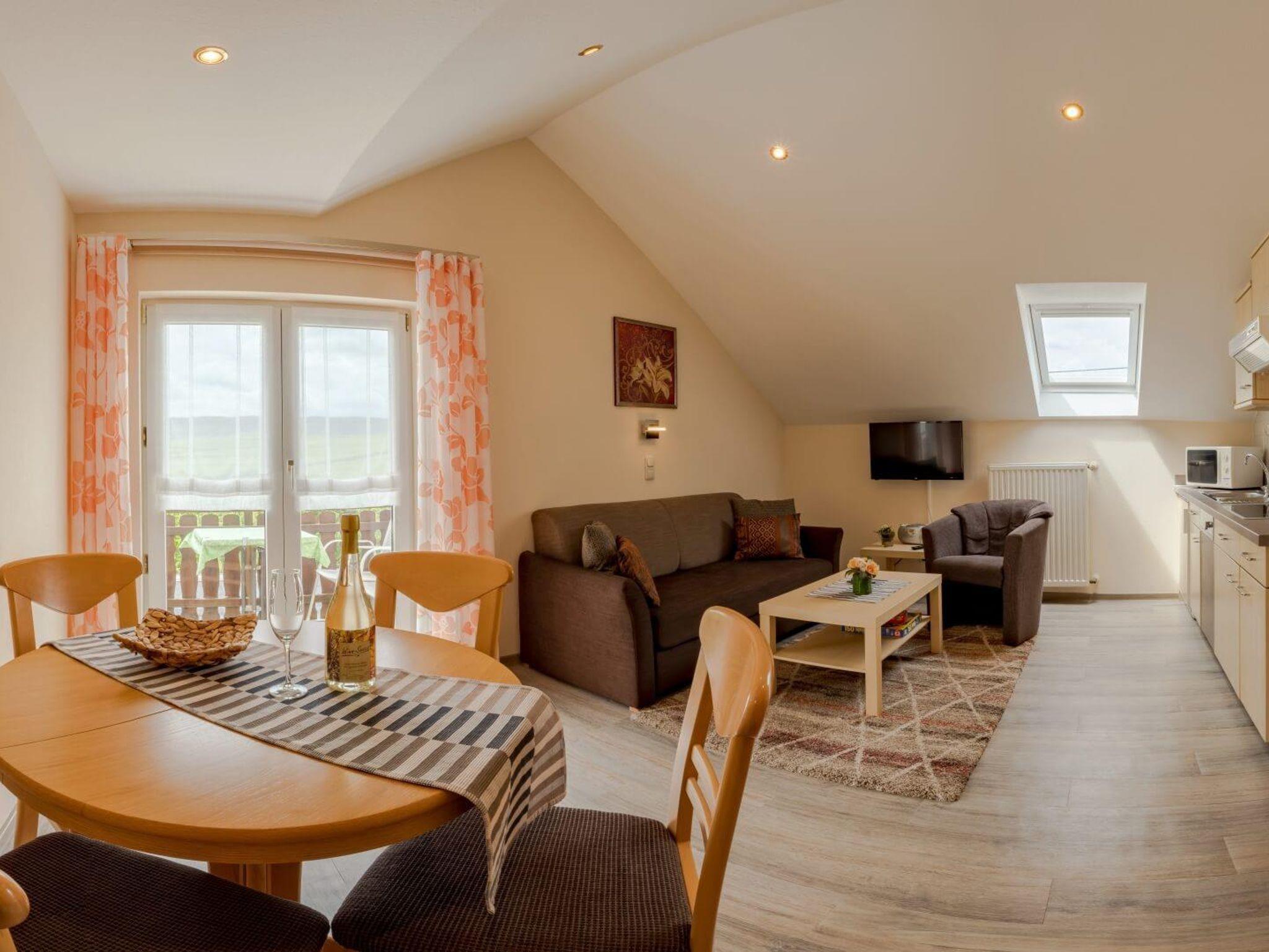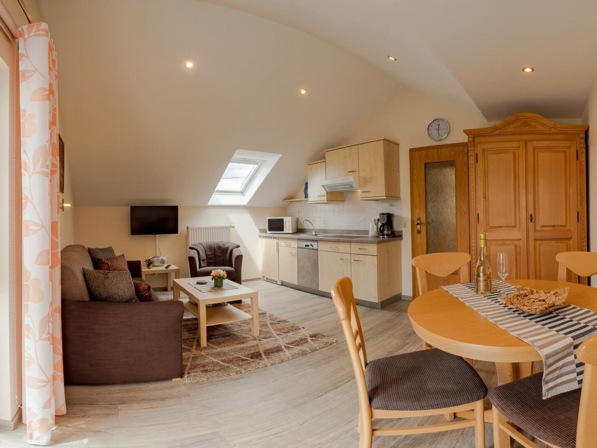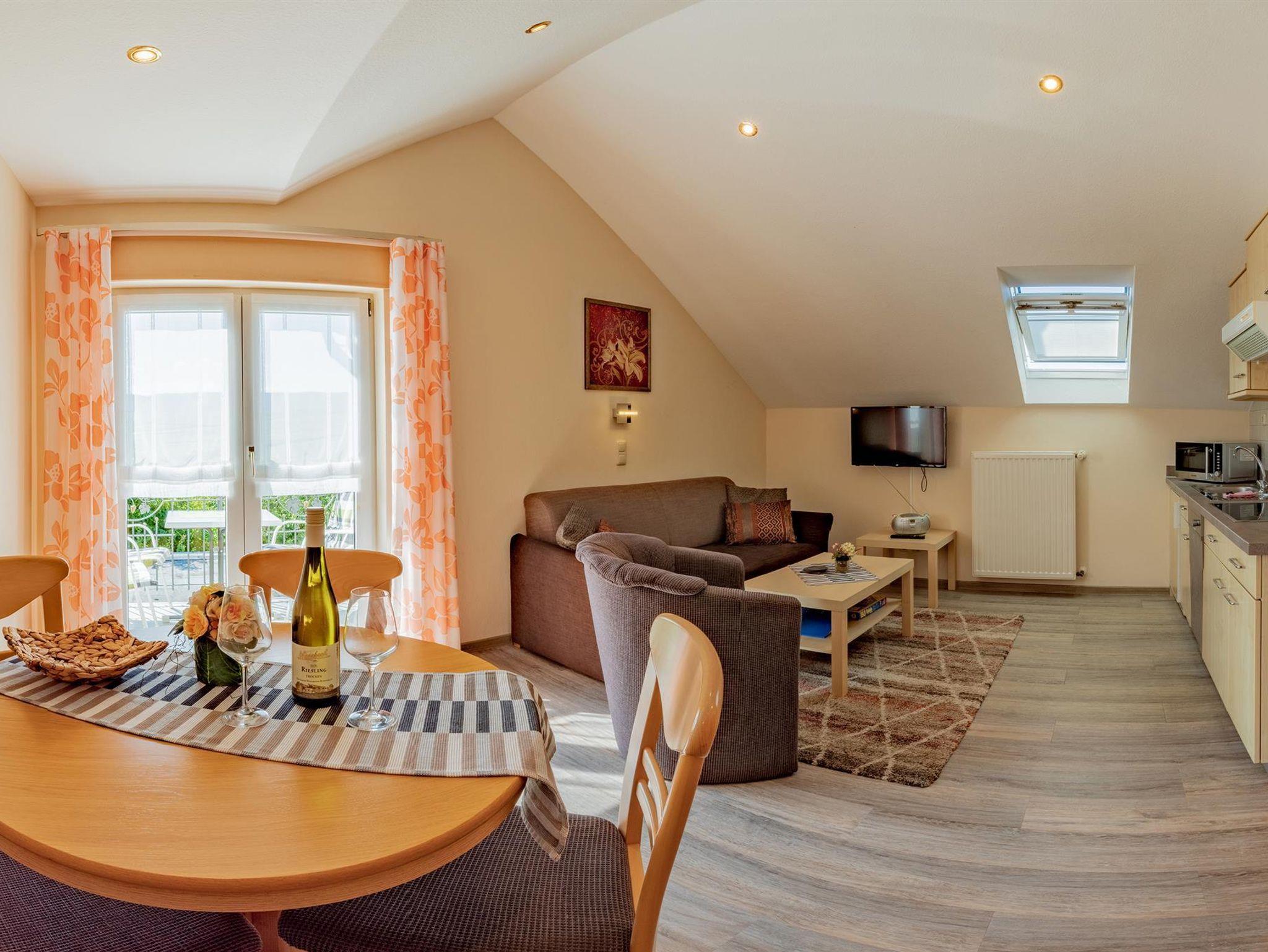 Ferienwohnung für 2-4 Personen. Wohn-Schlafraum mit Esstisch, Küche, Sitzgelegenheit für 4 Personen, SAT-TV, Stereo-Kompakt-Anlage, Bad mit Dusche/WC, Balkon. Haustiere nur auf Anfrage, Aufpreis pro Tag 10 €.