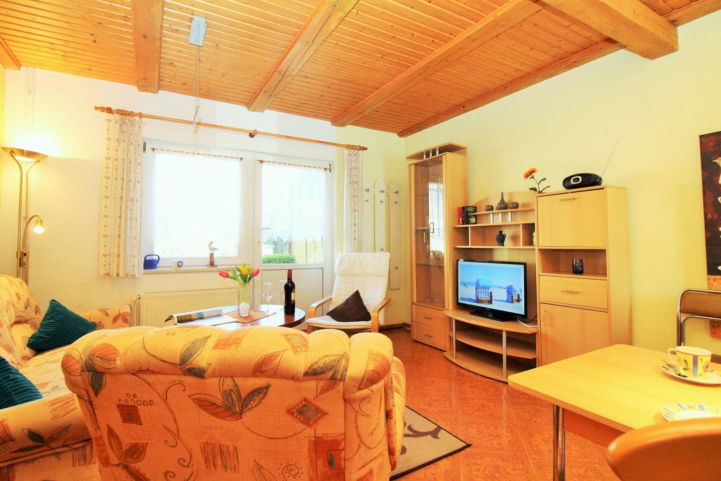 Das freundliche und gemütliche Wohn-/Esszimmer verfügt über eine separate Sitzgruppe mit bequemer Couch, 2 Sesseln und Couchtisch, einen separaten Esstisch mit Stühlen sowie eine Schrankwand. Vom Wohnzimmer aus haben Sie direkten Zugang zu der großen Terrasse mit Gartenmöbeln. Hier sitzen Sie entspannt und gemütlich im Grünen und können abends bei einem guten Glas Wein in Ruhe die lauen Sommernächte genießen!