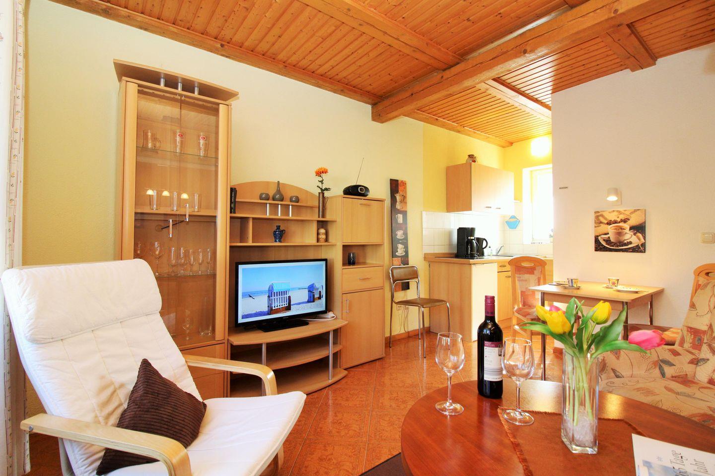 Die strandnahe und gemütliche 2-Zimmer-Wohnung (ca. 46 m²) im Erdgeschoss und 1. Obergeschoss (mit innen liegender Treppe) besitzt ein hohes Maß an Funktionalität und ist komplett eingerichtet. Der Bodenbelag im Schlafzimmer ist Holzlaminat, der Wohnbereich, die Küche und das Bad / WC sind gefliest.
